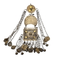 White metal ornament, likely from the Aurès or Kabylie regions of Algeria. Featuring a central filigree plaque and a crescentic (nawa) panel, incorporating coin bearing the workshop stamp for ‘Sega Mikhail’, finished with brass lozenges and suspended link chains with bell terminals.