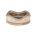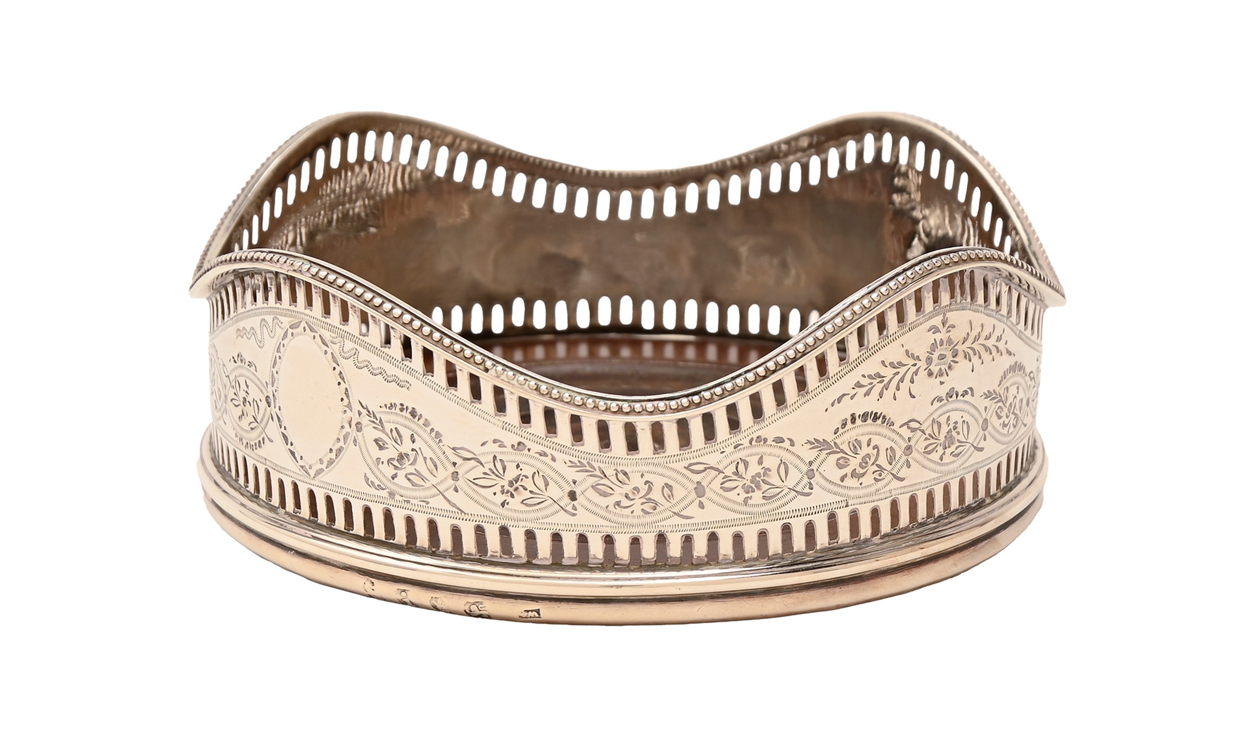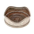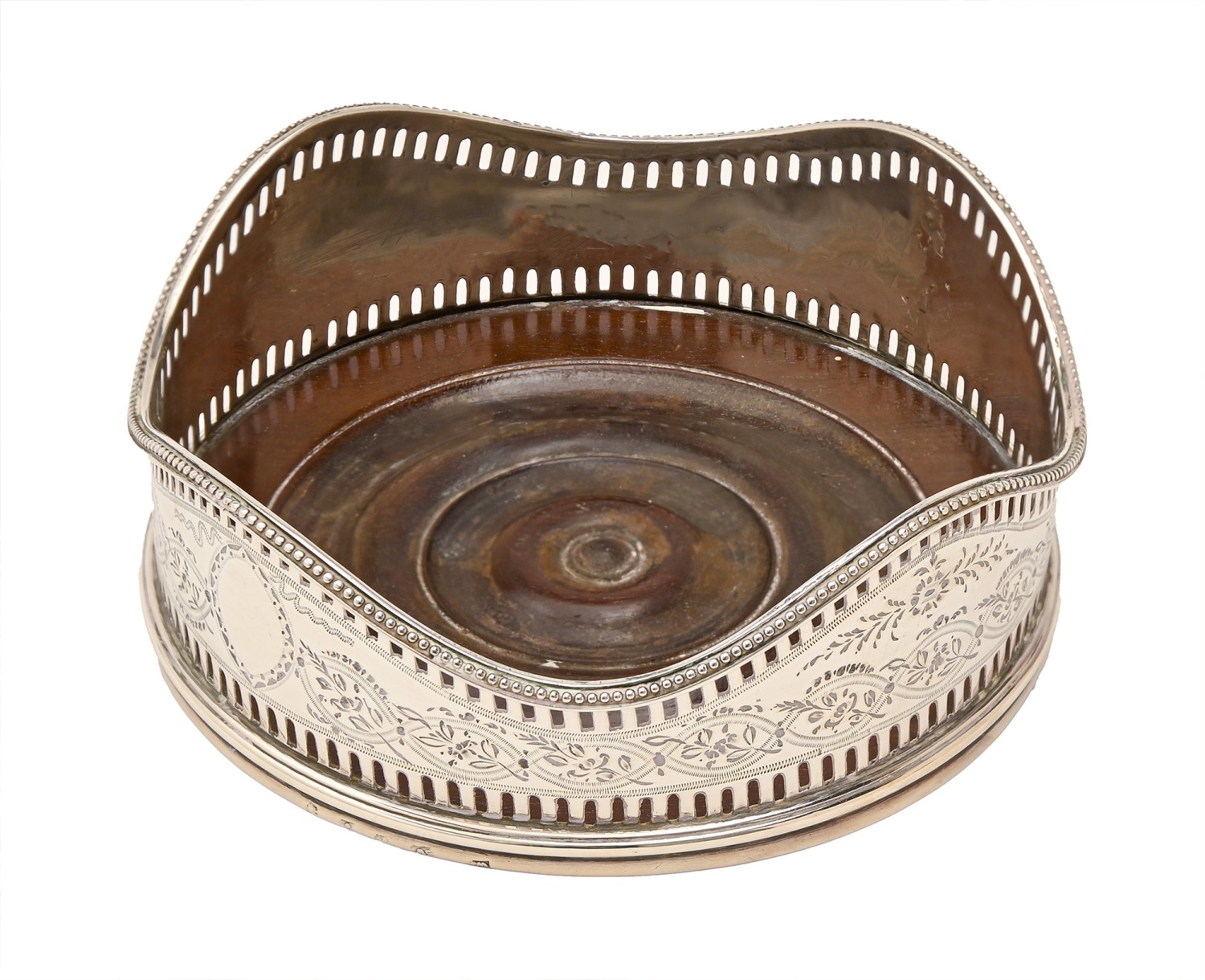 A George III neo classical pierced and engraved silver wine coaster, with undulating beaded rim, inset turned wood base, 11.5cm diameter, marks rubbed, London 1784