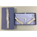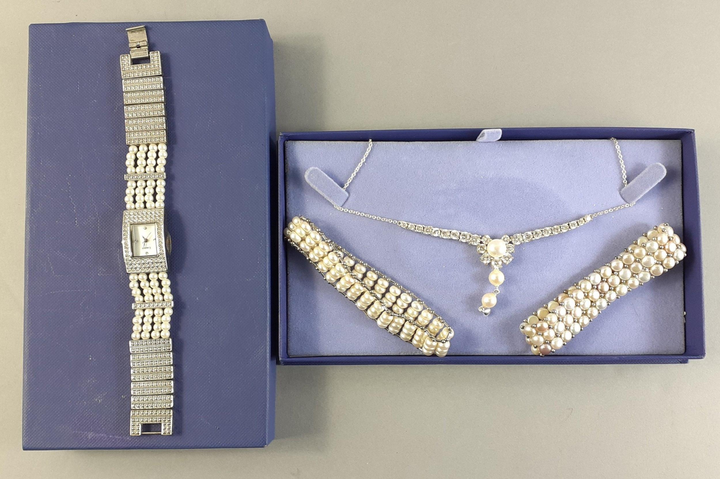 A silver chain pendant with pearls and white stones with two expanding pearl bracelets and a pearl and marcasite style dress watch (battery required)