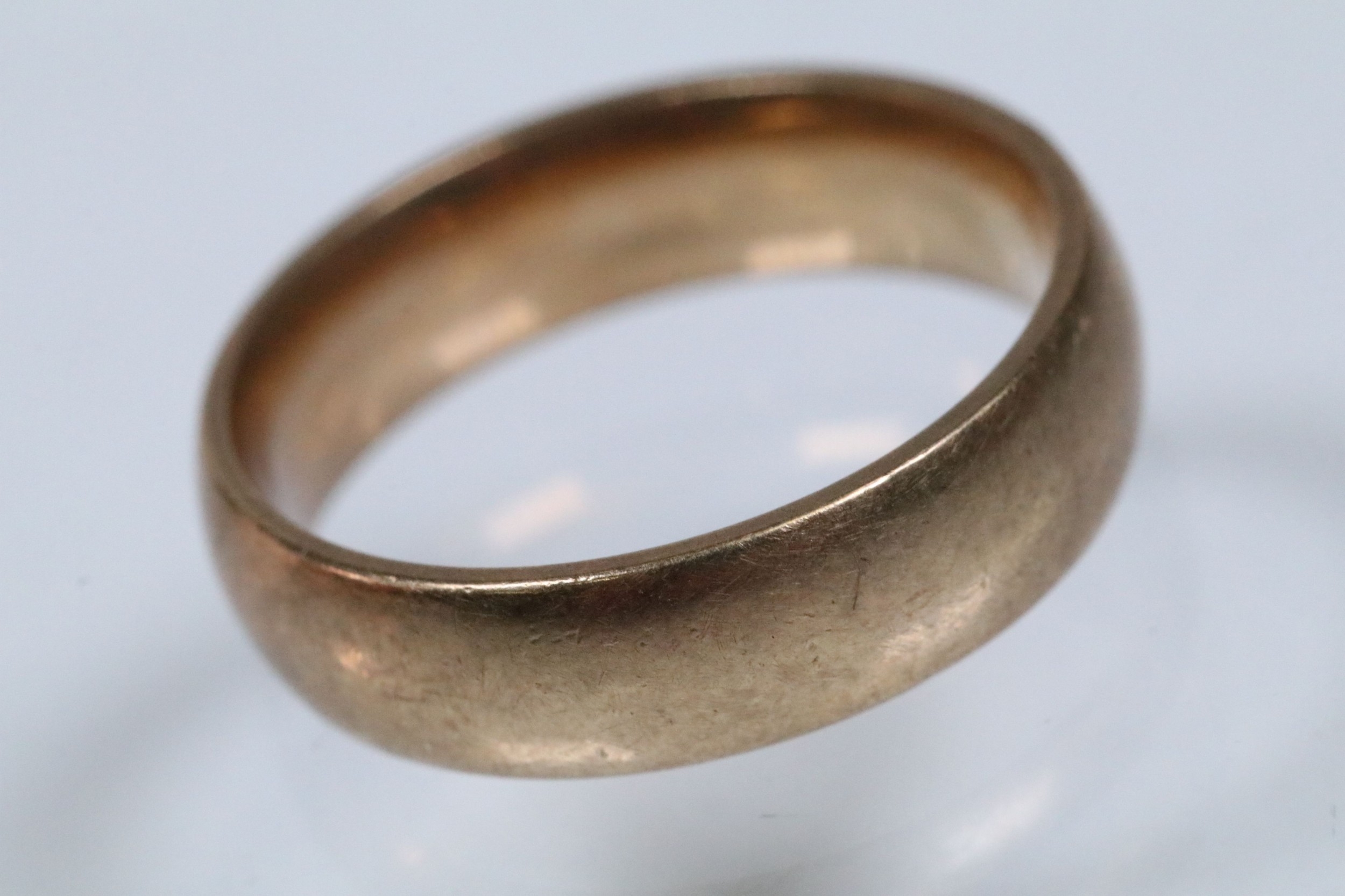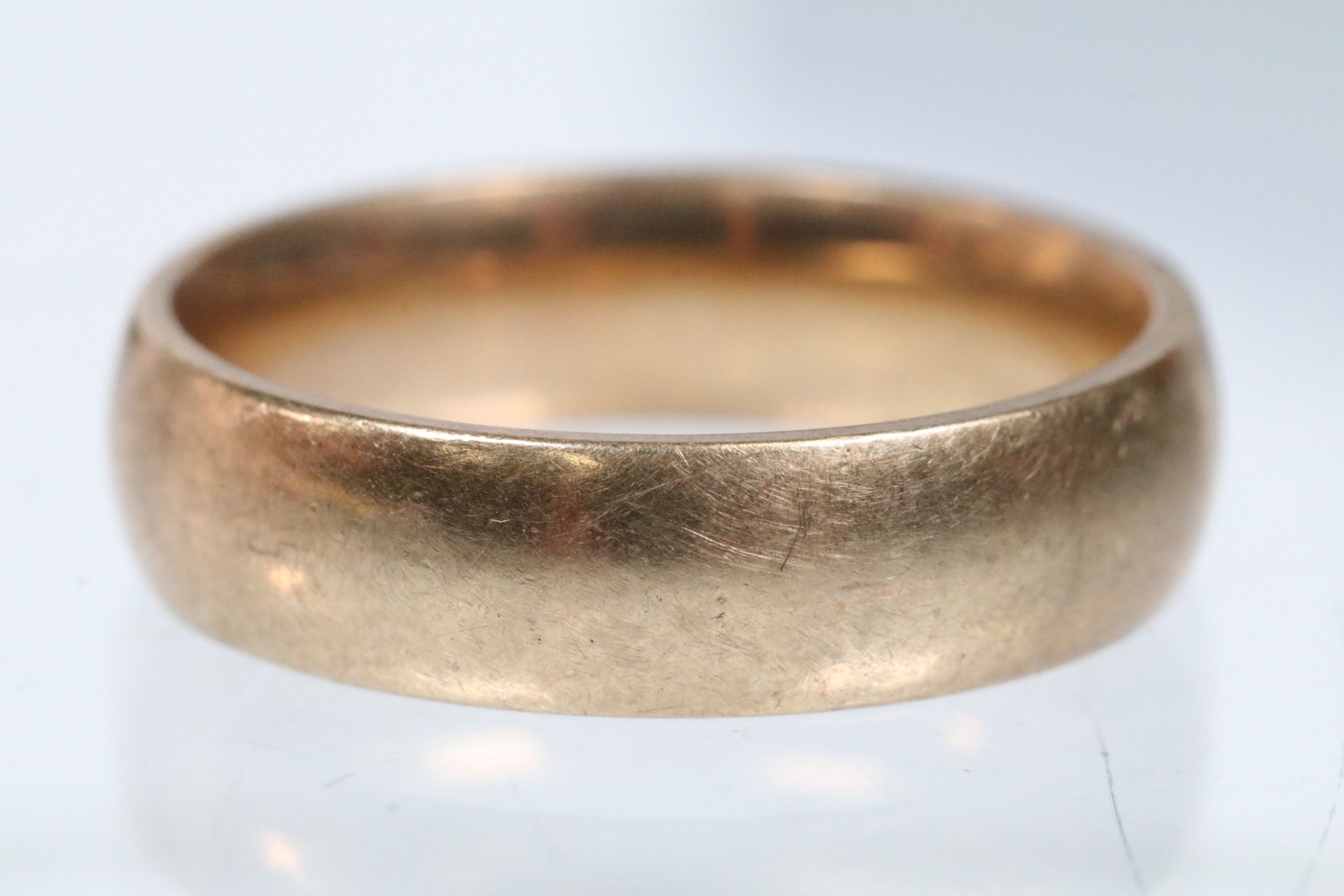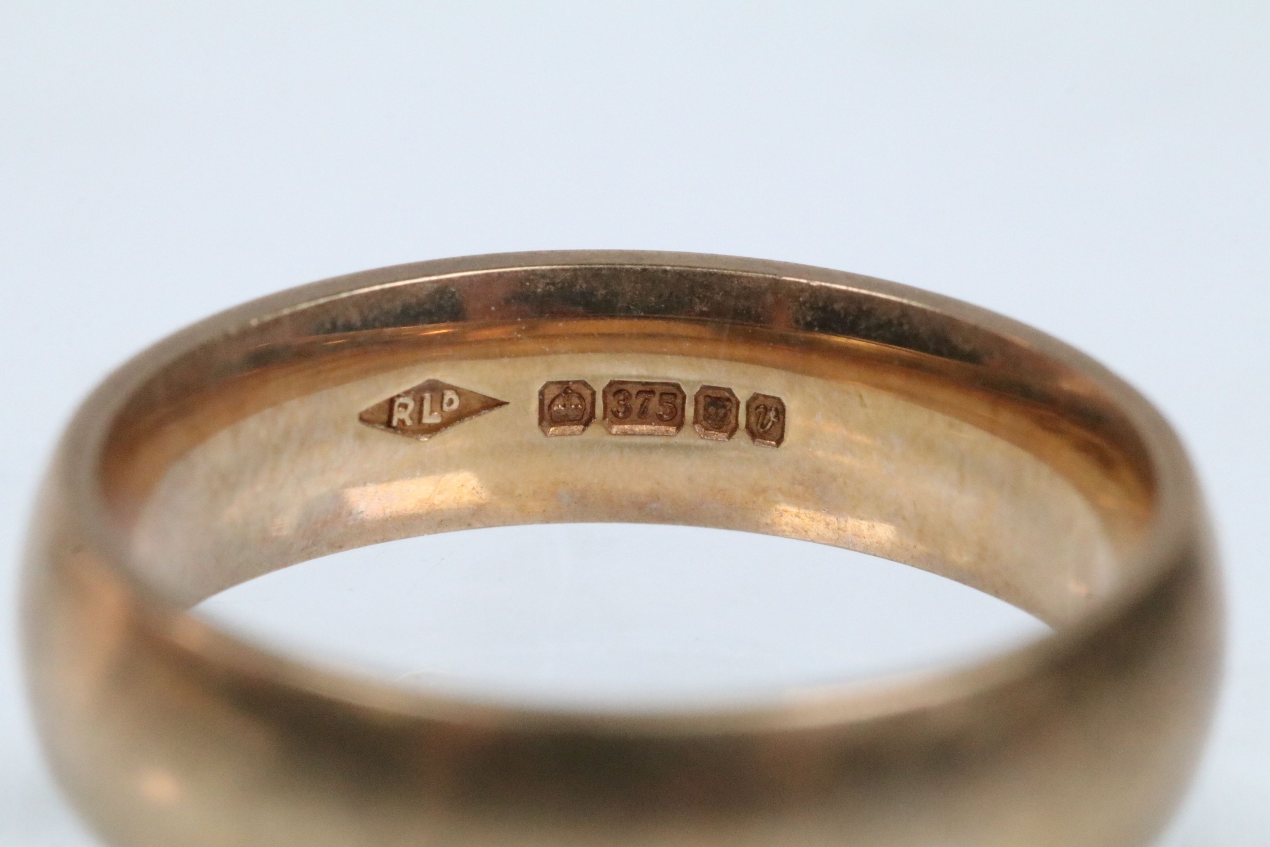 9ct gold wedding band ring of plain form. Hallmarked London 1995. Size M.5.