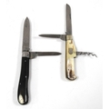 Penknives: two polished hornscale handle examples, one Abram Brookshank Sheffield with two blades, punch and corkscrew and another two-blade examples (2).