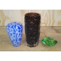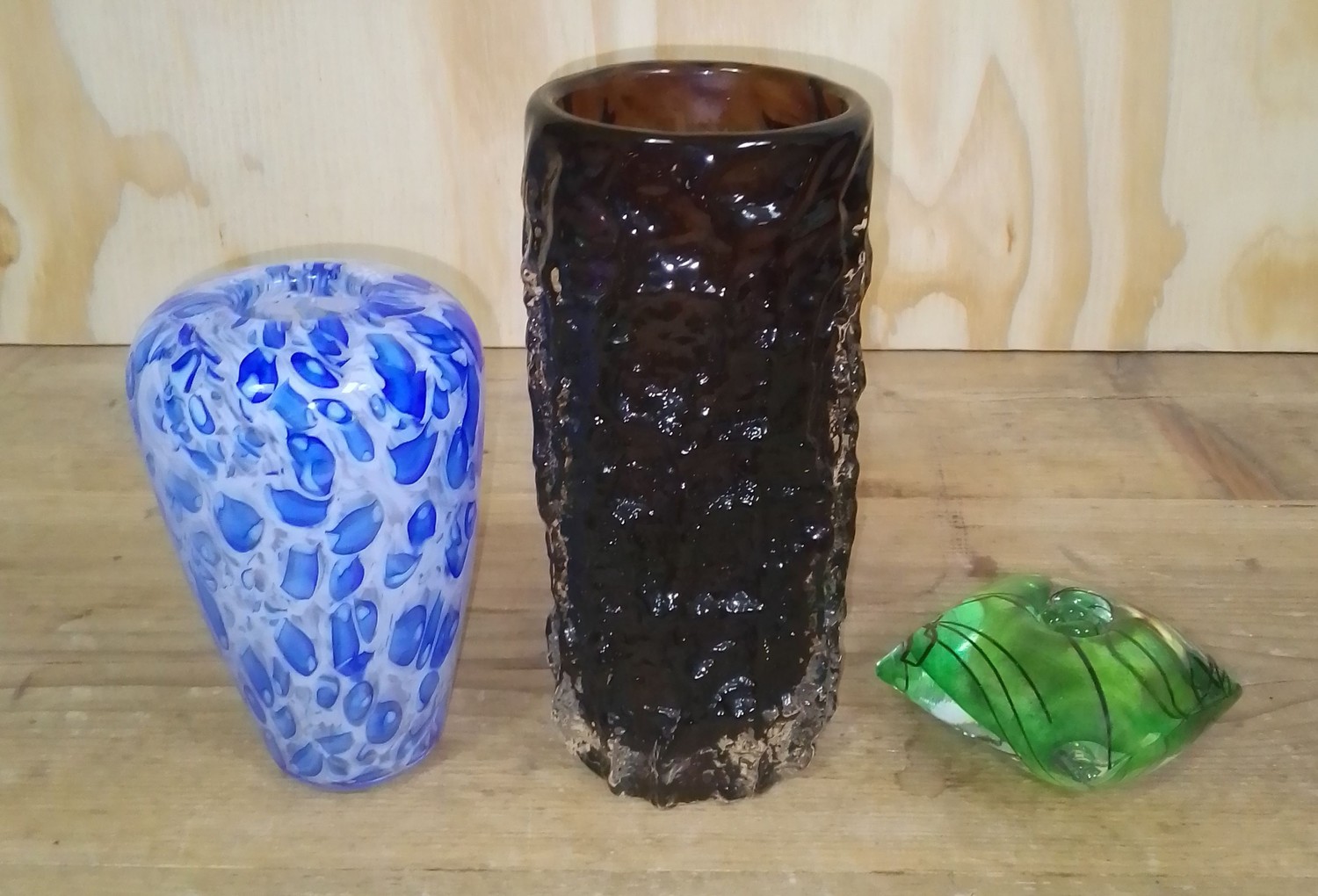 Three pieces of art glass comprising a Whitefriars bark vase, a Ditchfield Glasform cushion paperweight and a Sanders & Wallace vase.