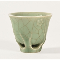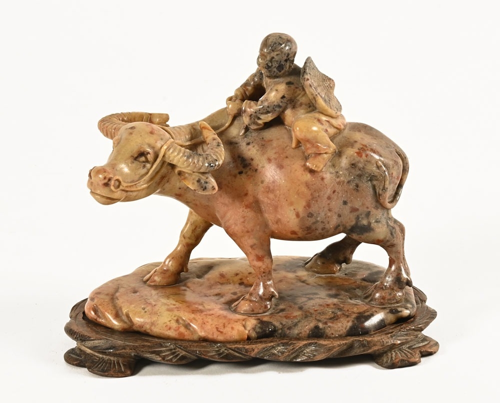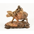 A Chinese soapstone figure boy on buffalo, raised on a wooden stand. Height 14 cm.