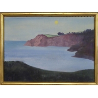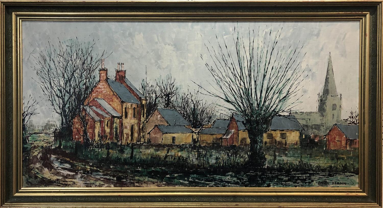 PAUL MANN (1907-1994) 'Country Landscape with Church and Farmhouse', oil on board, 49cm x 100cm, signed and framed.