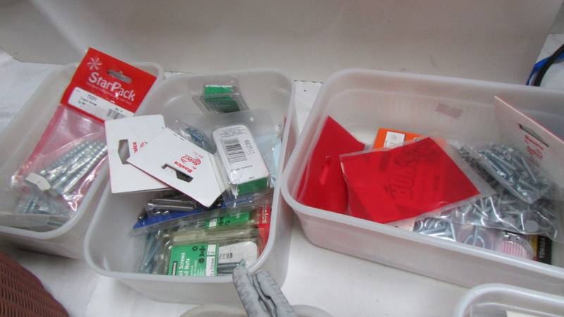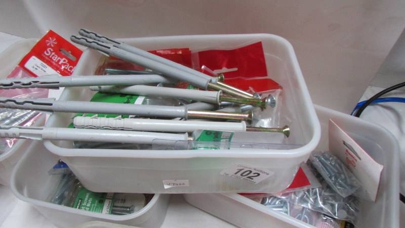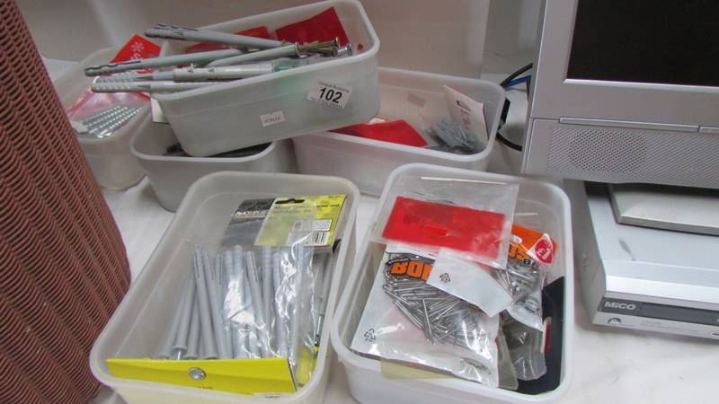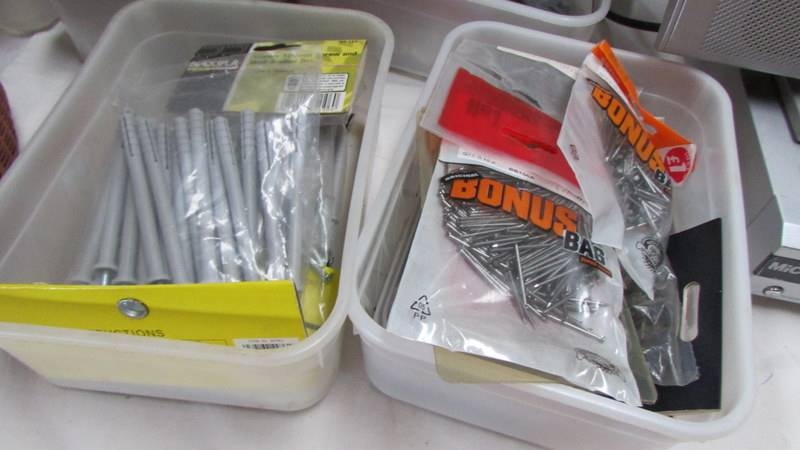Six tubs of nails, wall anchor sets etc.,