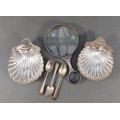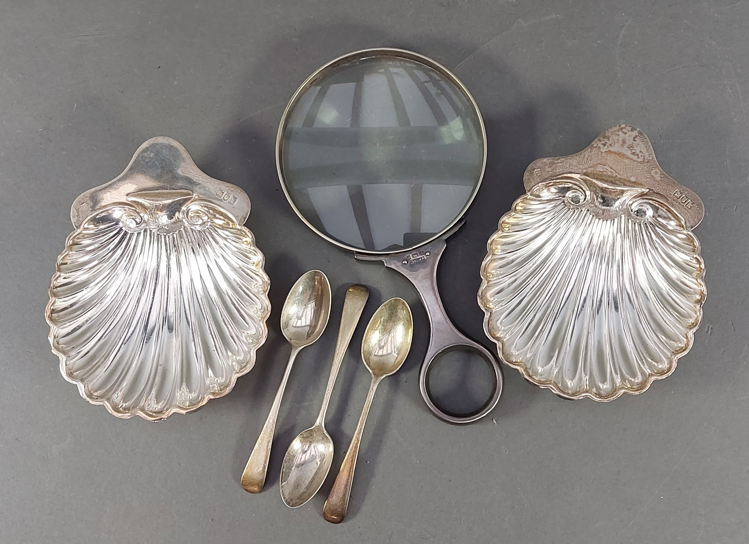 A pair of London silver butter dishes together with three silver teaspoons, 6ozs together with a silver handled magnifying glass