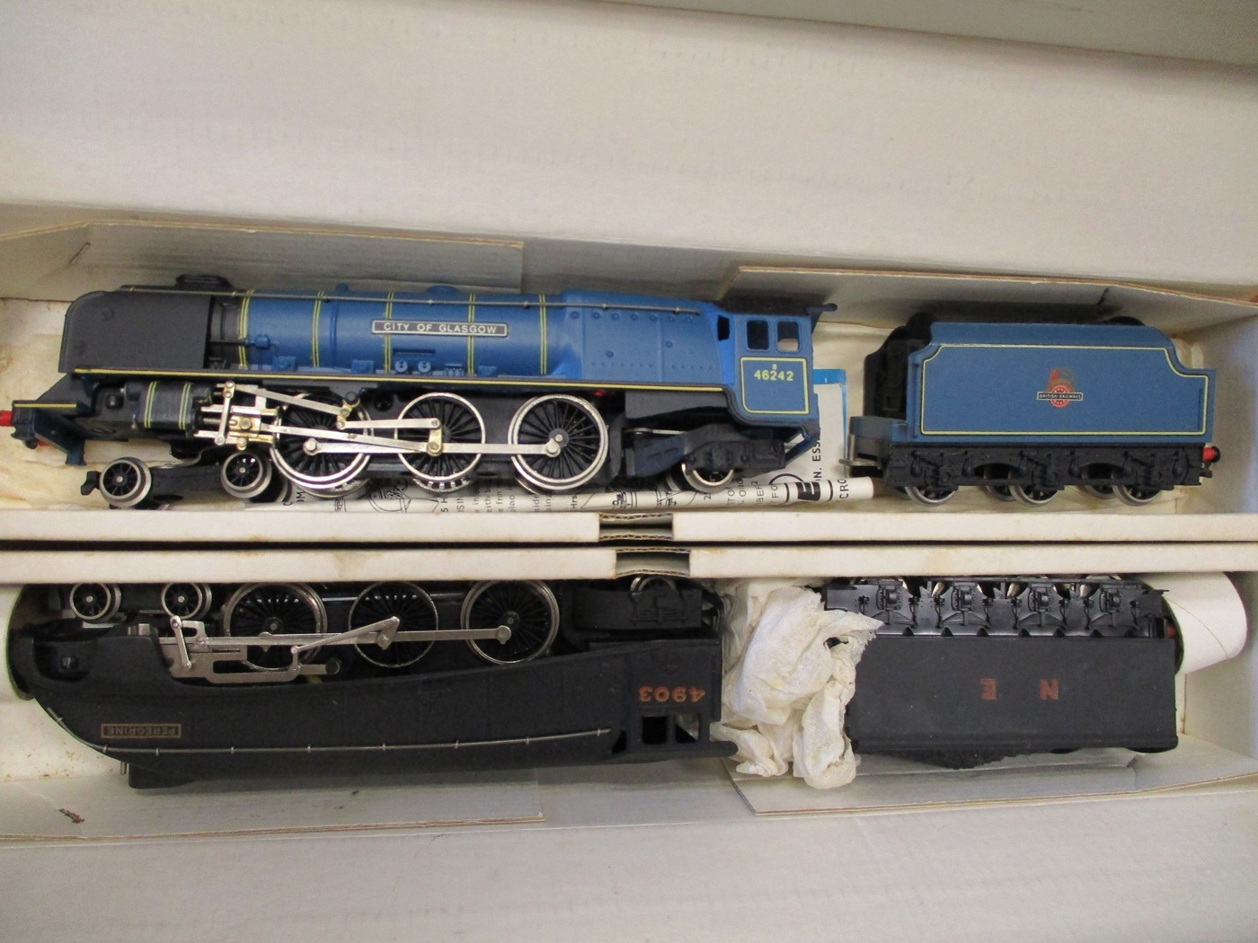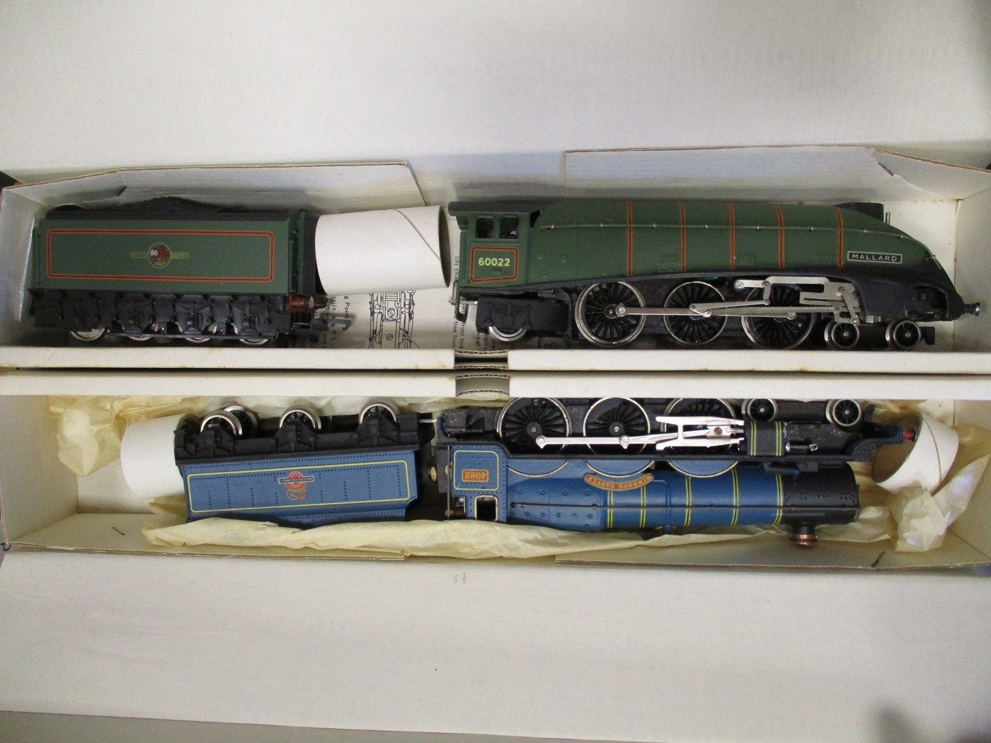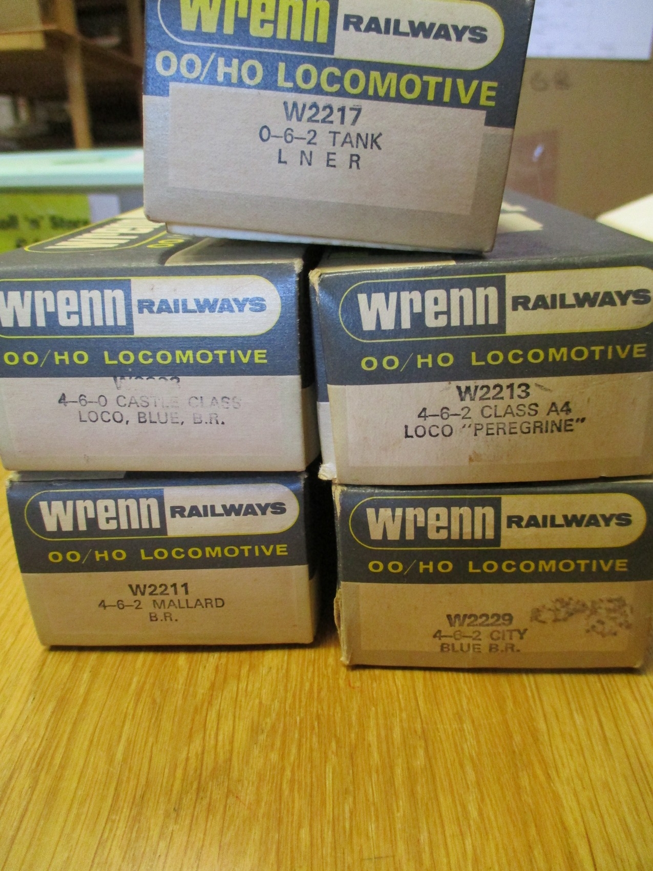 Wrenn. Collection of OO gauge boxed steam locomotives with tenders with LNER Class A4 4-6-2 BR 60022 'Mallard' green No W2211, LNER Class A4 4-6-2 4903 'Peregrine' wartime black No W2213, GWR Castle Class 4-6-0 4082 BRb 'Windsor Castle' blue No W2223, 'Duchess' 8P Class 4-6-2 BR 46242 'City of Glasgow' blue No W2229 and Class N2 0-6-2 LNER 9522 green tank No W2217, generally excellent in good plus to excellent boxes. Qty 5 (½B)