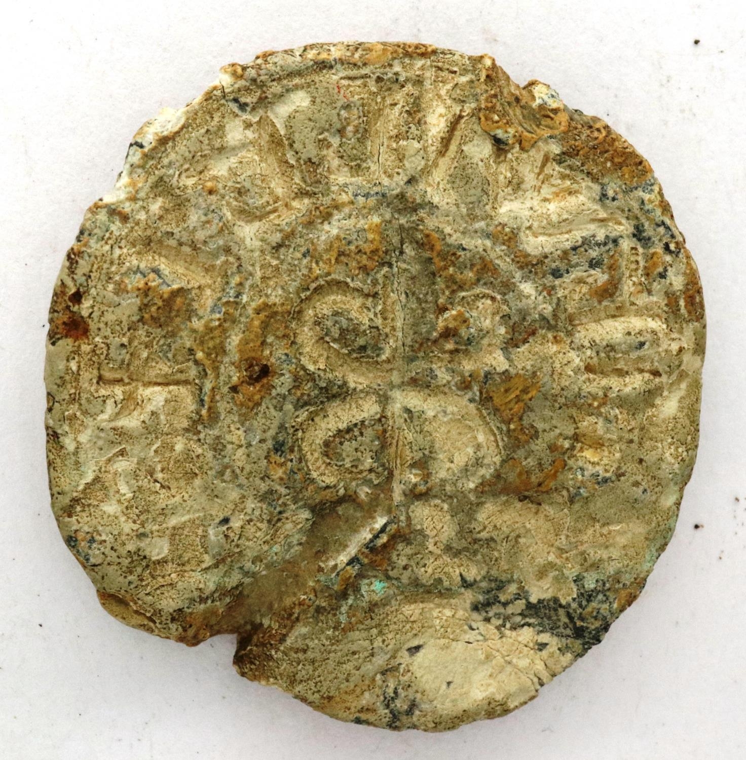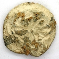 Medieval lead working seal, floral design, D: 28 mm. P&P Group 0 (£5+VAT for the first lot and £1+VAT for subsequent lots)