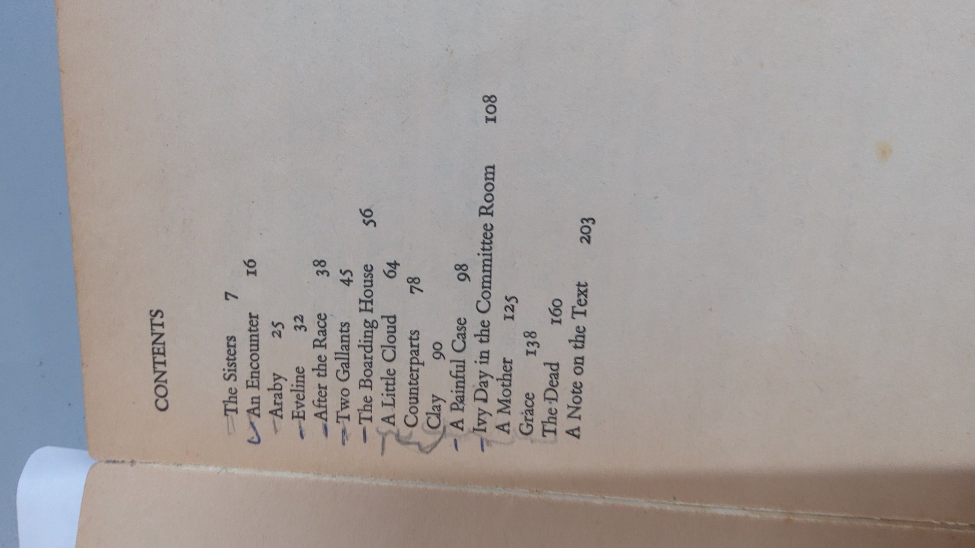 James Joyce, Dubliners—paperback volume; printed contents list including ‘The Sisters’, ‘An Encounter’, ‘Araby’, ‘Eveline’, ‘After the Race’, ‘Two Gallants’, ‘The Boarding House’, ‘A Little Cloud’, and ‘The Dead’ among others.