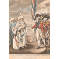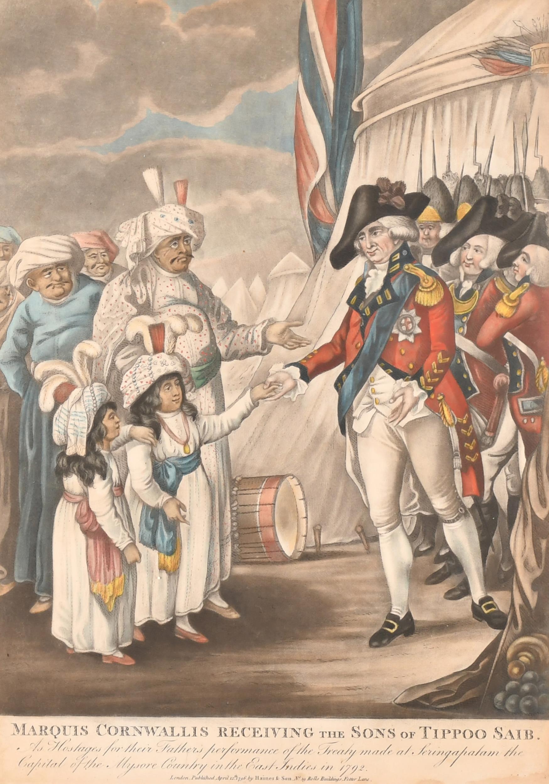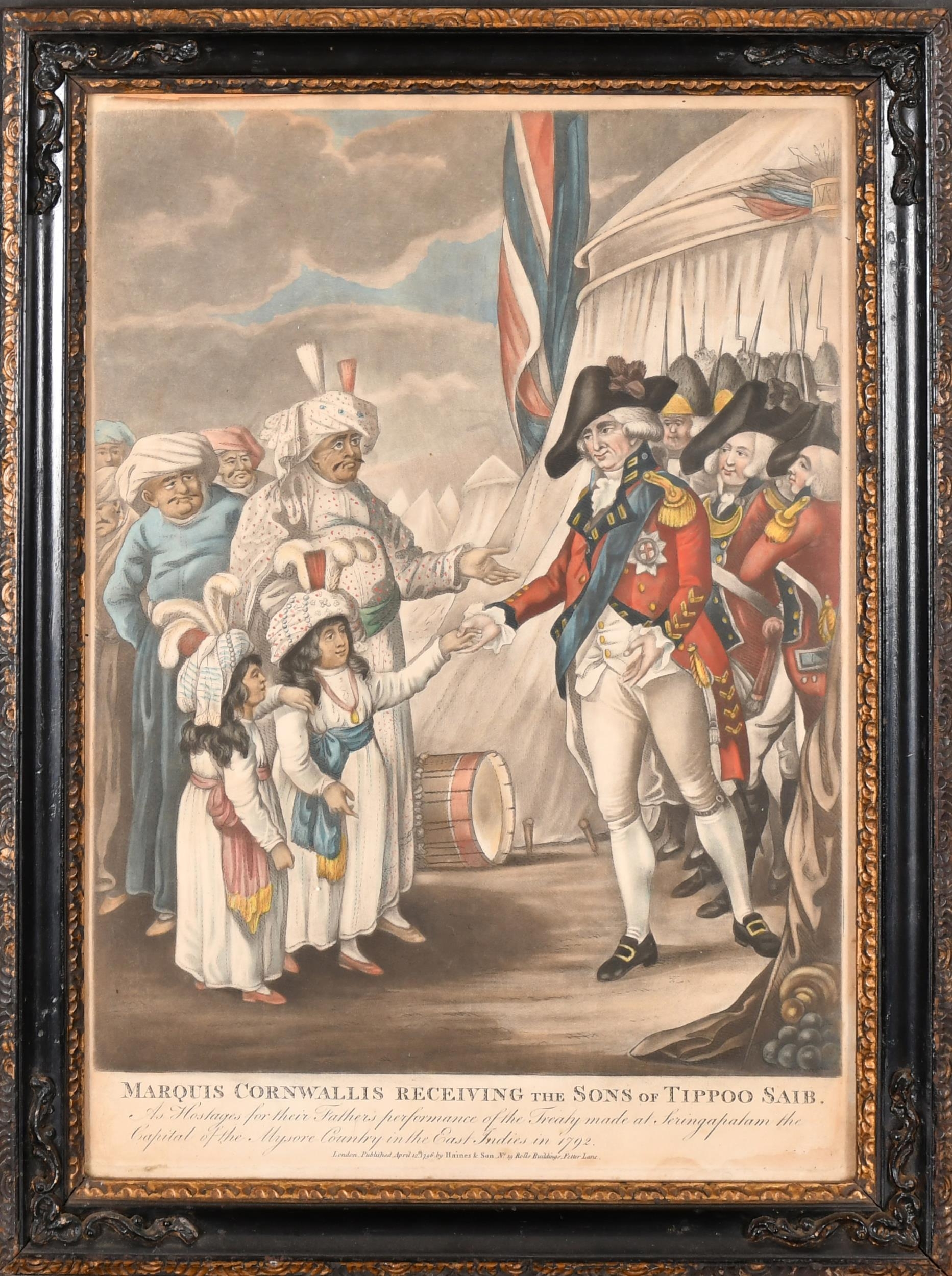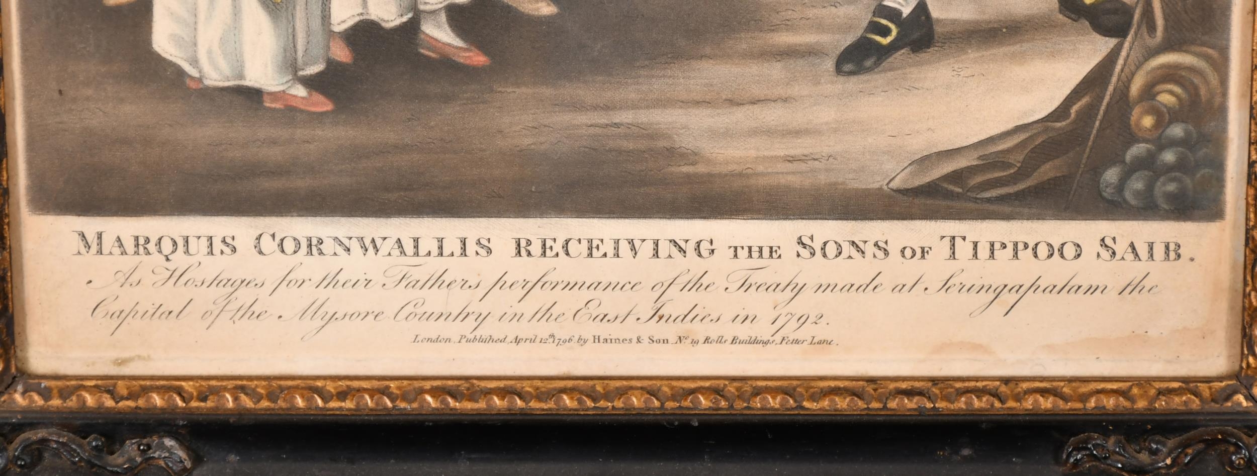 Circle of Mather Byles Brown (1761-1831) British. "Marquis Cornwallis receiving the sons of Tippoo Saib", Engraved by Daniel Orme, In period frame, Overall 14" x 9.75" (35.5 x 24.7cm). Provenance: The Parker Gallery