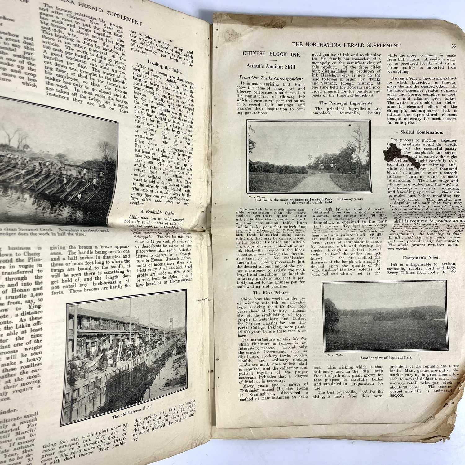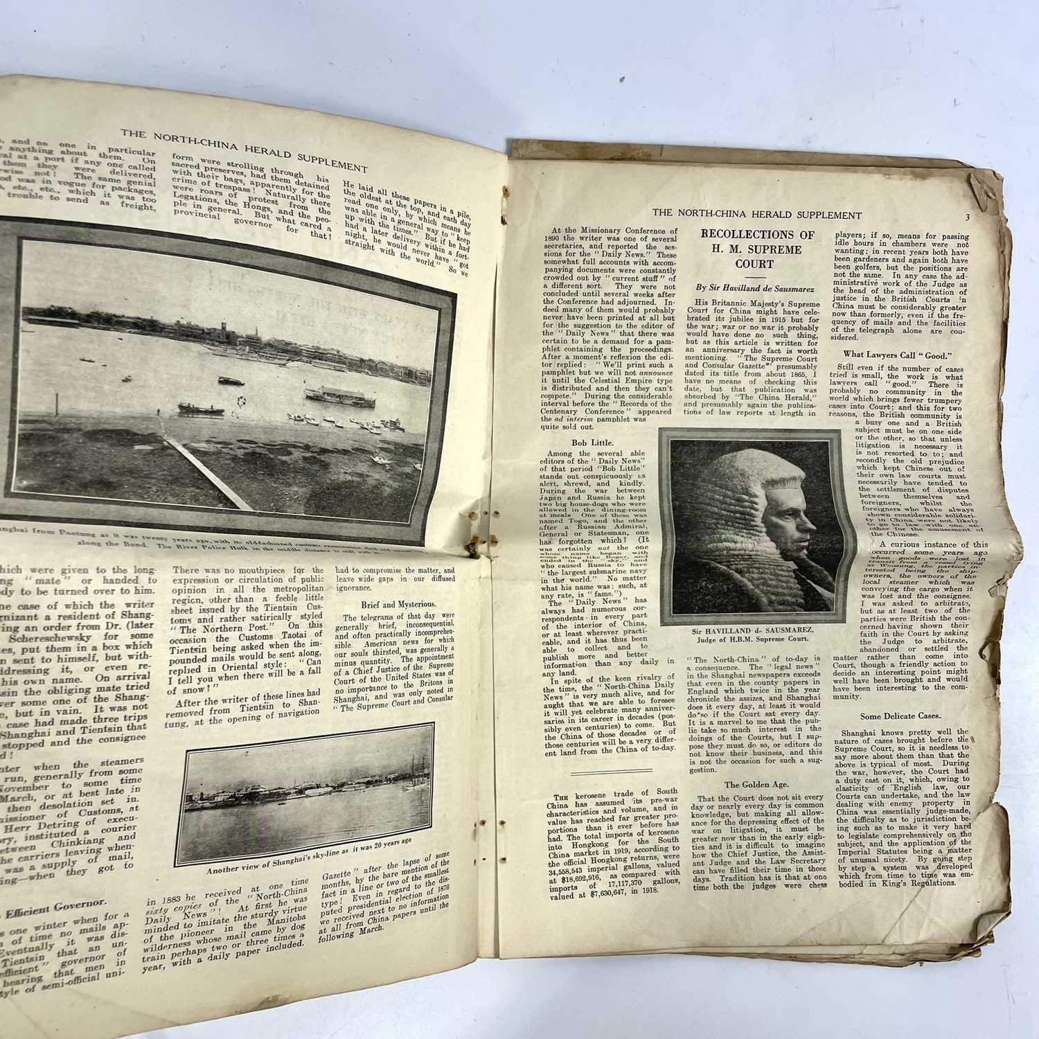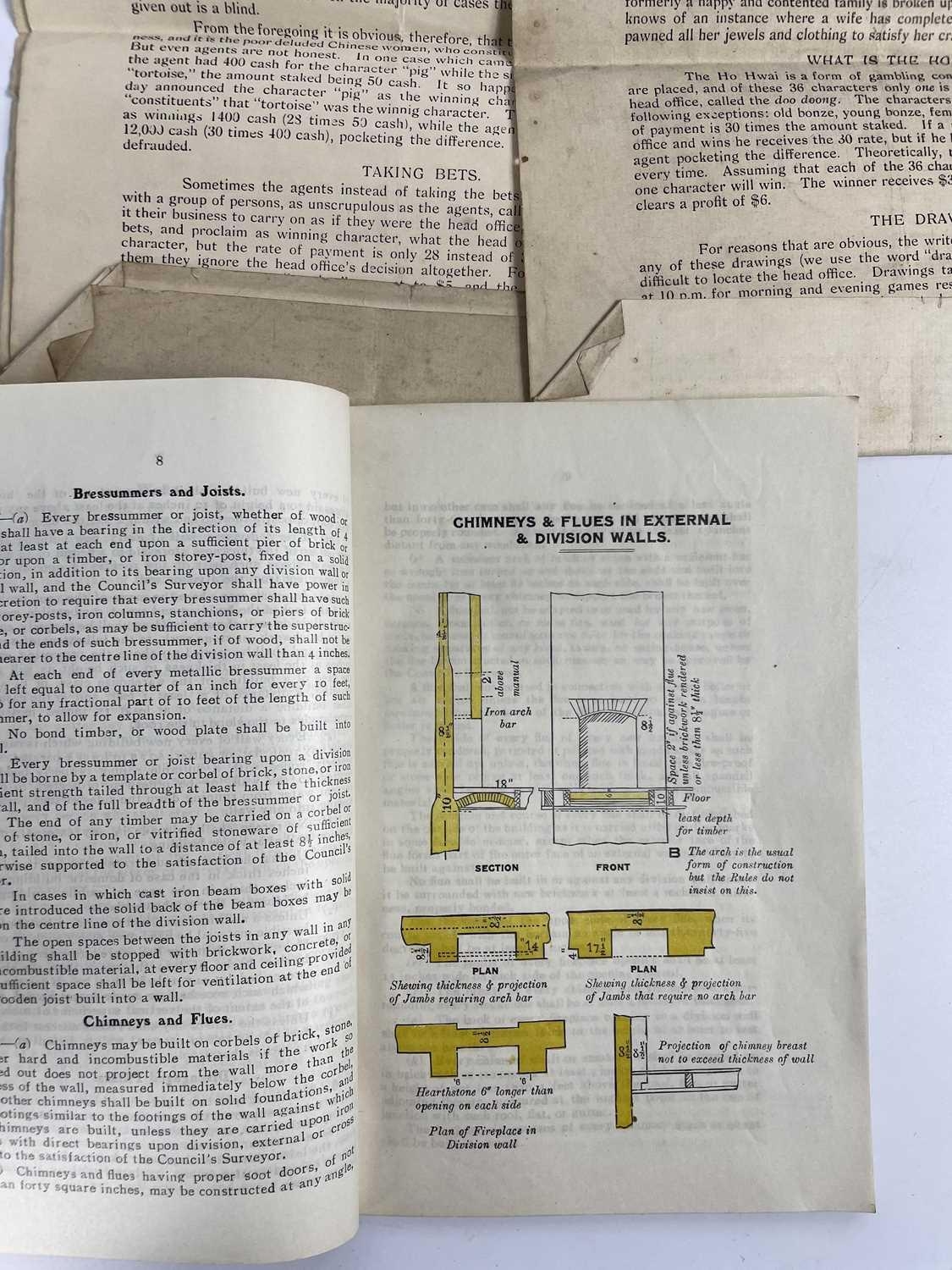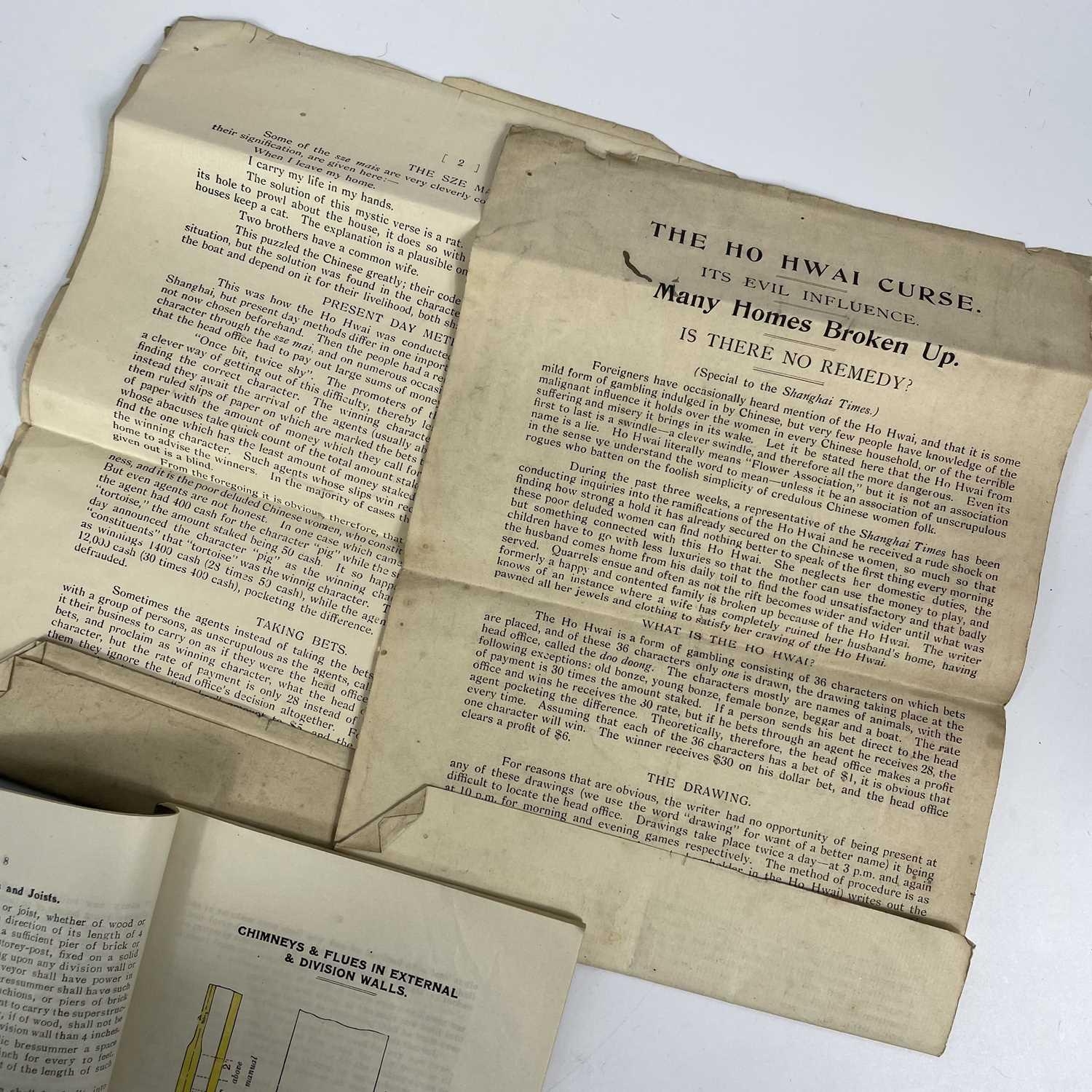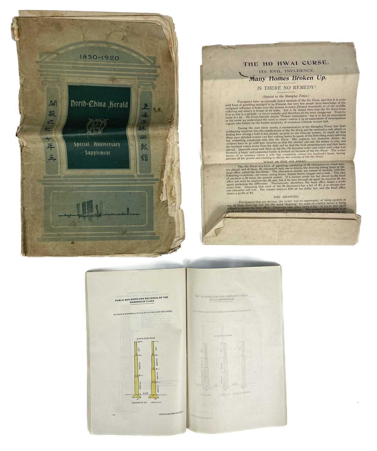 'The Ho Hwai Curse,' 'Its Evil Influence...,' special to the Shanghai Times, report on the 'evils' and 'devastation' of gambling in Shanghai during the early 20th century, four loose leaves, [c.1900]; 'Rules with Respect to New Foreign Buildings in Shanghai,' report by Shanghai Municipal Council, thin card wraps, S. T. K. Tai Shing & Company, Shanghai, 1925; 'Nroth-China Herald Special Anniversary Supplement 1850-1920,' nibbles and loss throughout, illustratins, 1920. (3)