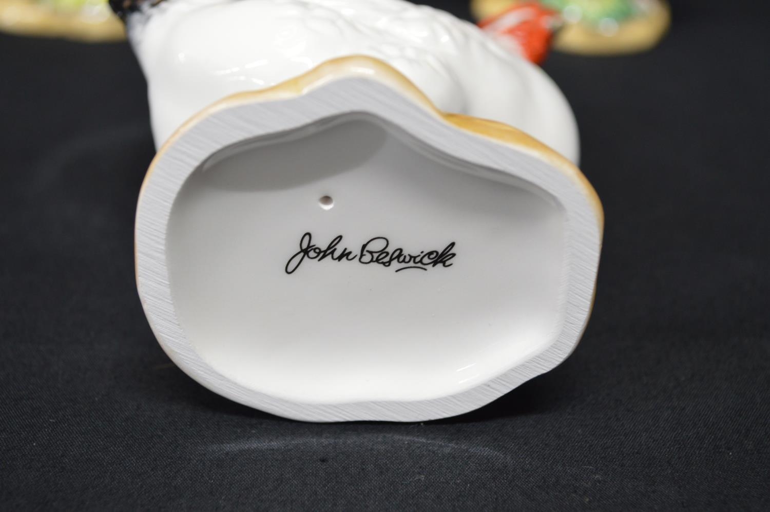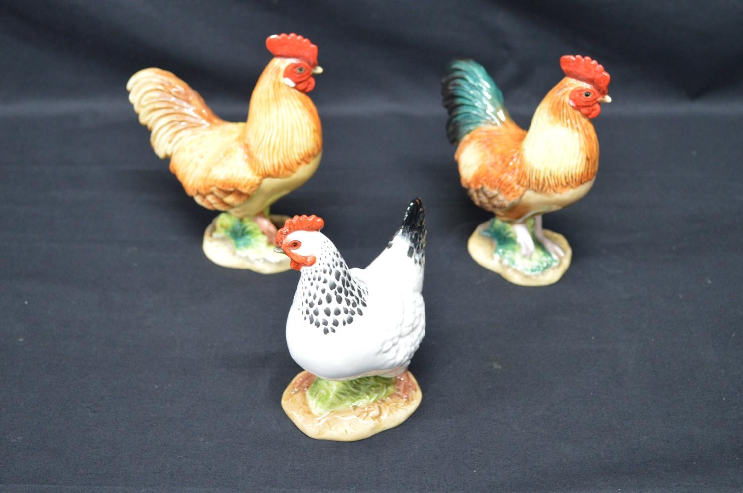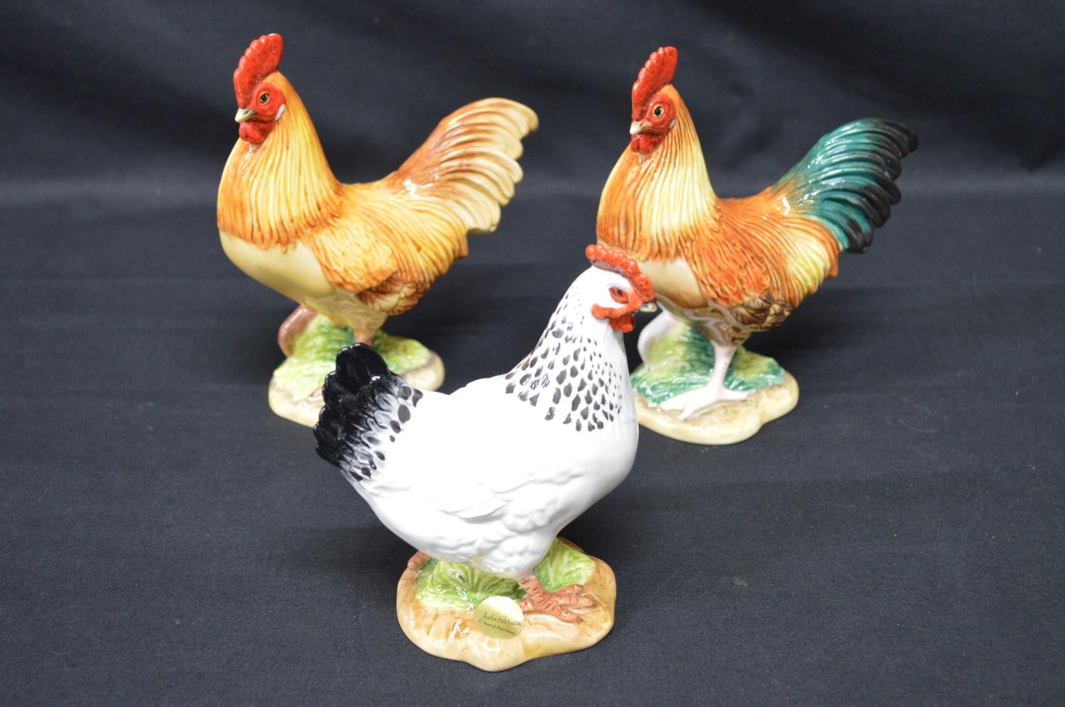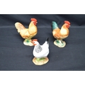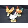 Two John Beswick figures of cockerels - 14cm tall together with a John Beswick figure of a hen - 12.5cm tall