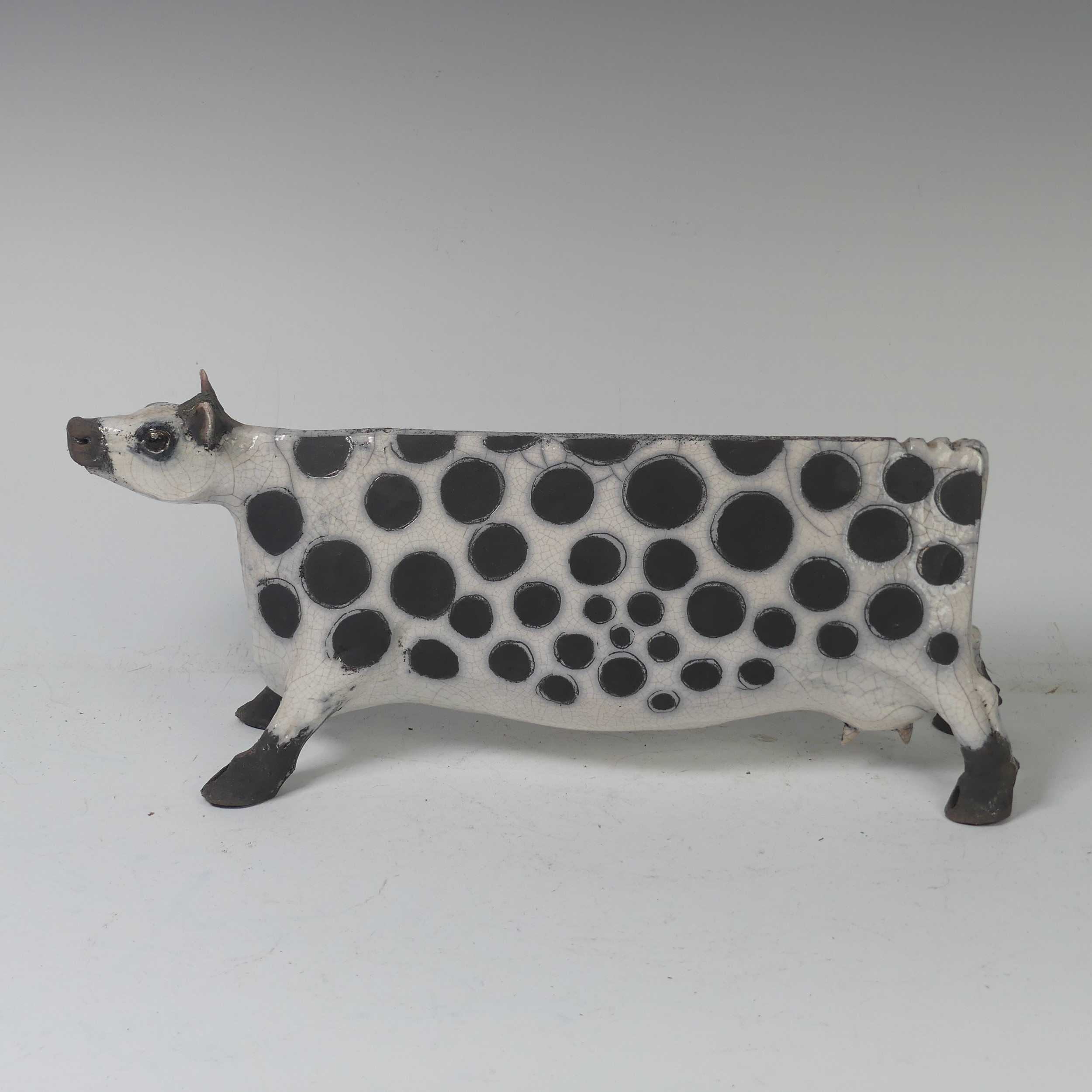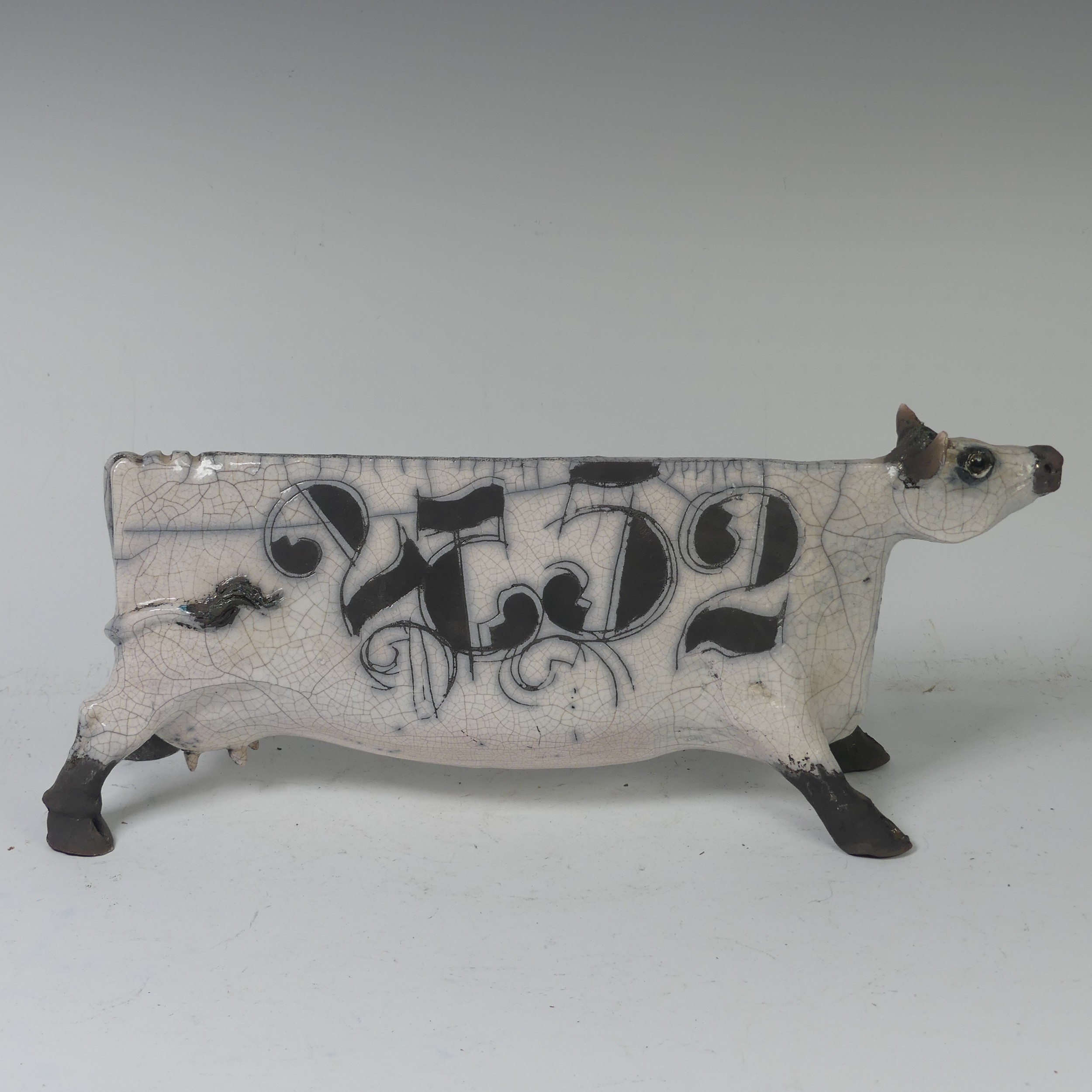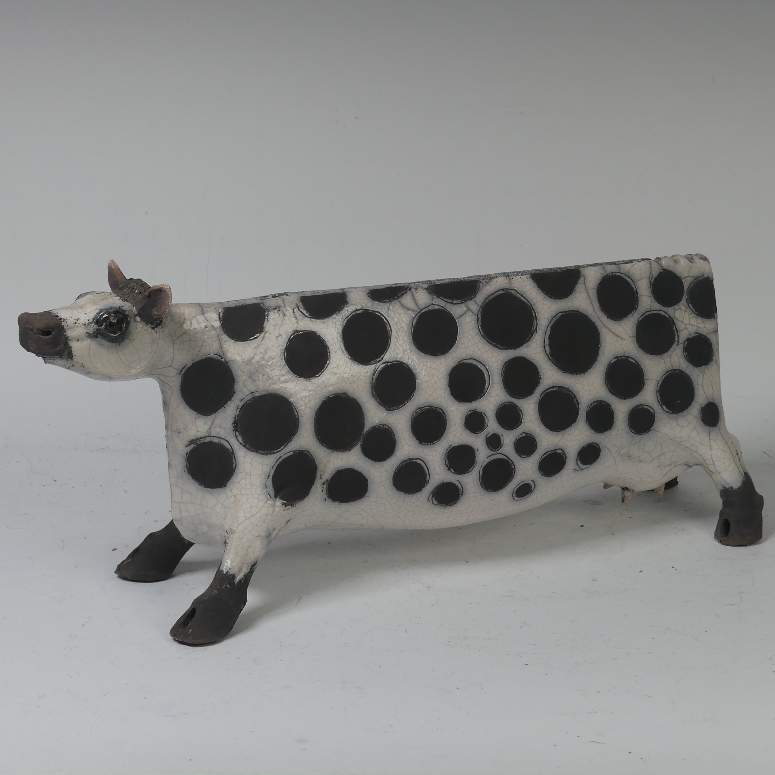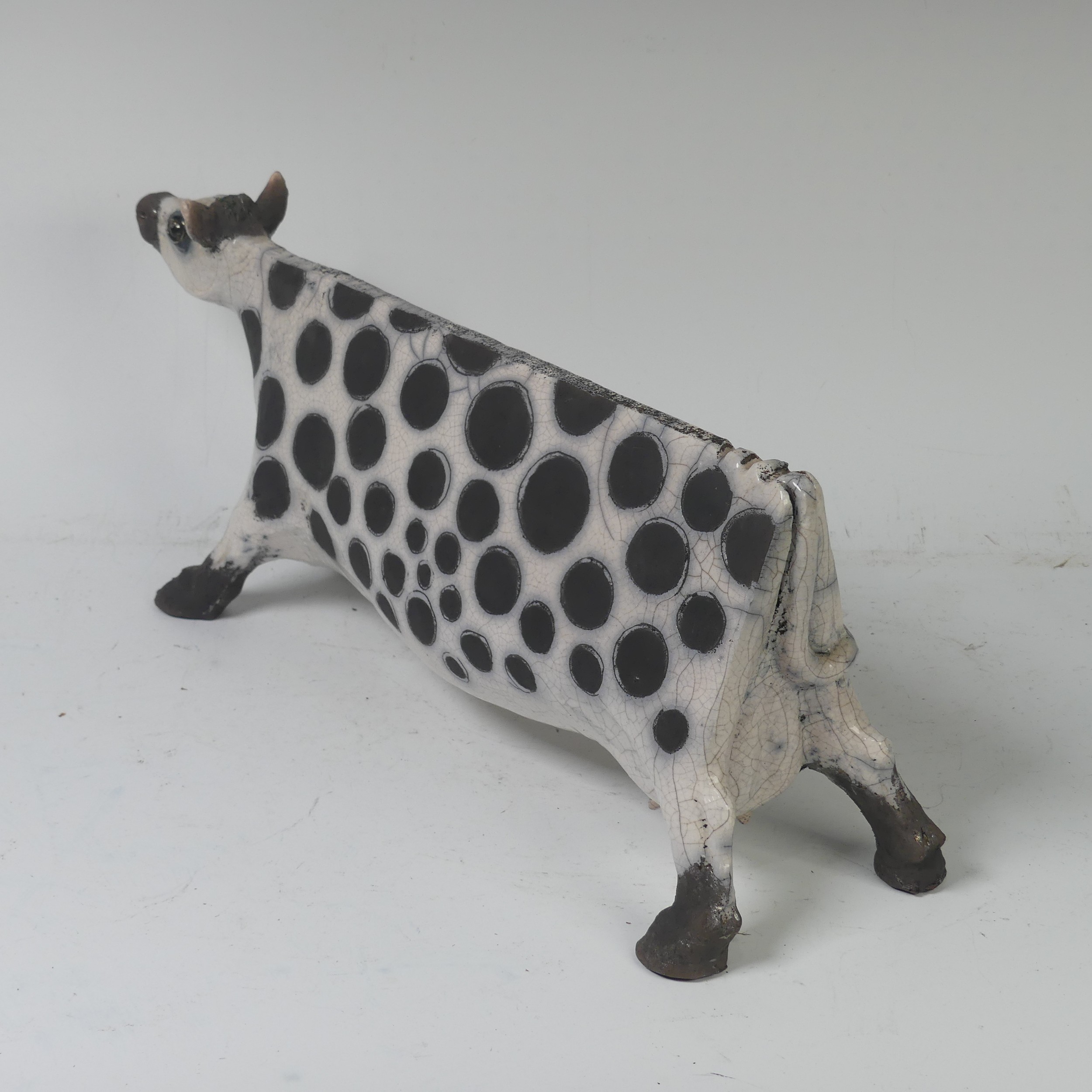 Lawson E. Rudge (b. 1936), a raku fired, studio pottery sculpture of a Cow, with crackle glaze, numbered ' 2552', 17cm high.