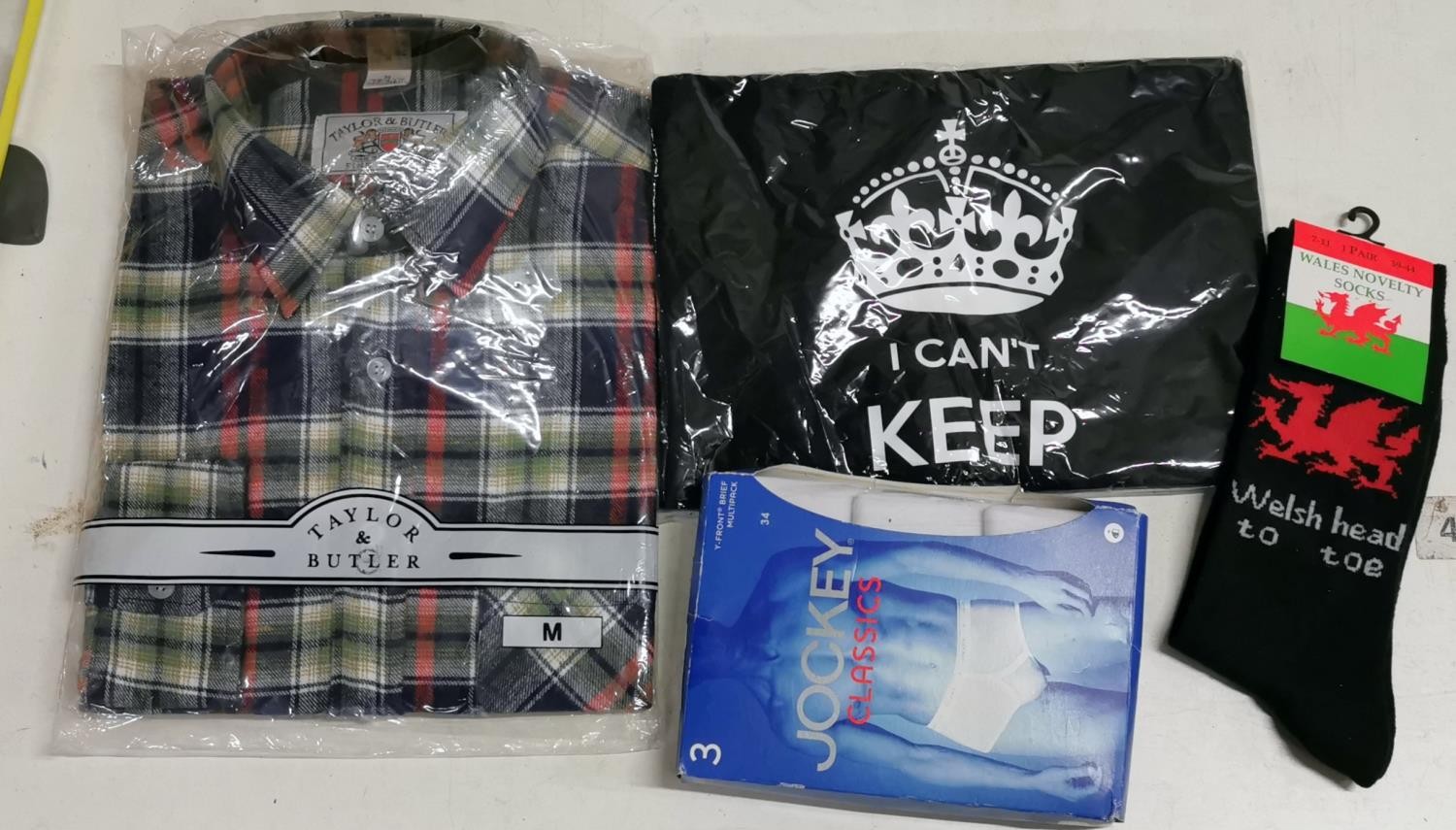4 x new gents clothing items being T-shirt size M, check shirt size M, jockey brief triple pack size M & Welsh novelty socks