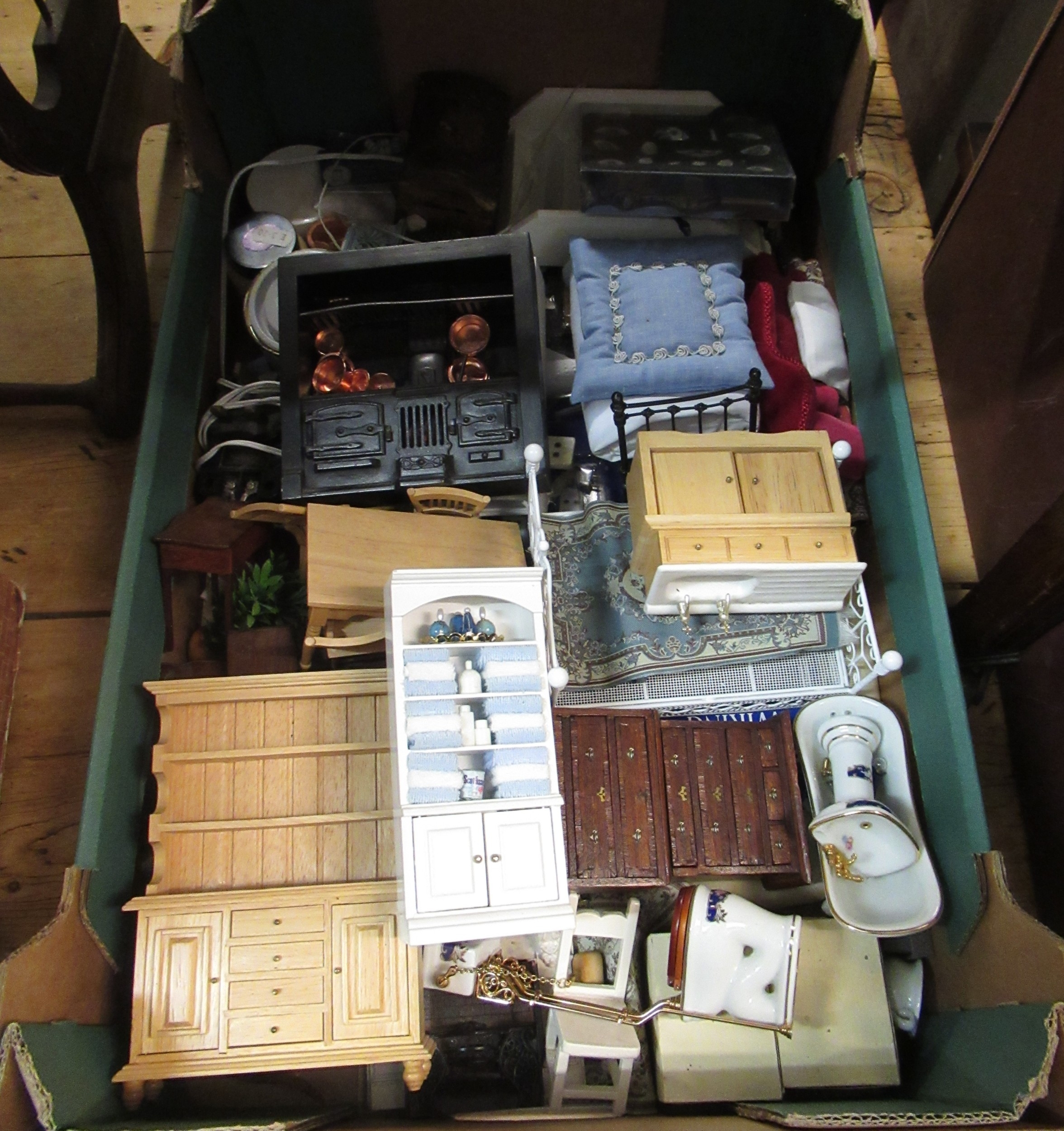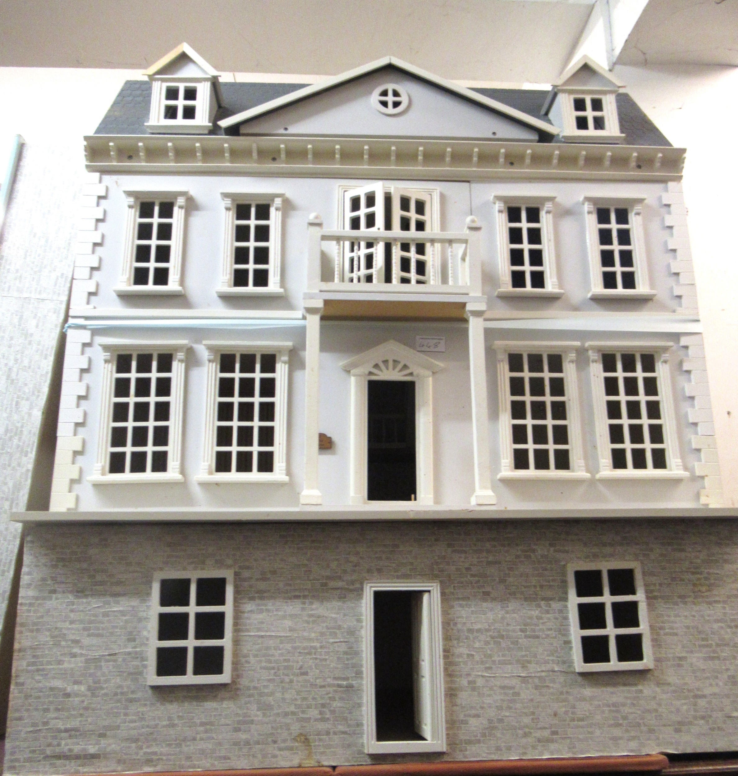 Large modern dolls house in Georgian style with a quantity of various furnishings and lighting