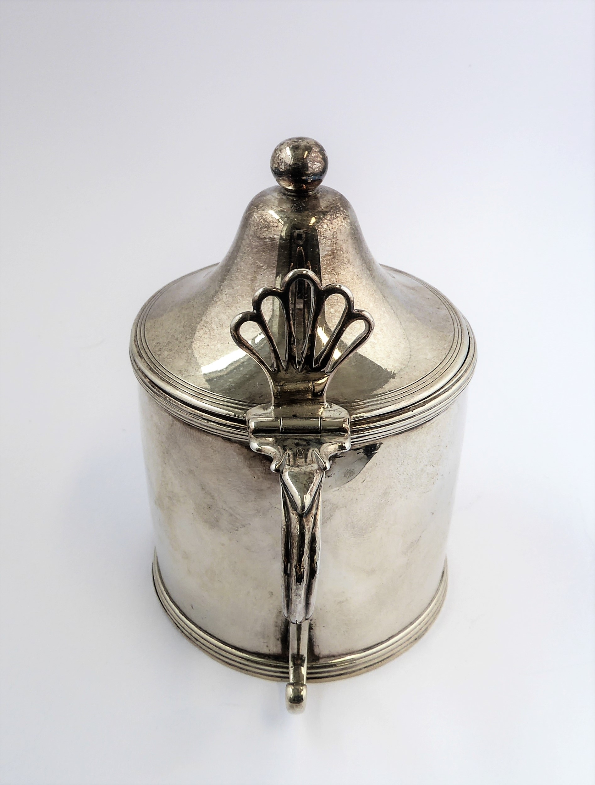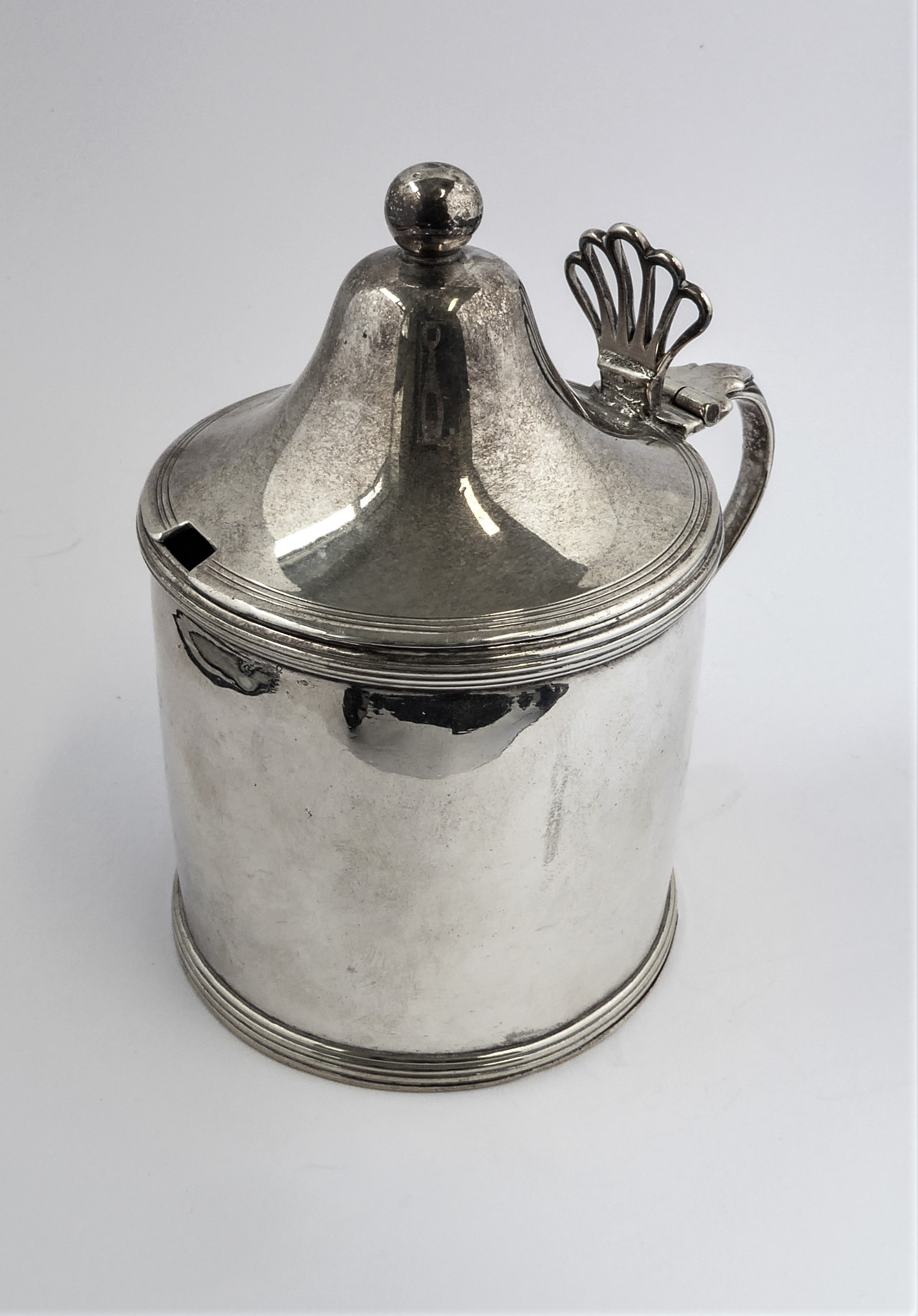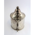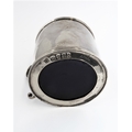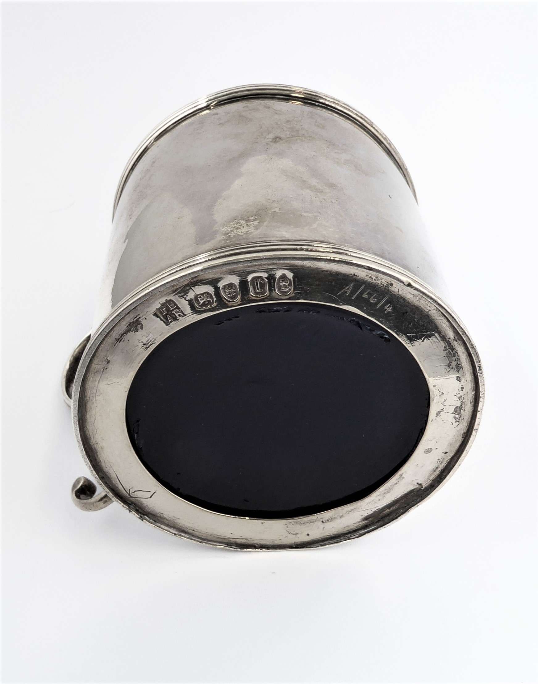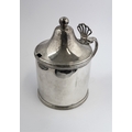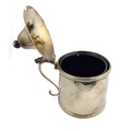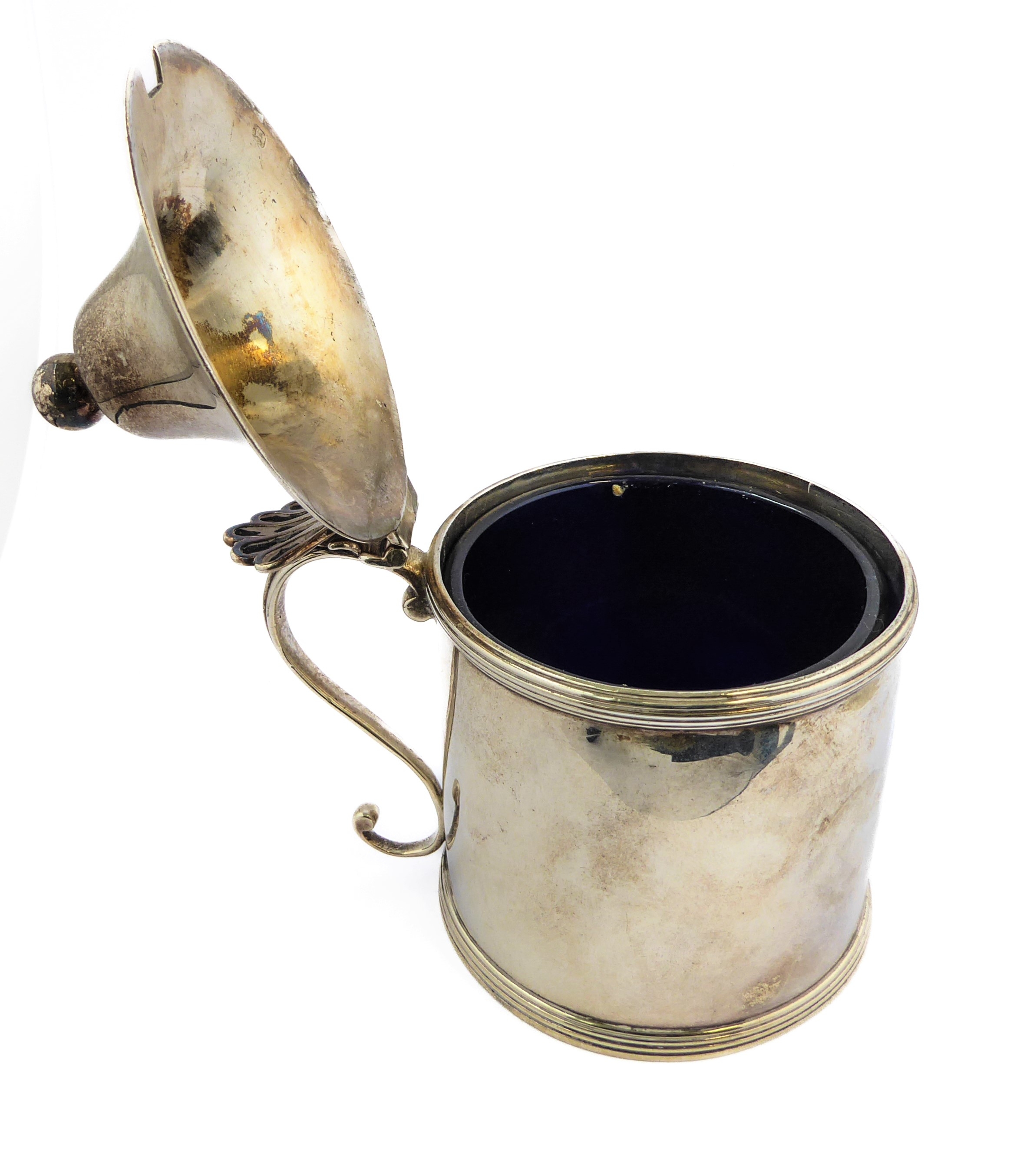 A large hallmarked silver mustard with blue- glass liner: Peter & Ann Bateman, assayed London (possibly 1792). (9 cm high). (107g excluding liner).