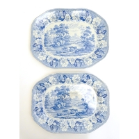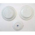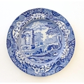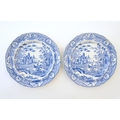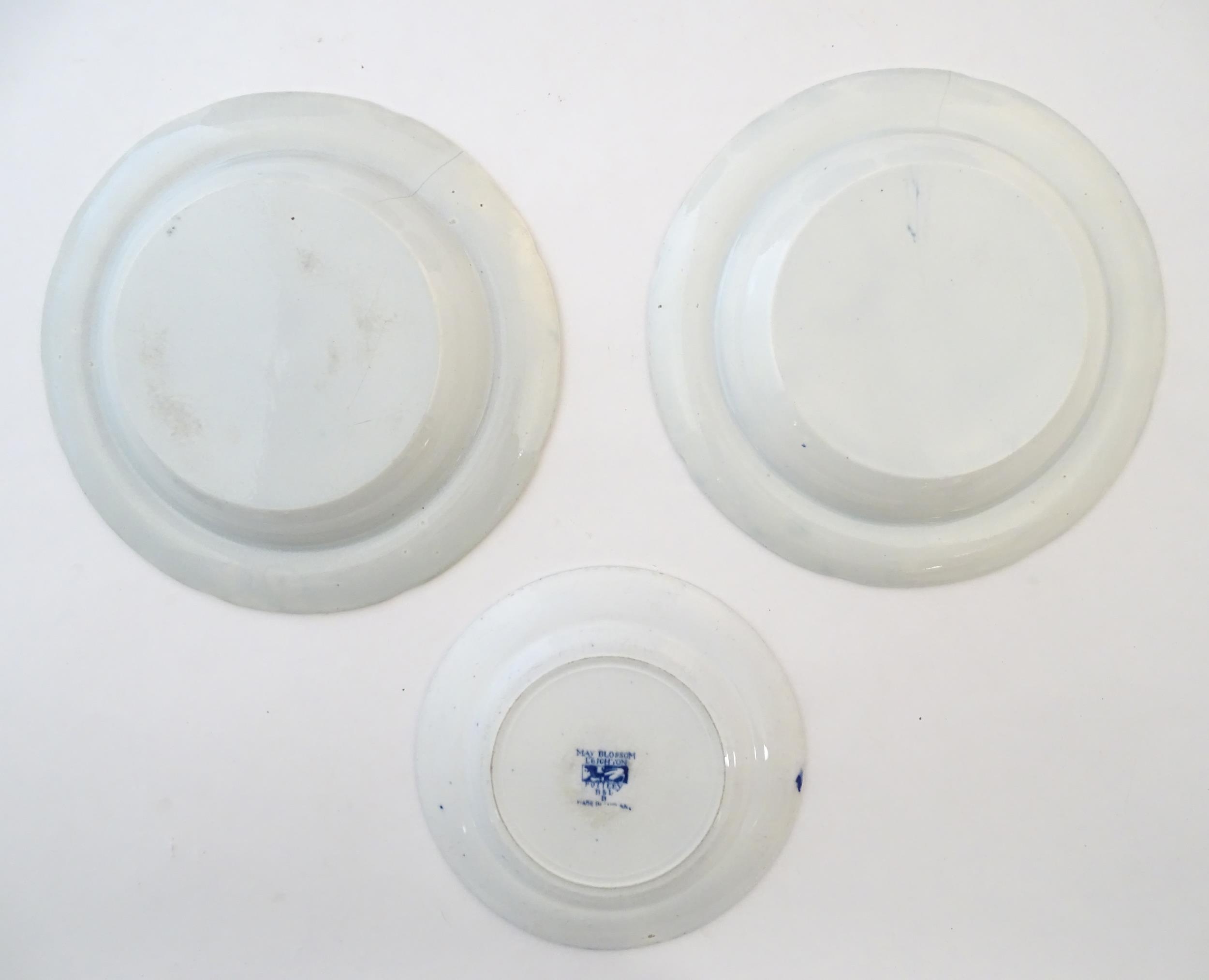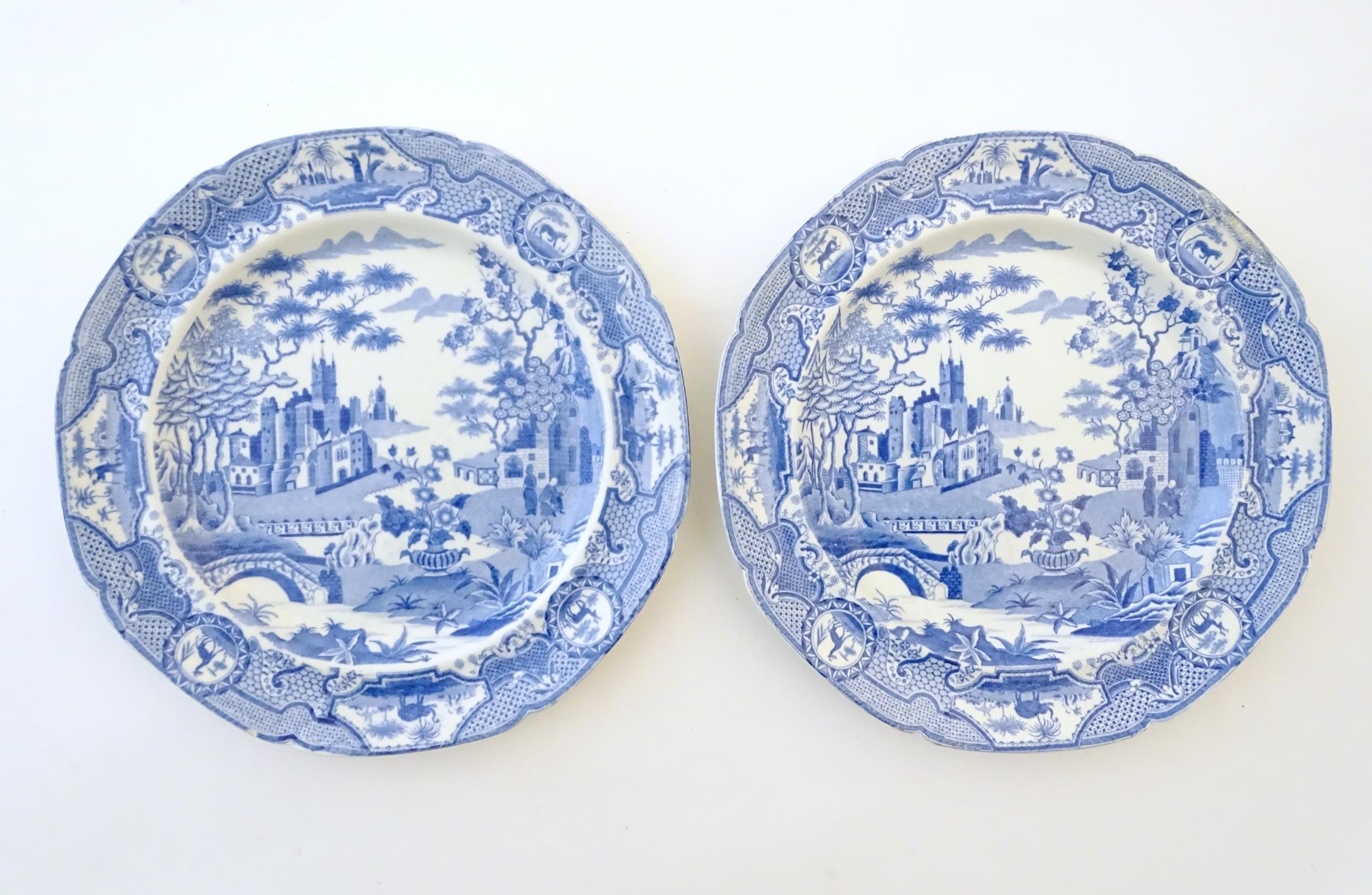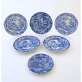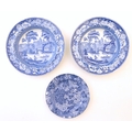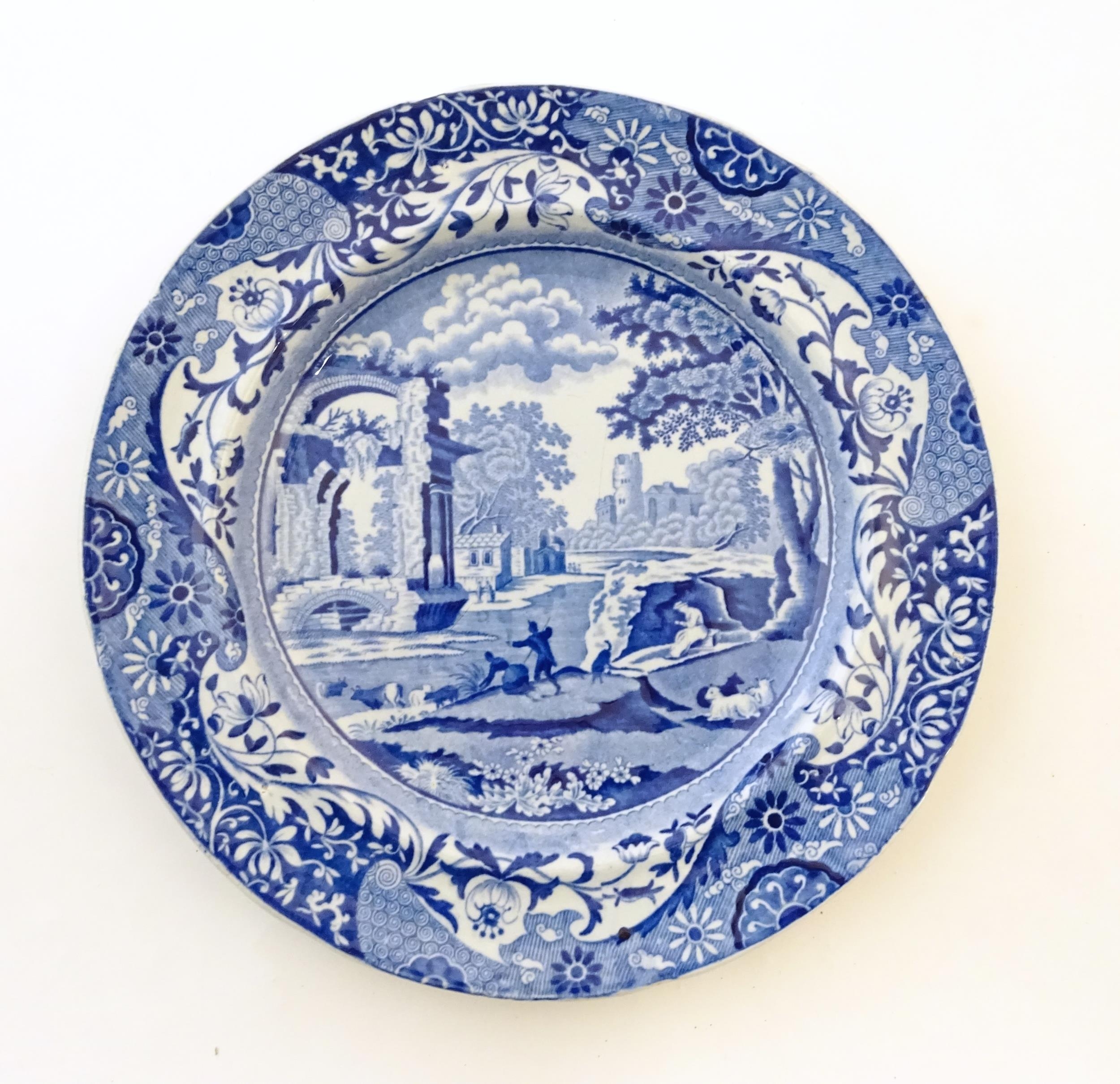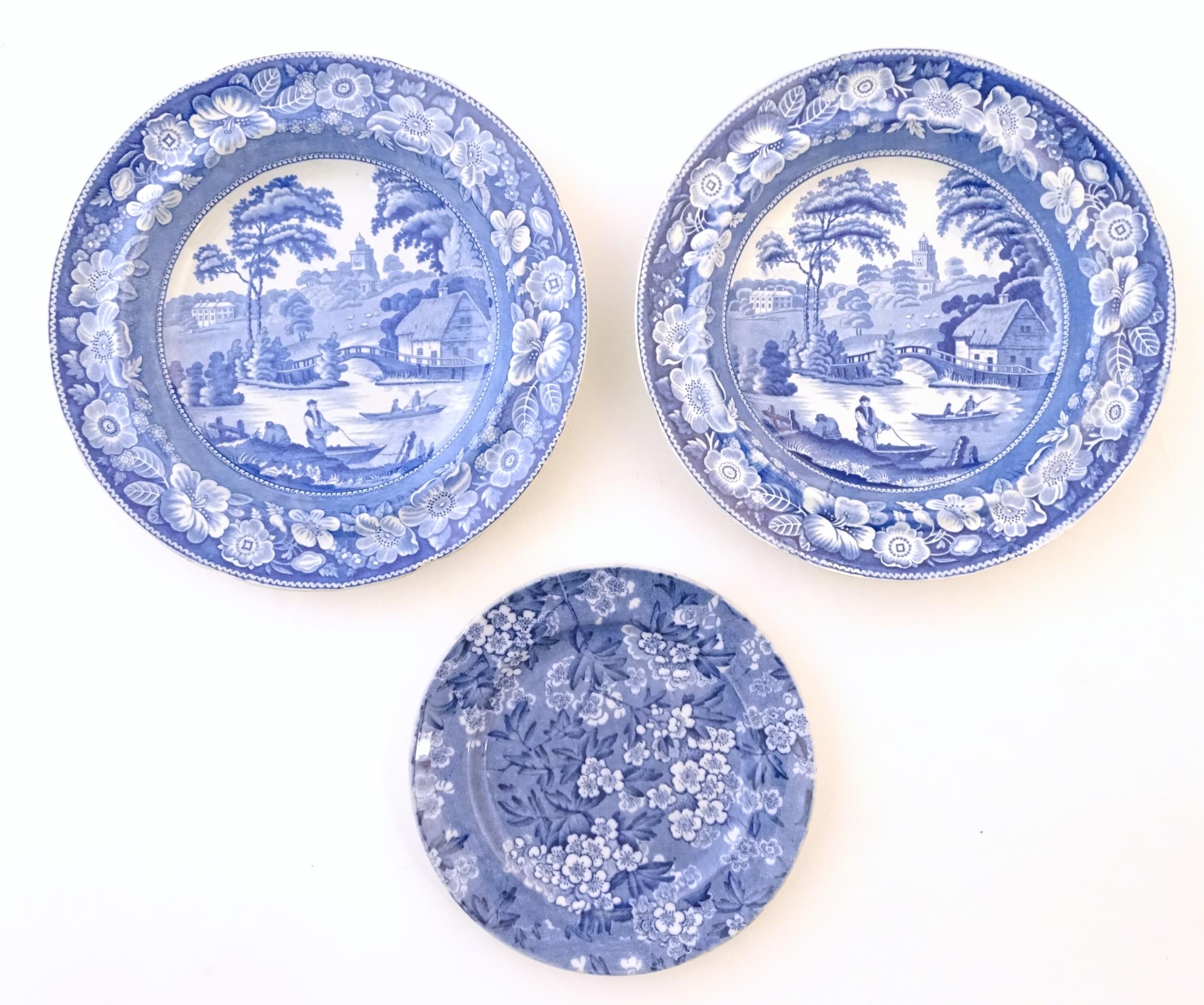 A quantity of assorted blue and white wares, to include two dished plates depicting a river scene with figures in boats by a bridge with a thatched cottage and church beyond, with a floral border; two Spode style blue and white plates with chinoiserie style decoration depicting a landscape scene with a gothic castle, and a plate in the pattern Blue Italian. Together with a small plate in the pattern May Blossom. Approx. 9 3/4" diameter (6)