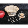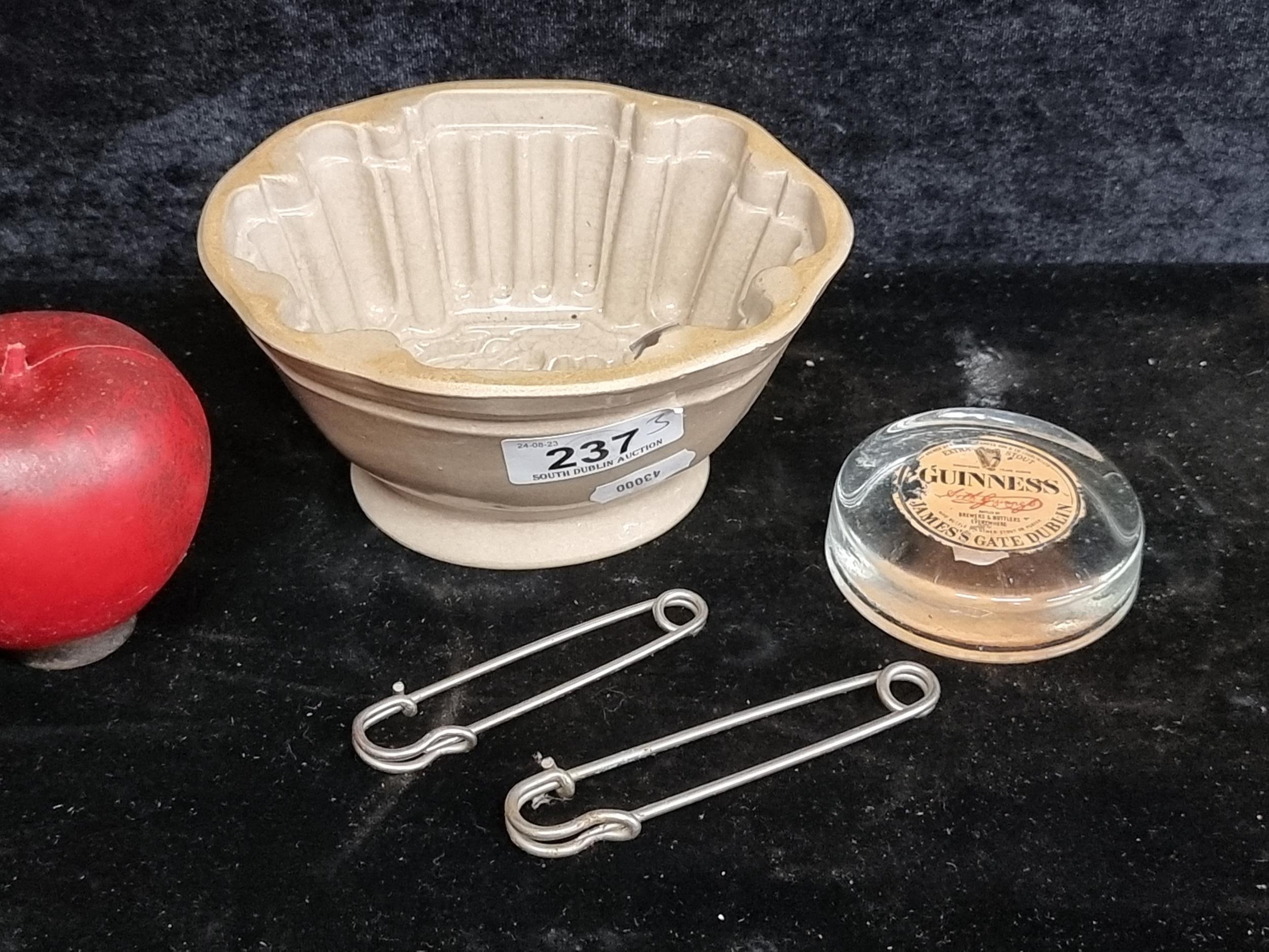Four items including a stoneware jelly mould and a Guinness glass paperweight. With two large steel nappy pins.