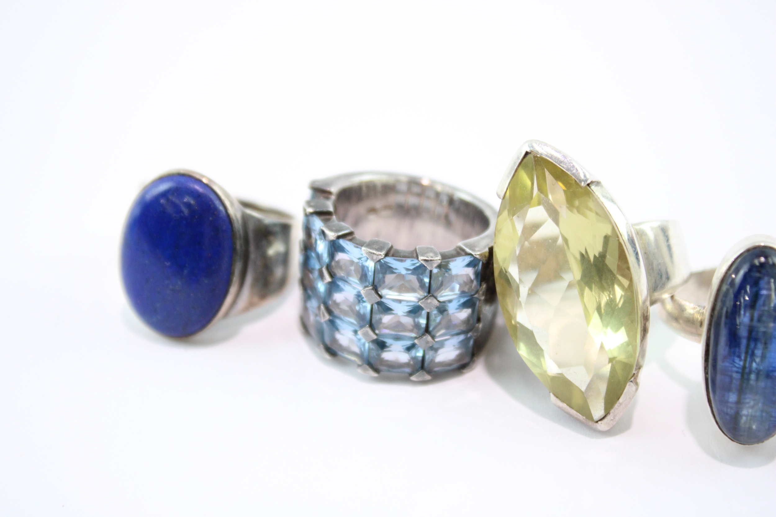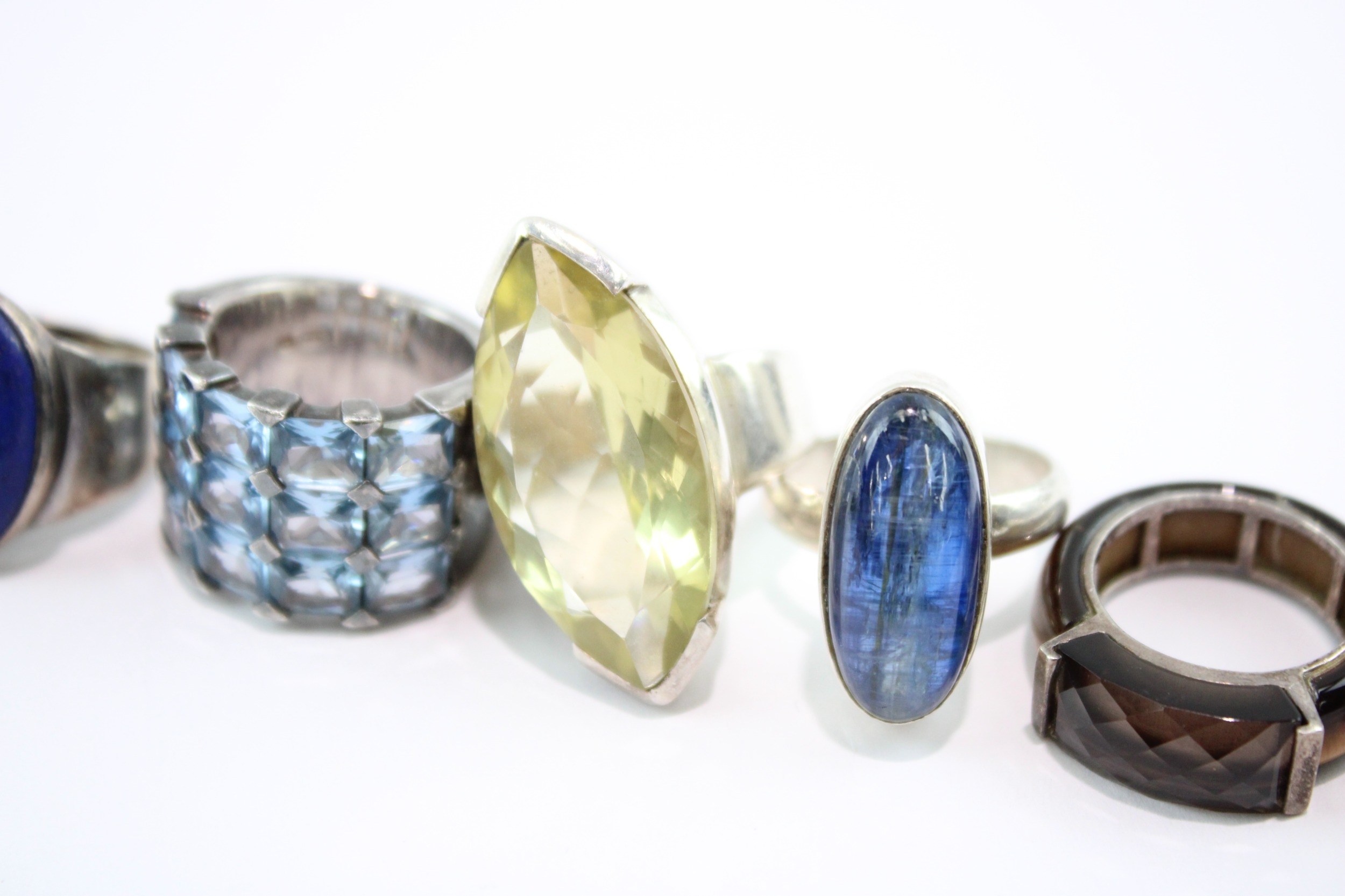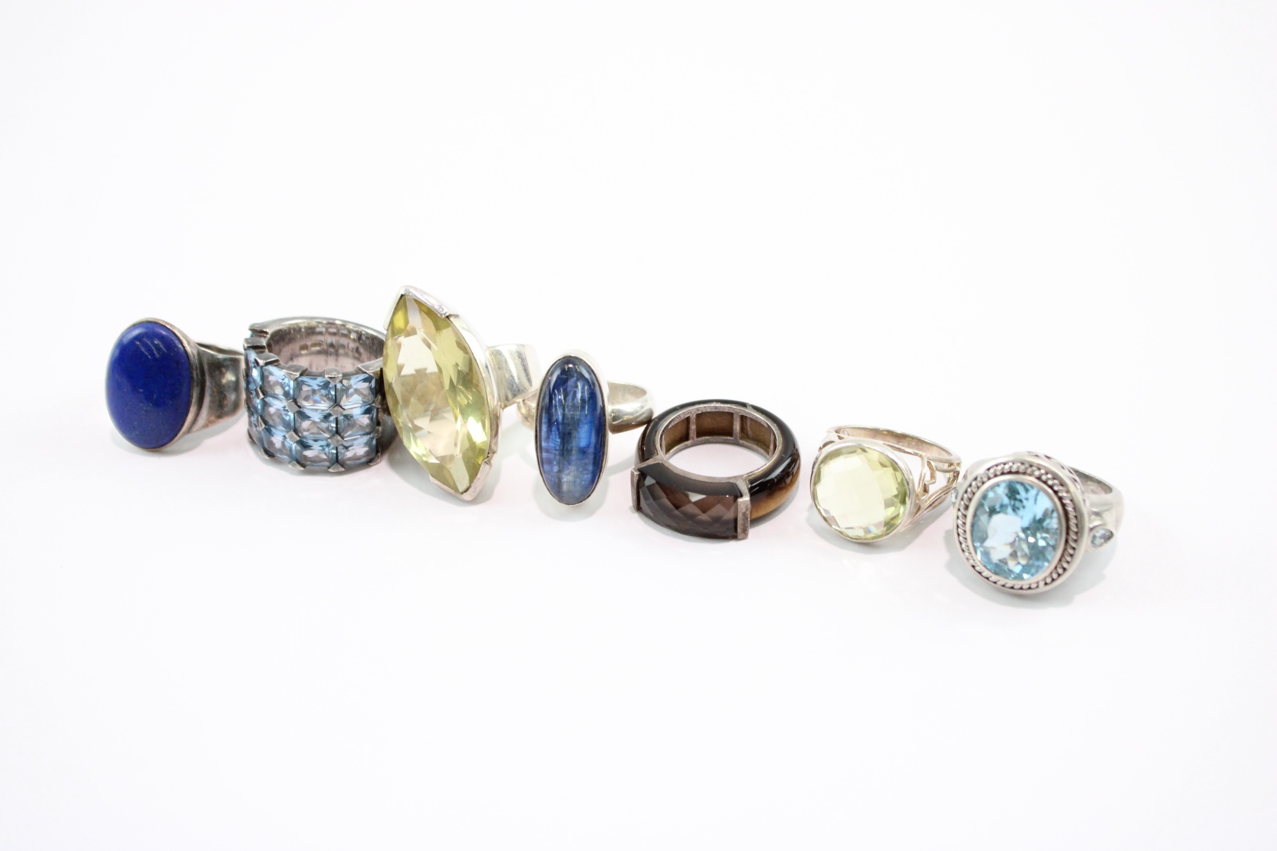 Collection of Sterling Silver Gemstone Rings, inc. Tigers Eye, Lapis Lazuli x 7 (77g)