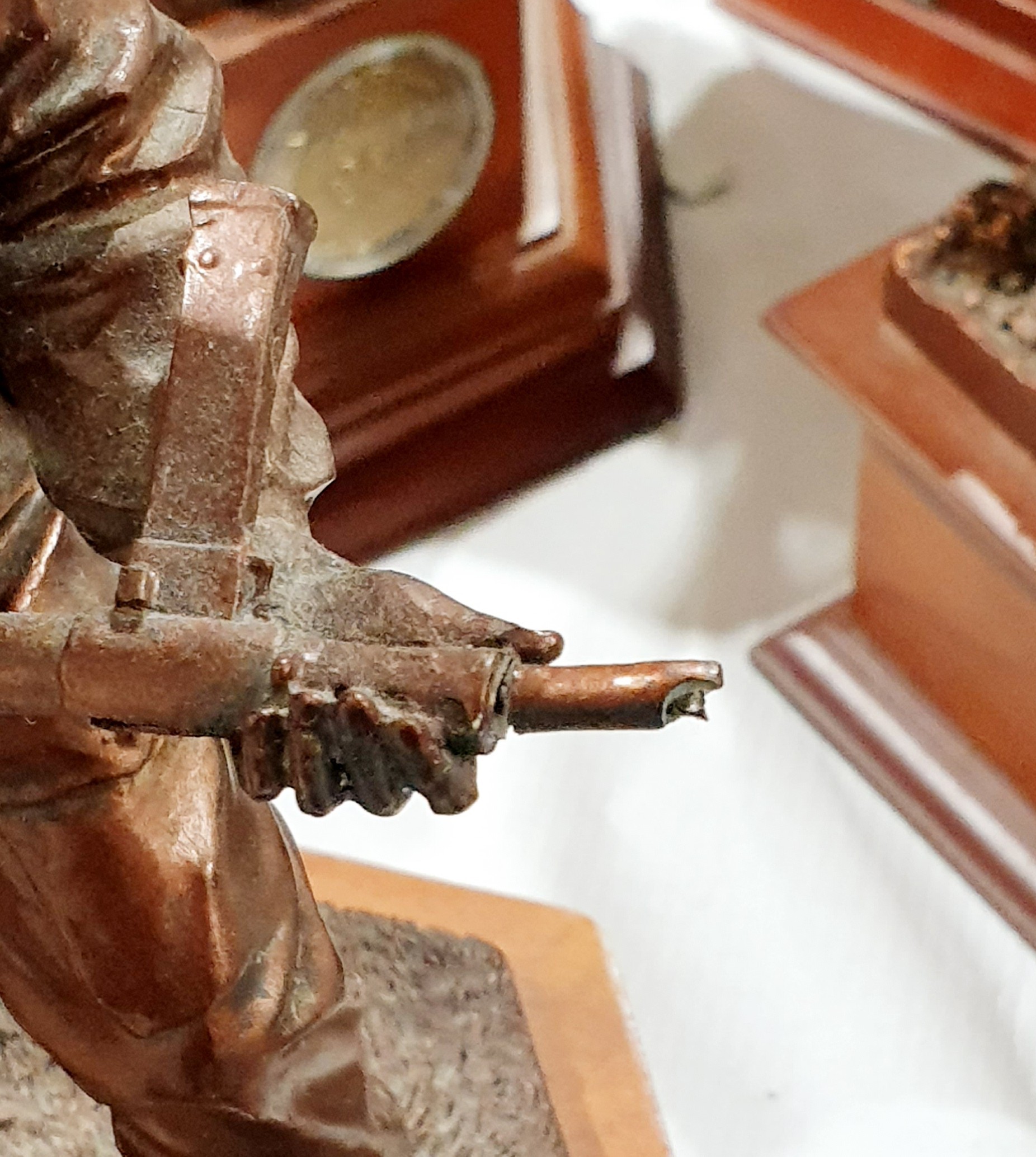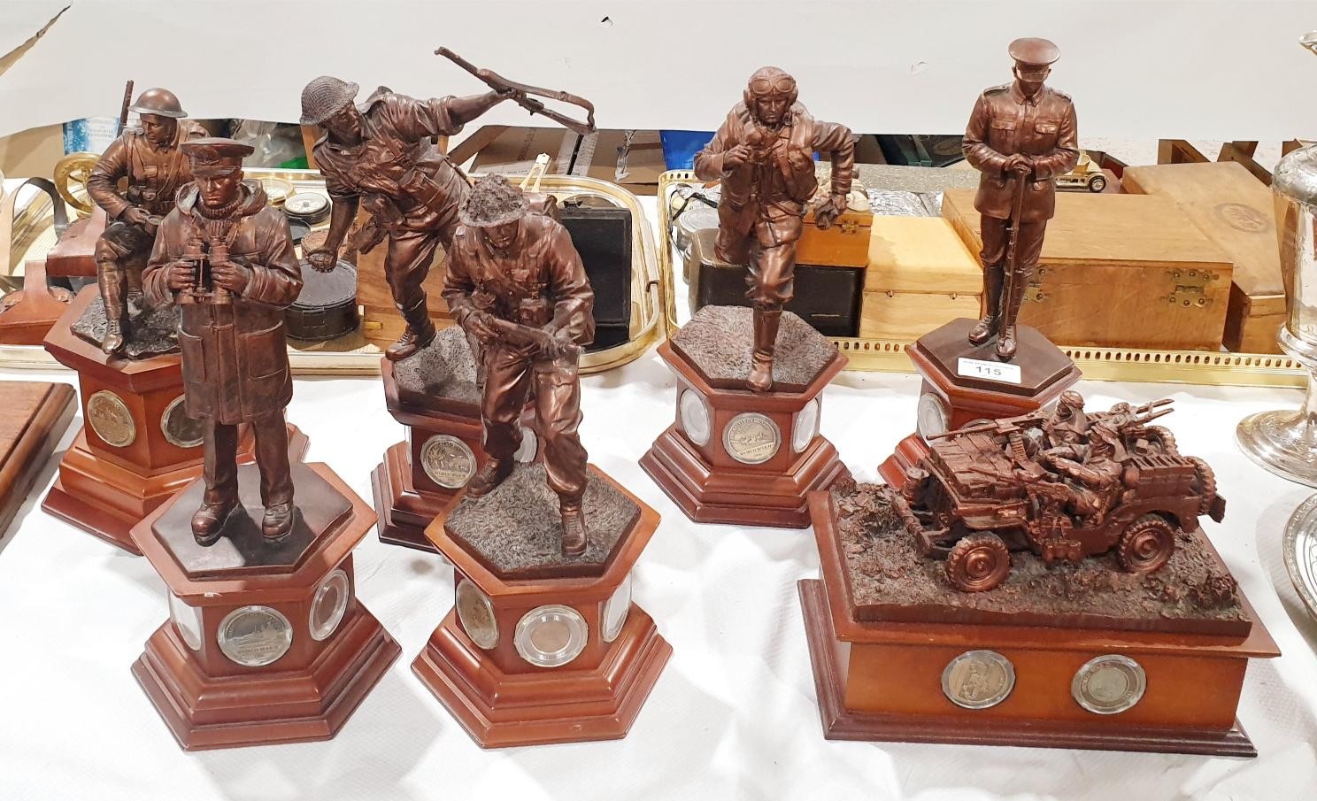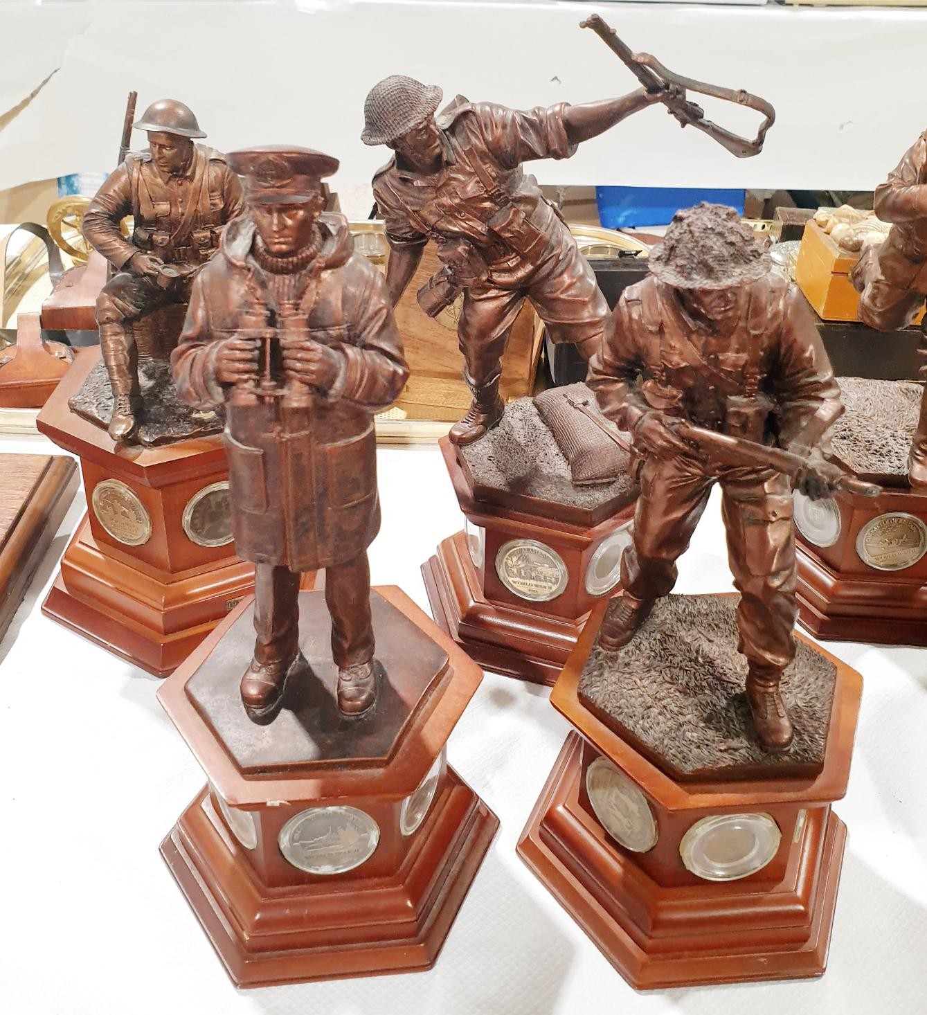 Seven Danbury Mint resin bronze effect World War I and World War II figures, two A/F, the tallest 33.5cm. No shipping. Arrange collection or your own packer and shipper, please. Electricals are sold as scrap.