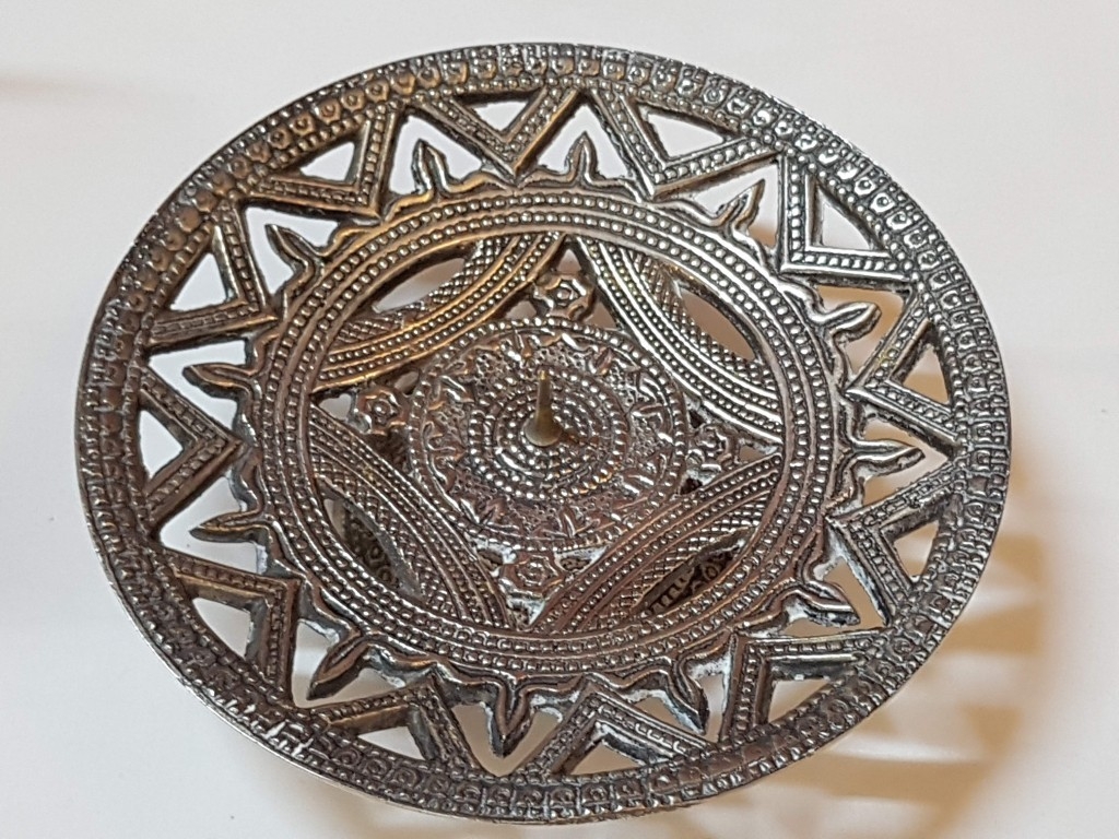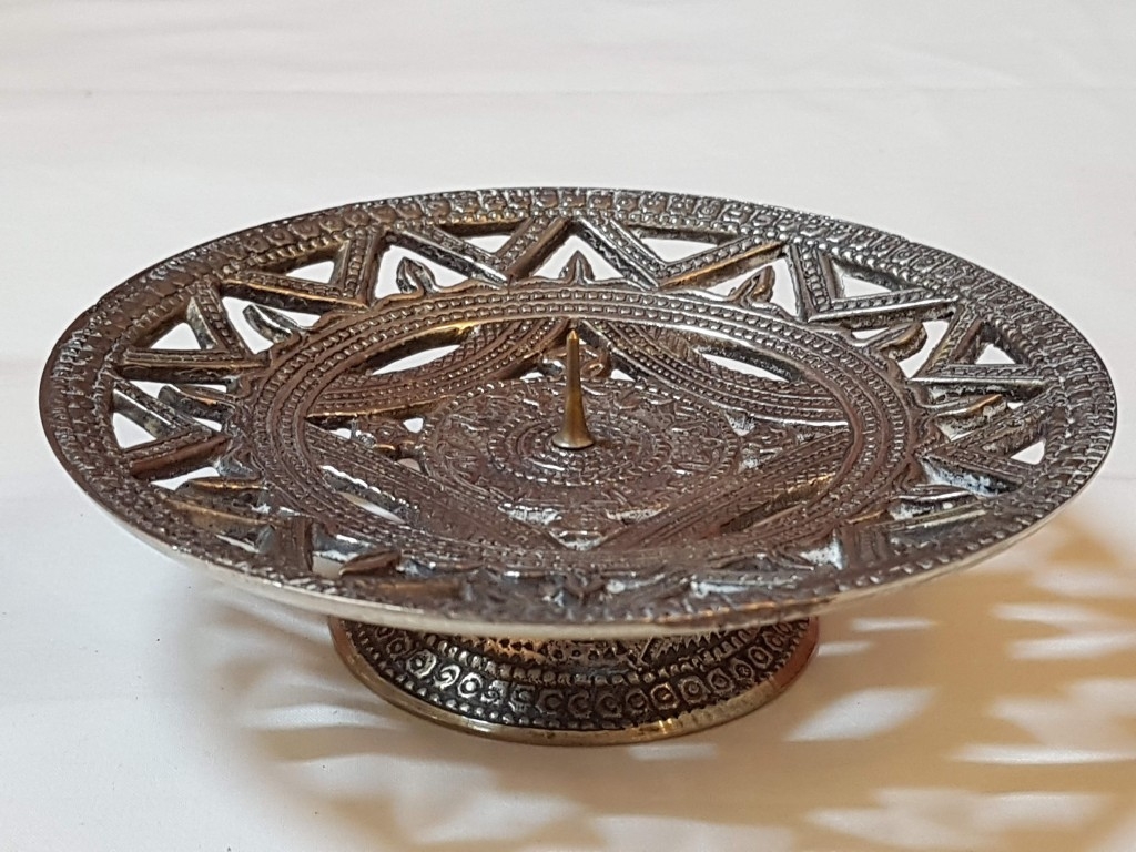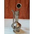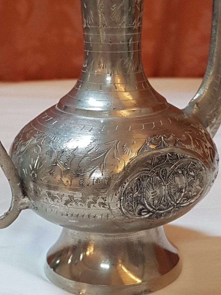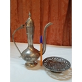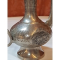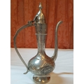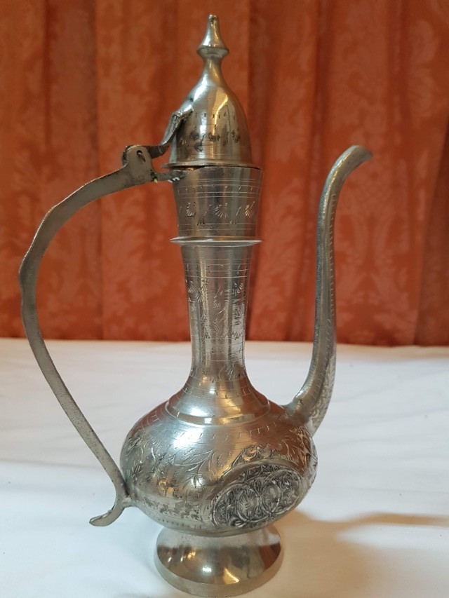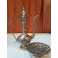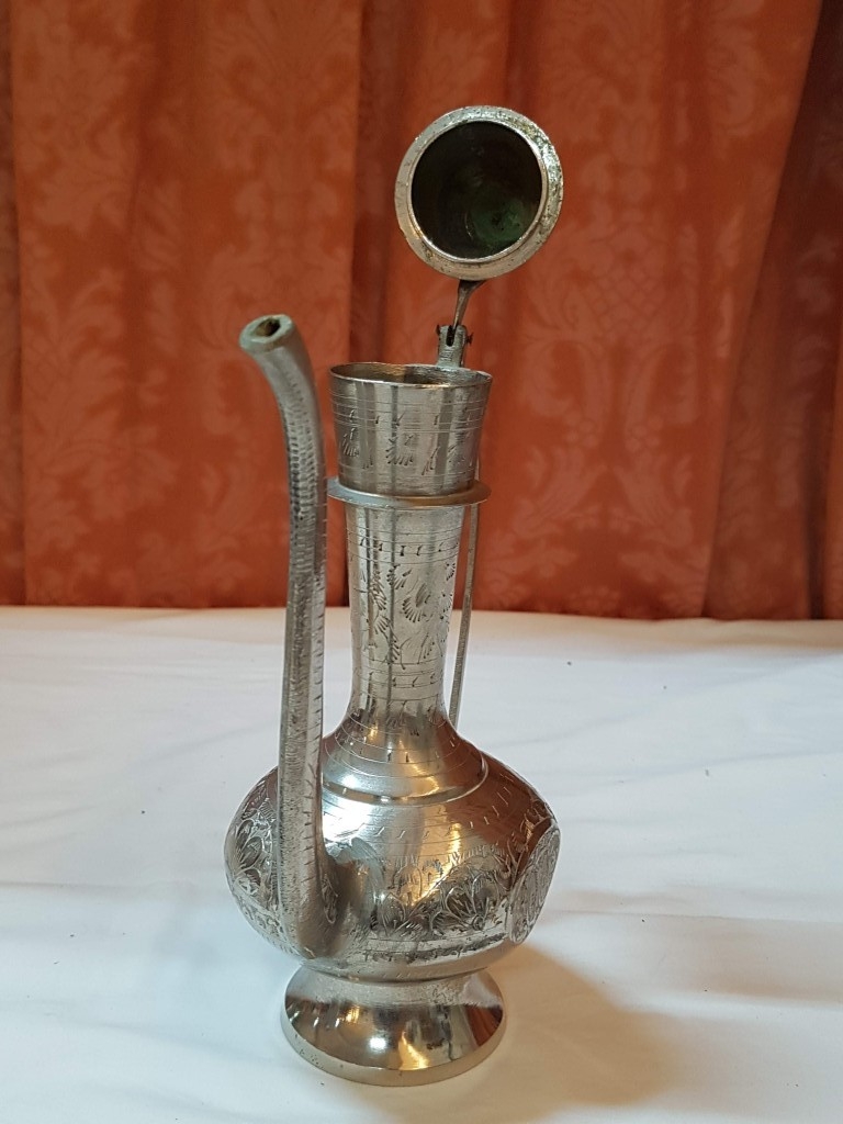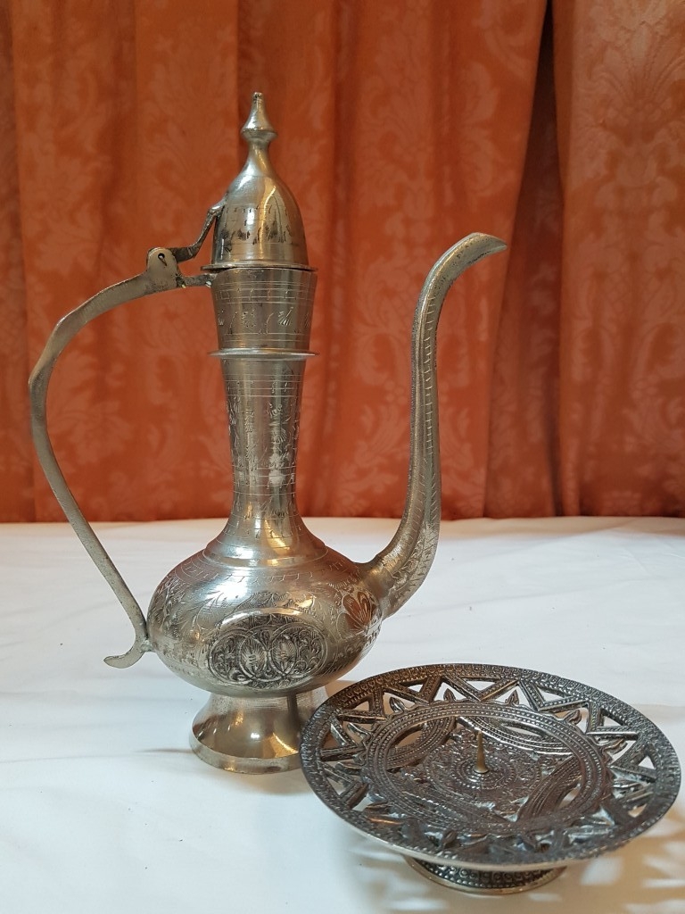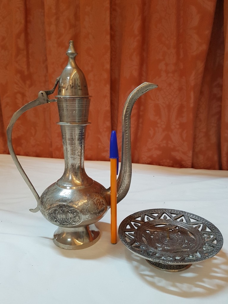 Traditional Oriental White Metal Coffee Pot (Approx. H: 26cm) and Candle Holder (Approx. H: 3.5cm Ø: 12cm), High Ornate Oriental Pattern. (2)