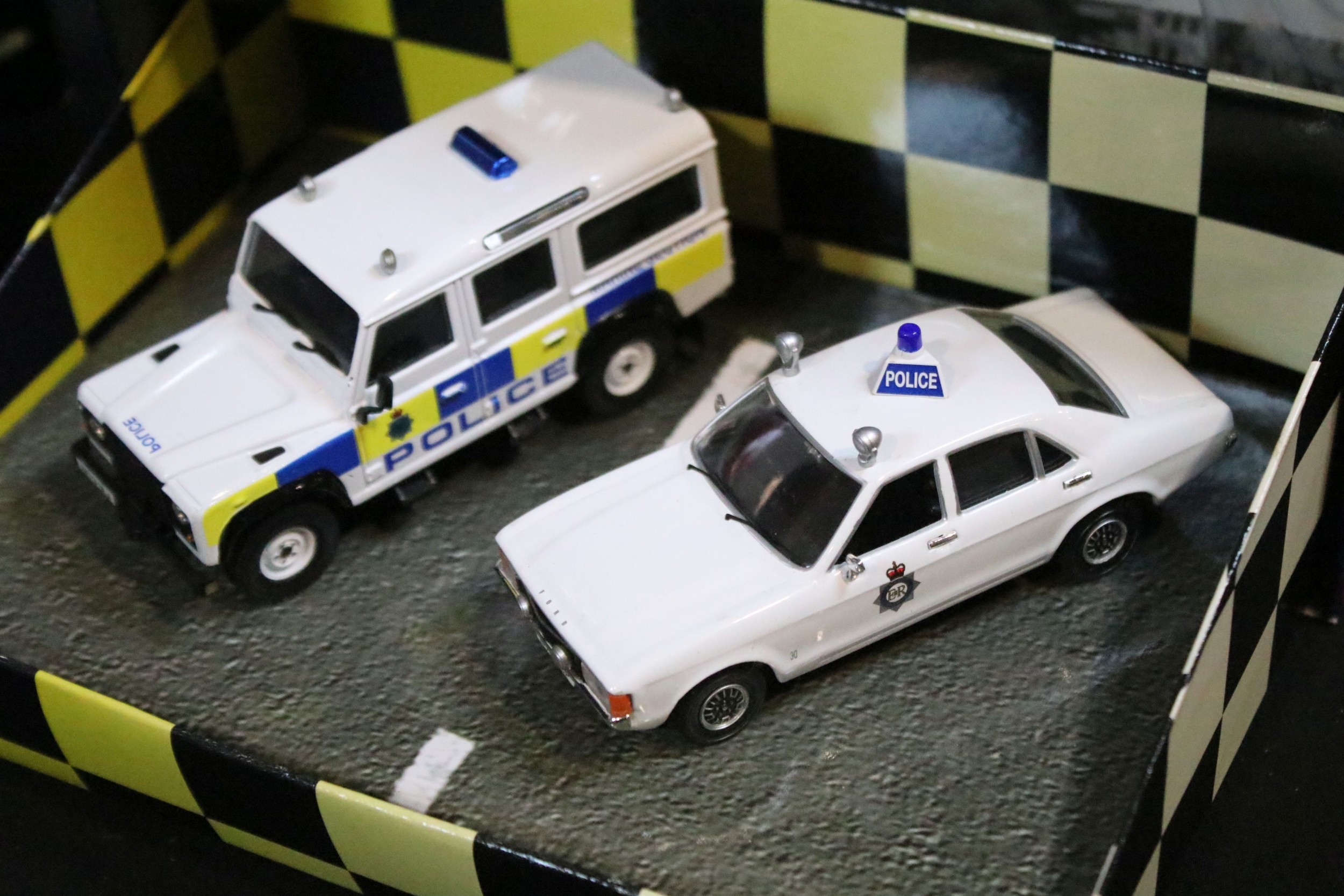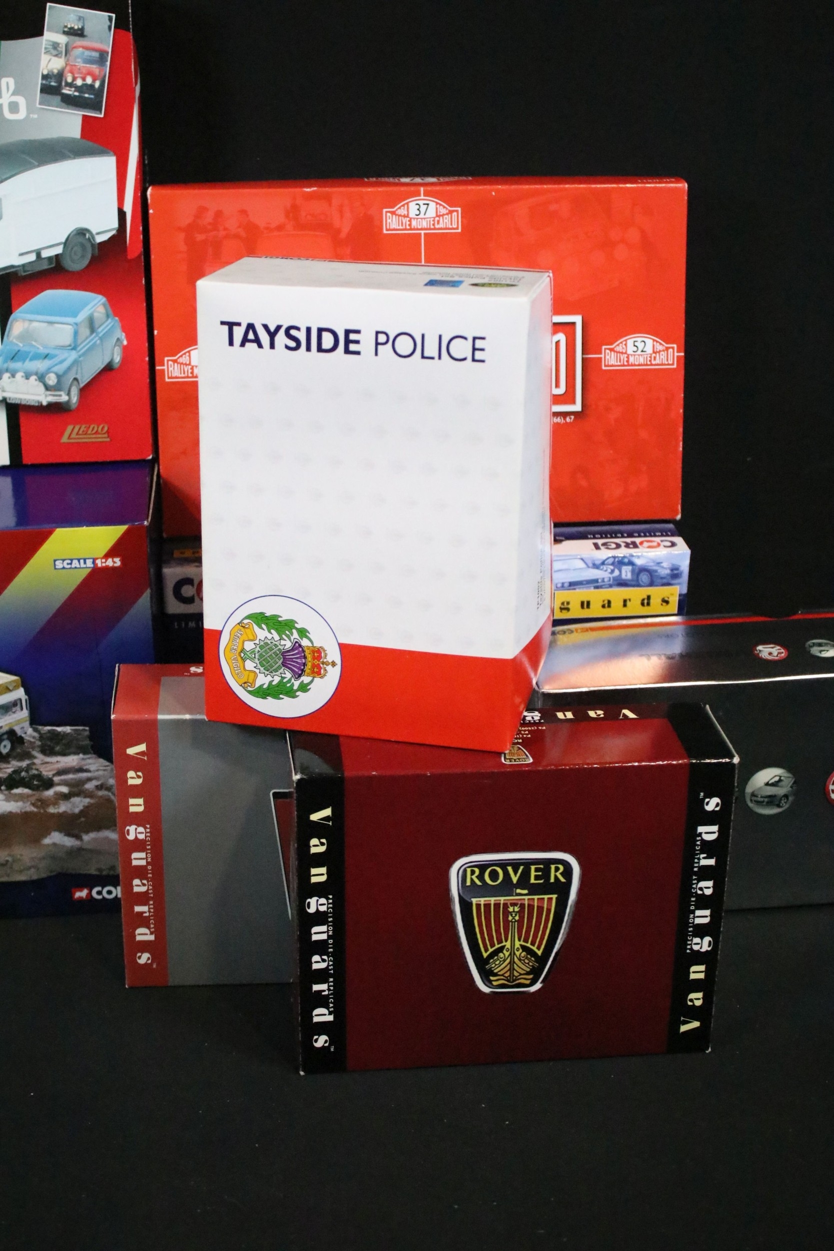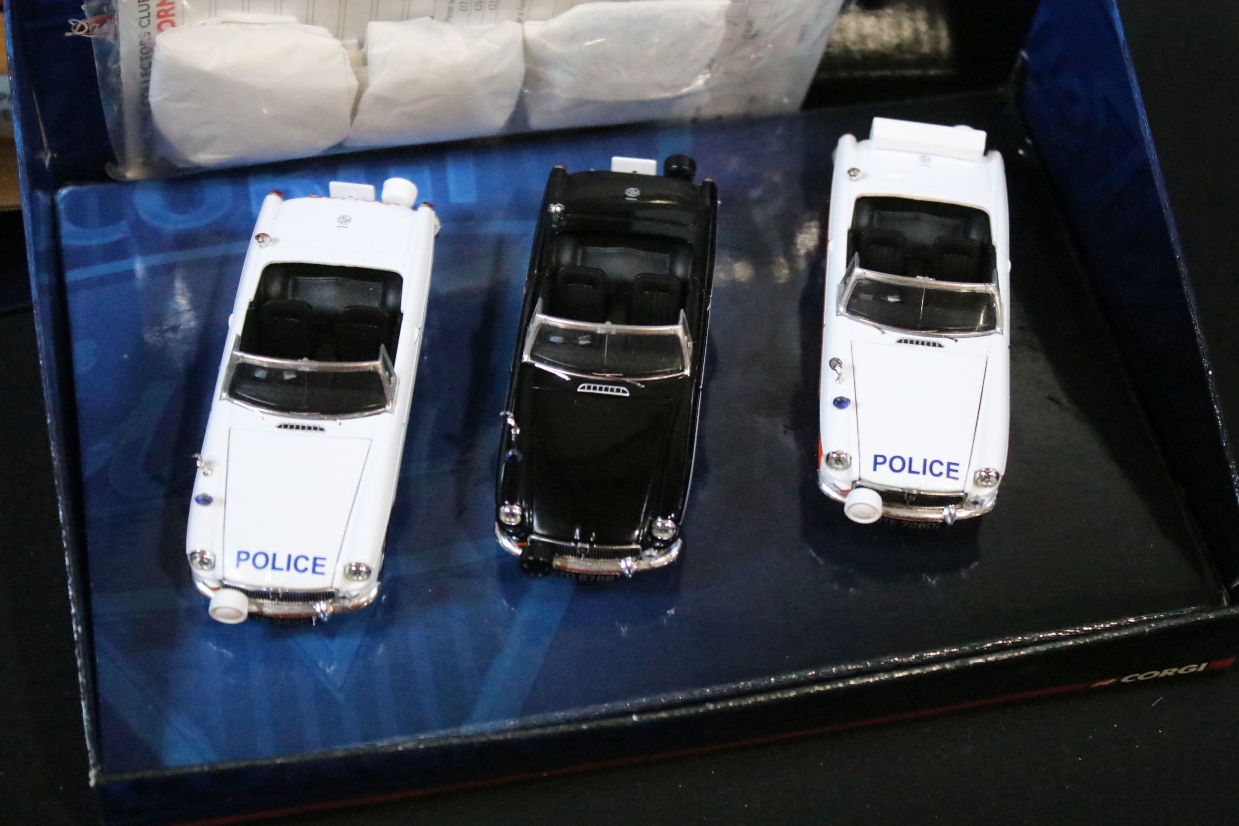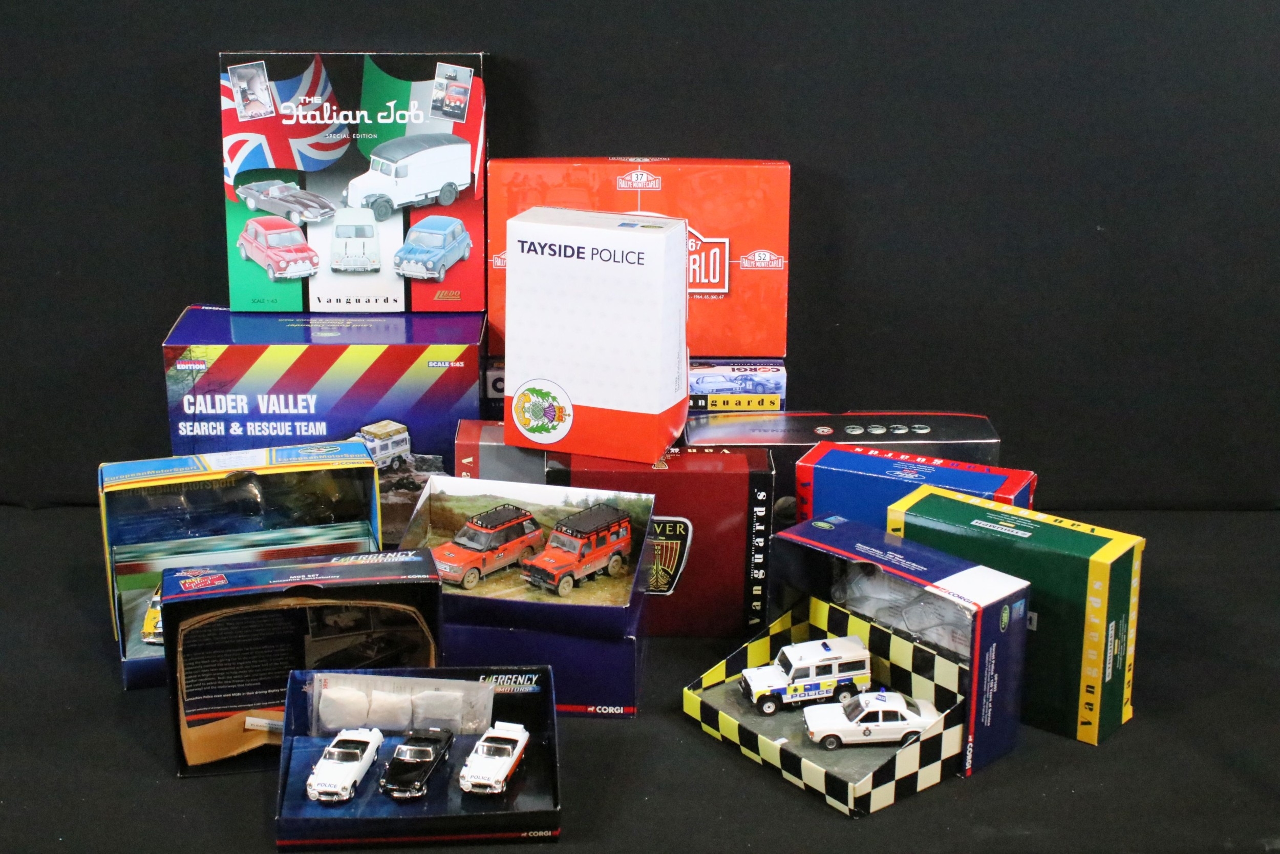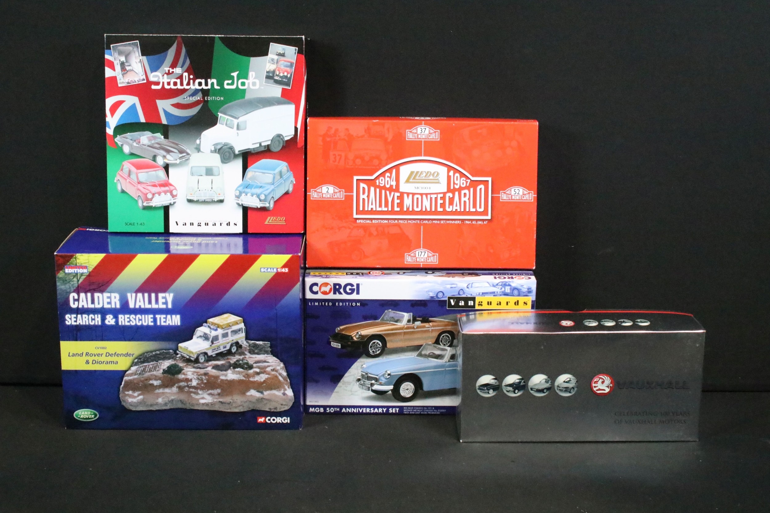14 Boxed Corgi / Lledo Vanguards and related diecast model sets to include MG1002 MGB 50th Anniversary Set, DP1002 Dorset Police 150 Years Of Service, RC1003 Rover Set, TP1002 Tayside Police Set, IJ1005 The Italian Job Five Piece Set, CV1002 Land Rover Defender & Diorama, LC1003 MGB Set Lancashire Constabulary, etc, all ex