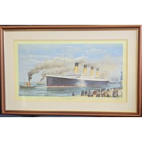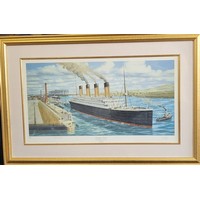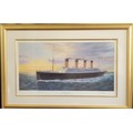 A Titanic print by Simon Fisher 'Cherbourg Bound', signed in pencil by the artist, Millvina Dean (the youngest and last living survivor) 61 x 93cm inc. frame.