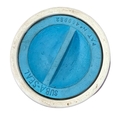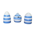 Three piece comprising a salt shaker, pepper shaker, and lidded mustard pot, traditional blue and white banded slipware, green should mark to mustard.