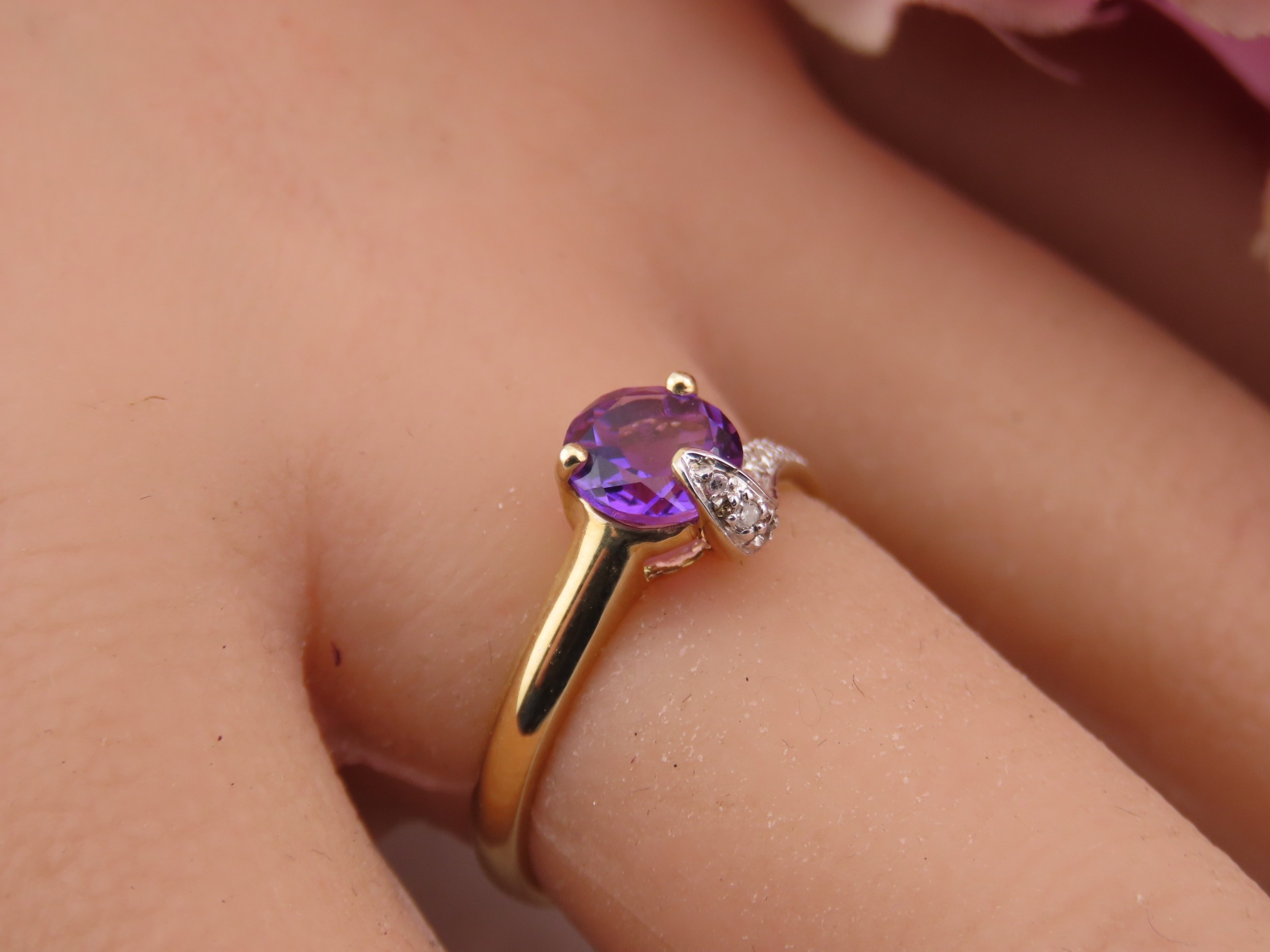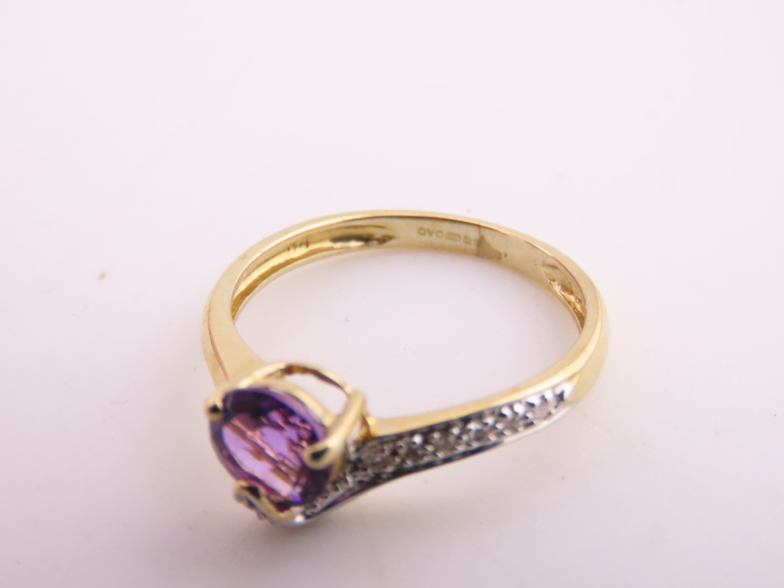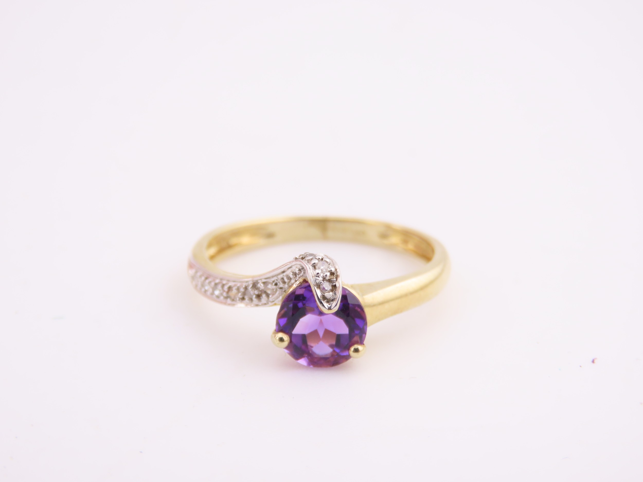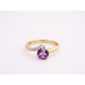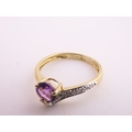 9ct Gold Amethyst and Diamond Ring. A delicate 9ct gold ring set with a round cut amethyst accented by a small diamond detail, the slender shoulders tapering gently towards the setting on a plain polished shank. Ring size M. Gross weight 1.7 grams.