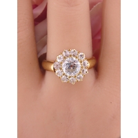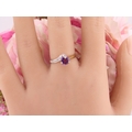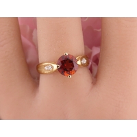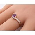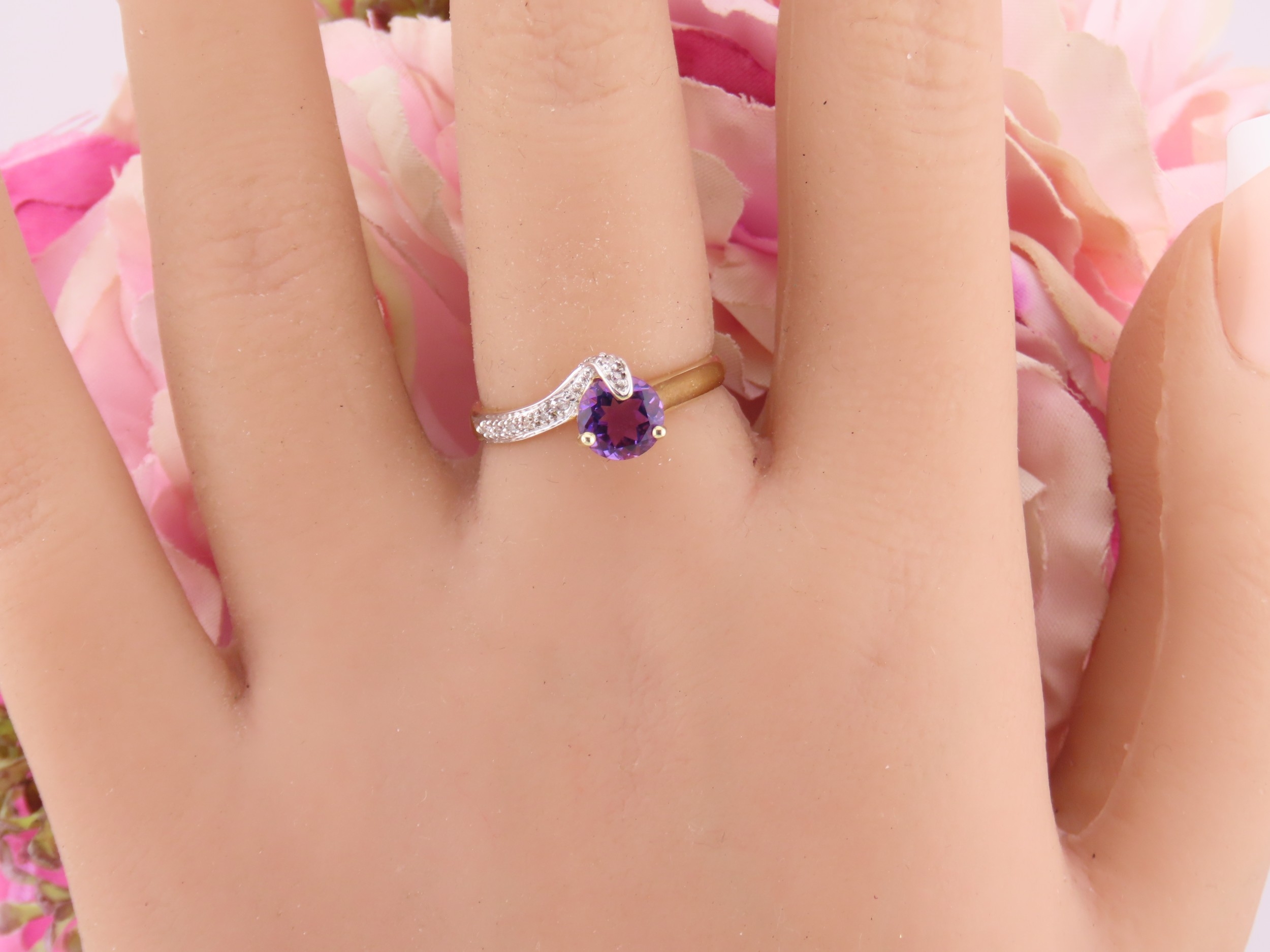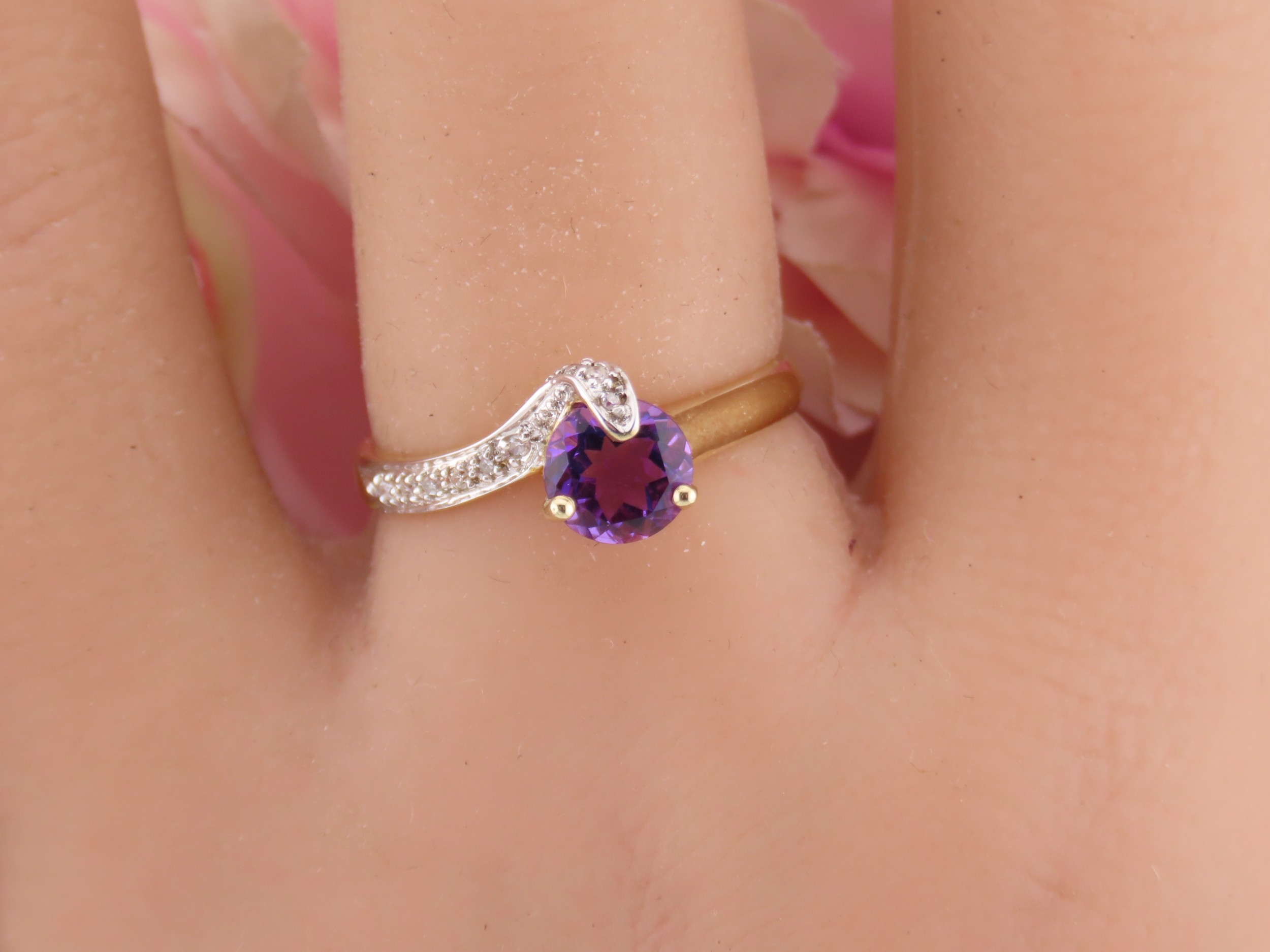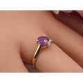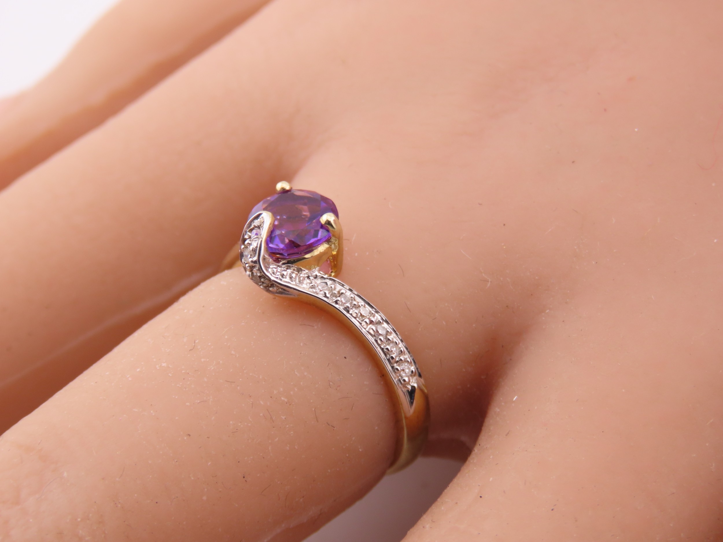 9ct Gold Amethyst and Diamond Ring. A delicate 9ct gold ring set with a round cut amethyst accented by a small diamond detail, the slender shoulders tapering gently towards the setting on a plain polished shank. Ring size M. Gross weight 1.7 grams.