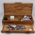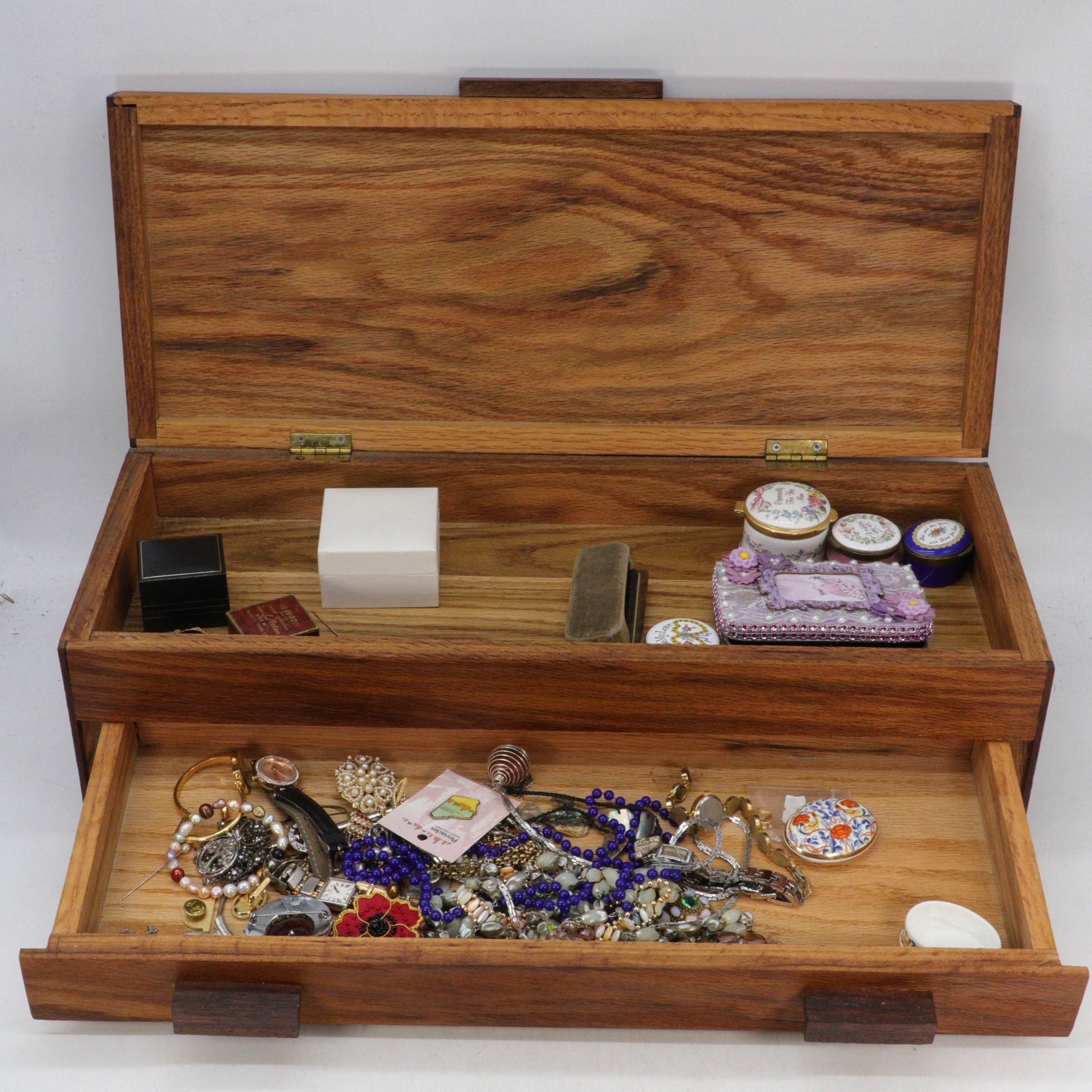 Large hand made box with contents of costume jewellery and enamel pill boxes etc