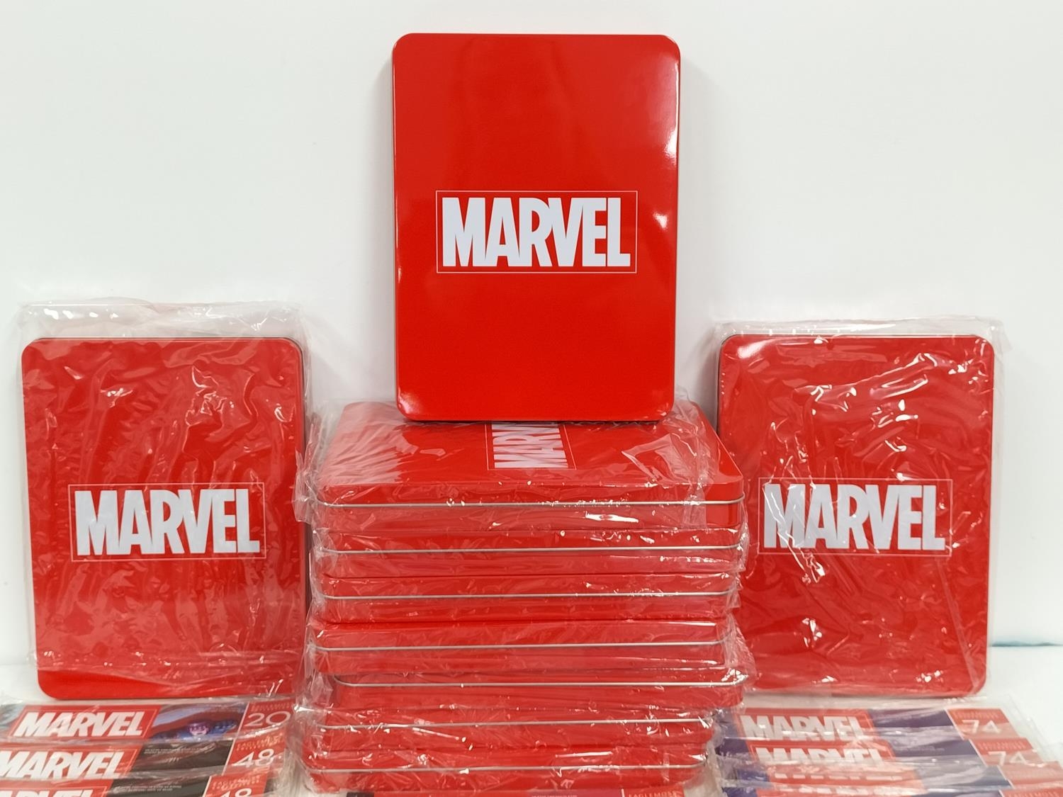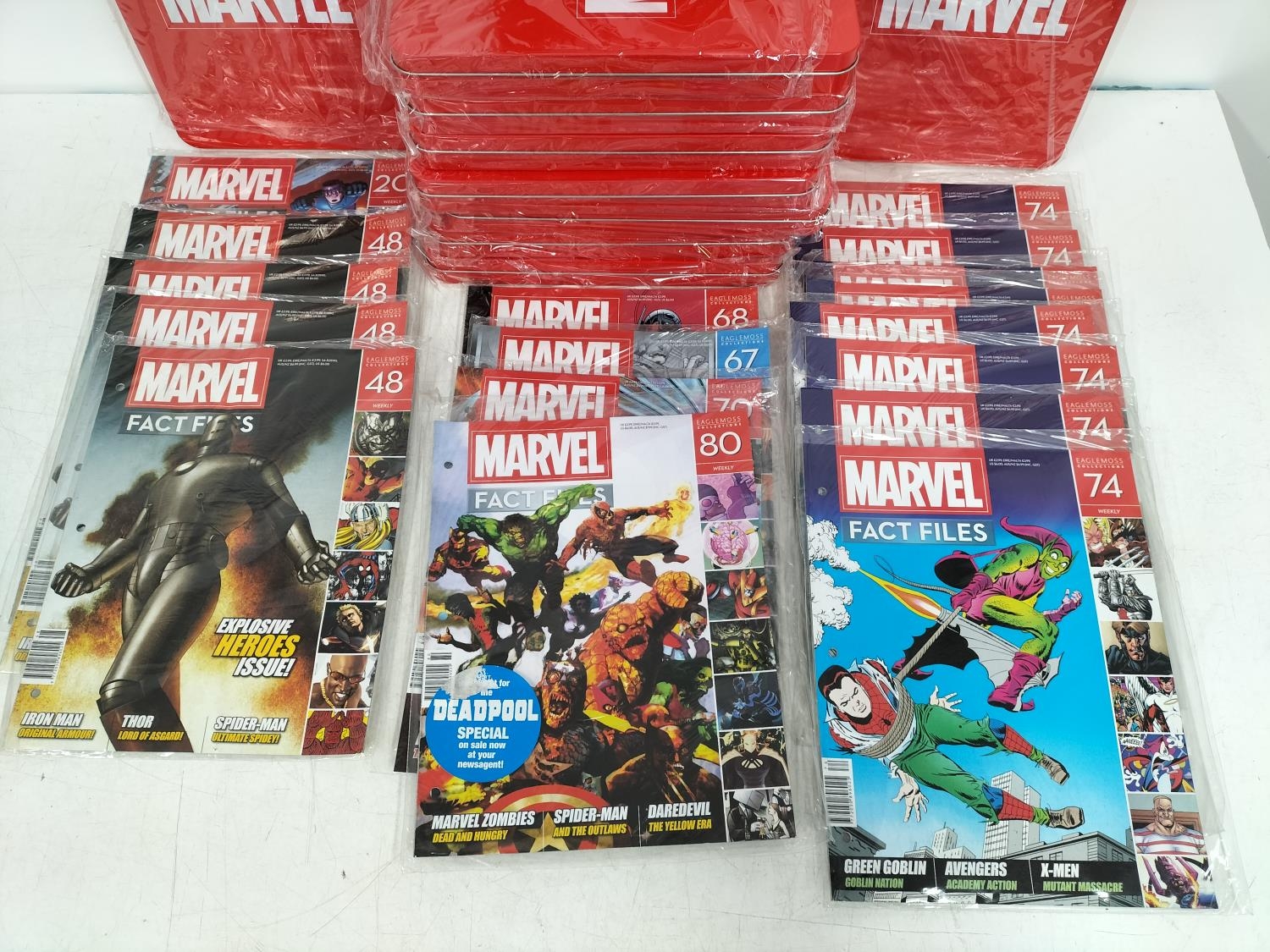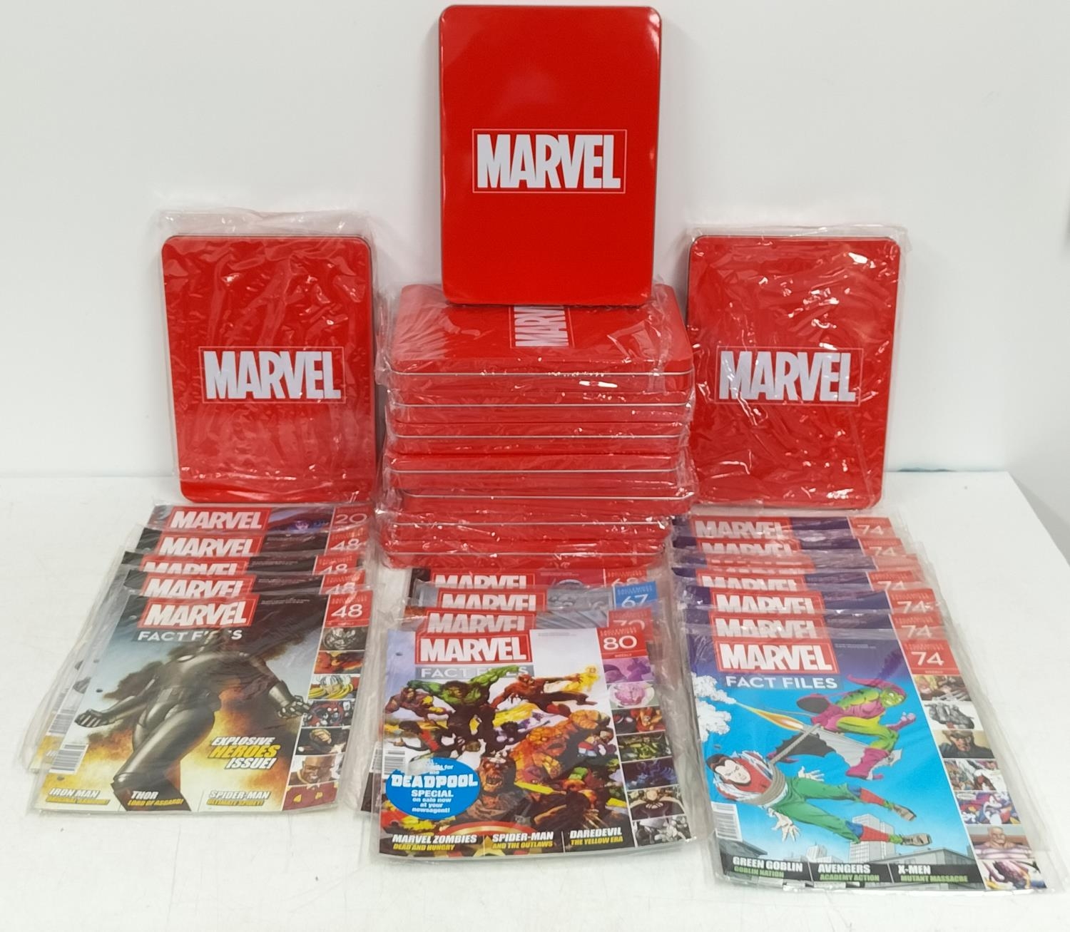 10 x Marvel Collector Tins plus a Collection of Fact File Magazines.
