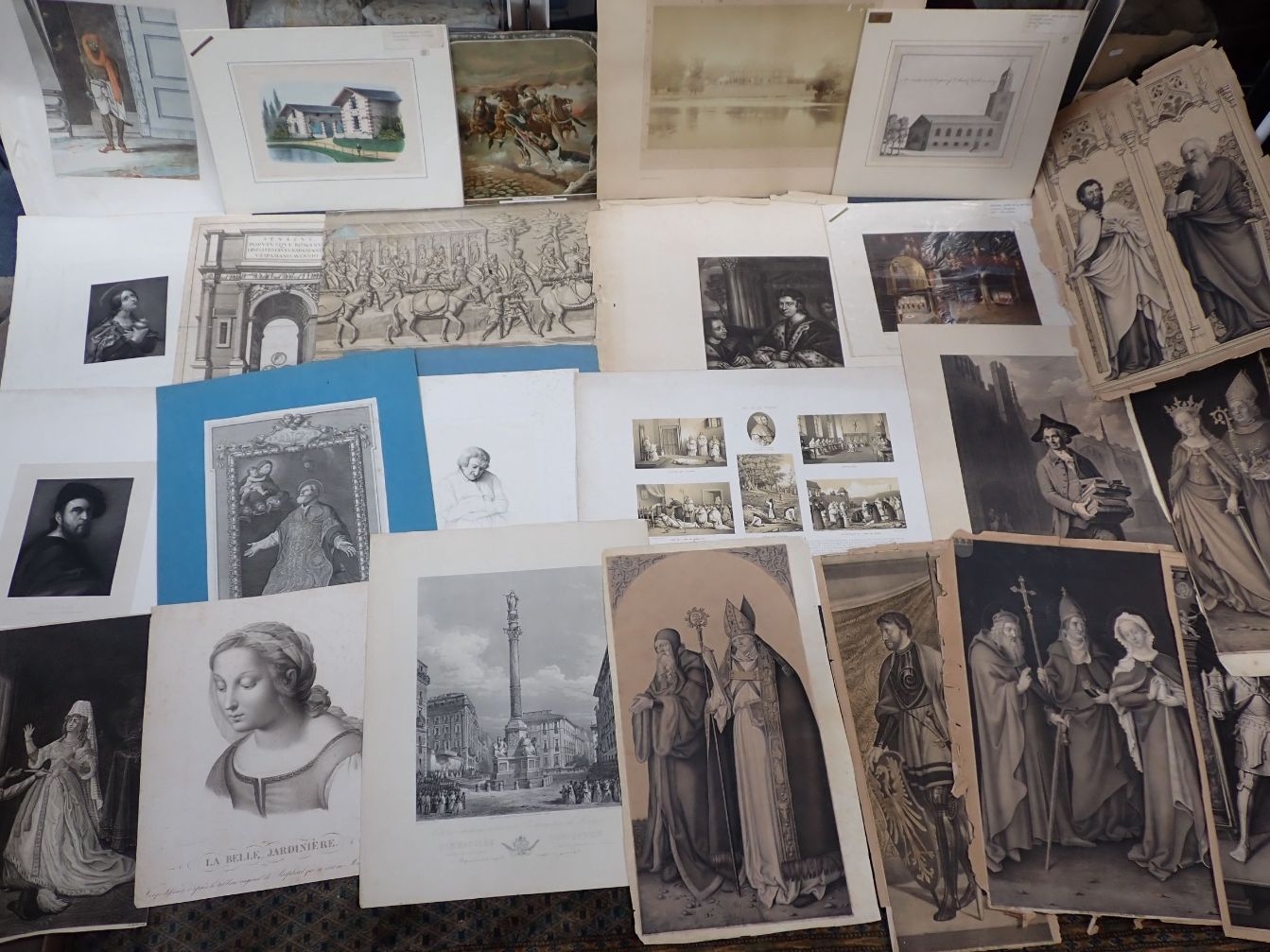 A FOLIO OF ENGRAVINGS AND OTHER PRINTS some of antiquarian architectural interest, reproductions of Northern Renaissance art, etc and a facsimile of John Nicholson, Bookseller