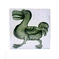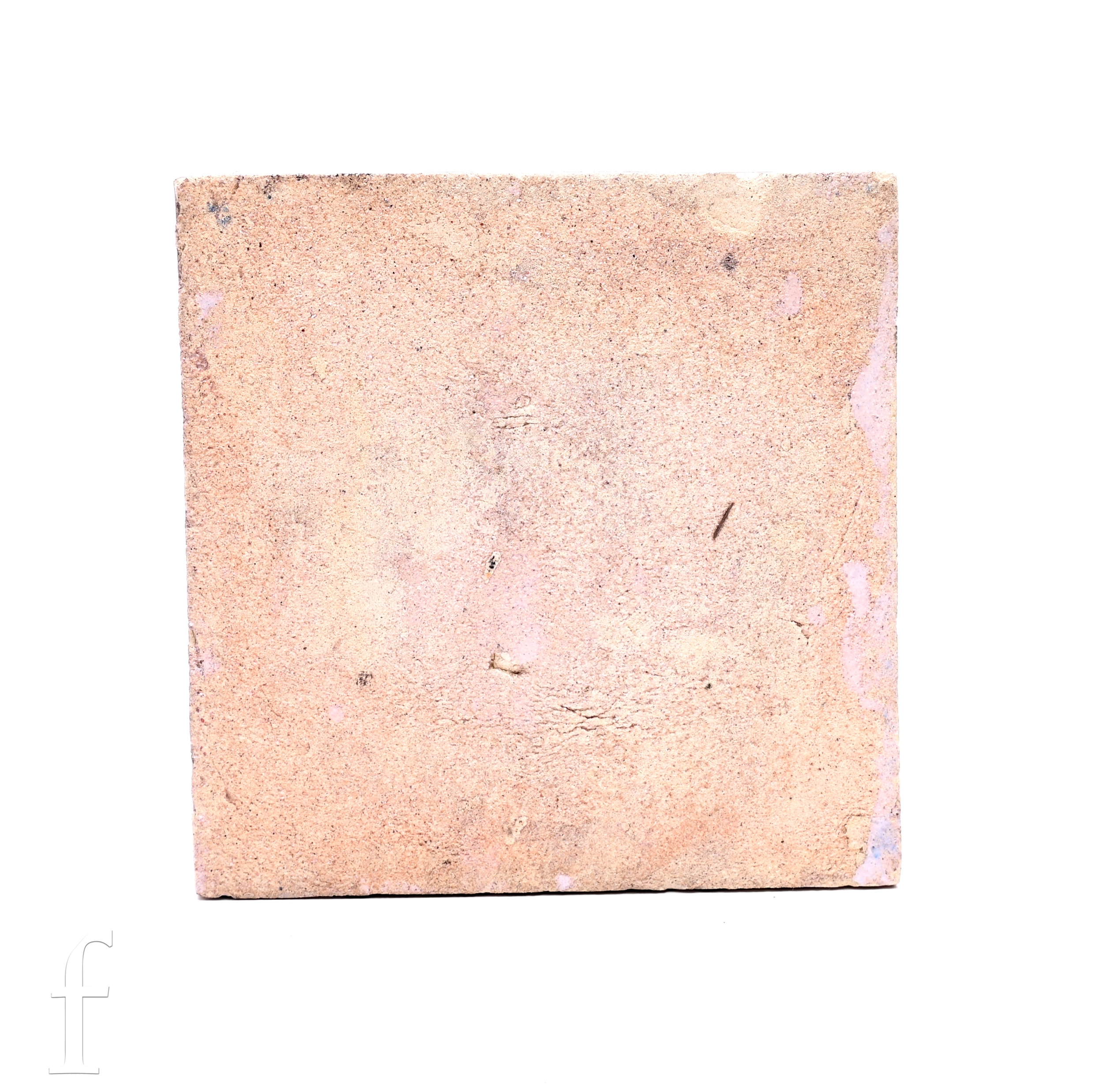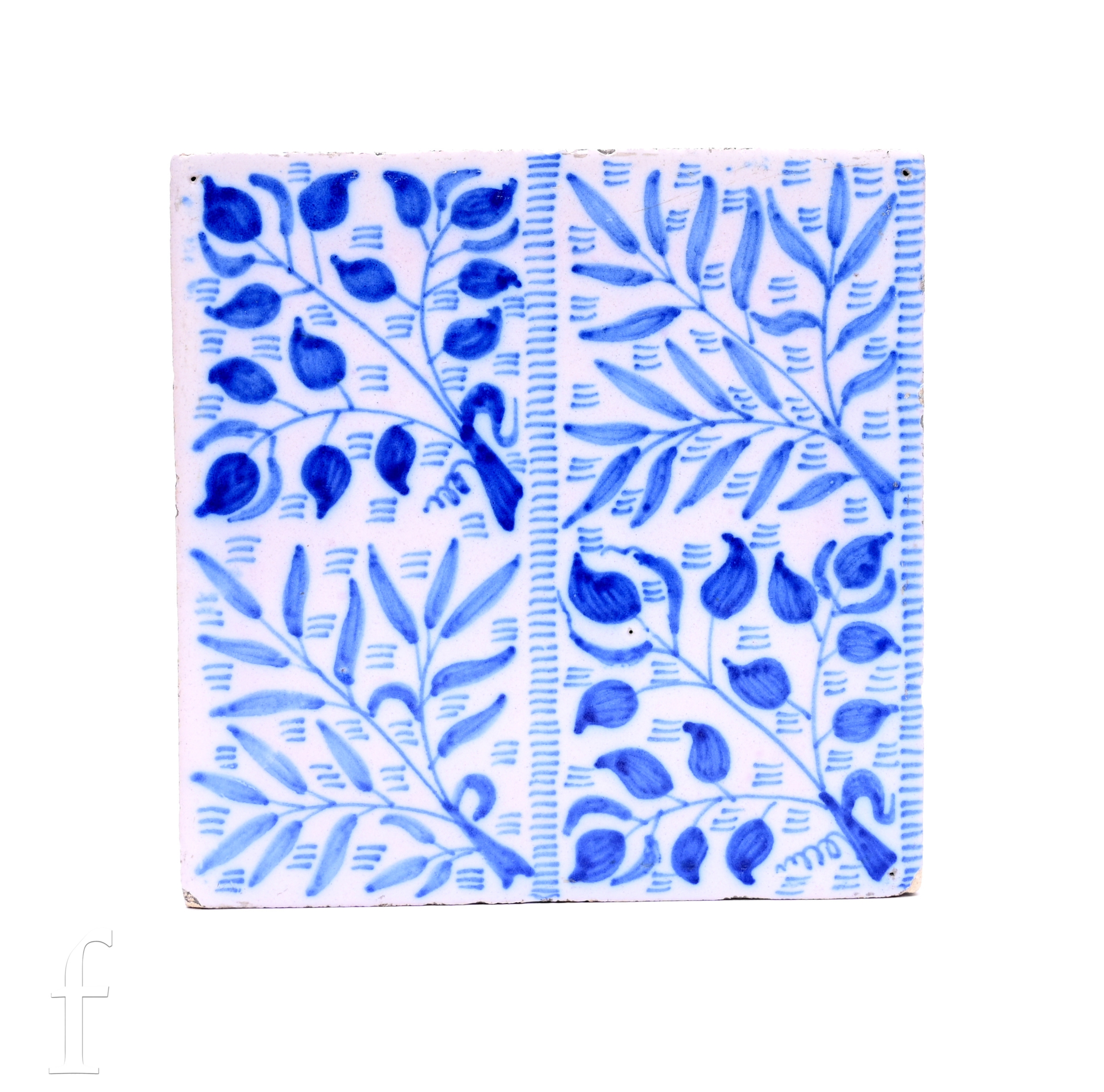 William Morris for Morris Marshall Faulkner & Company, a 'Bough' design blue and white decorated tile, circa 1870, quarter painted panels of leafy branches in tonal blue over opal ground 15.5cm x 15.5cm.