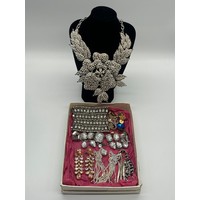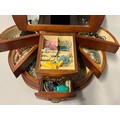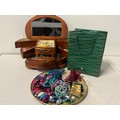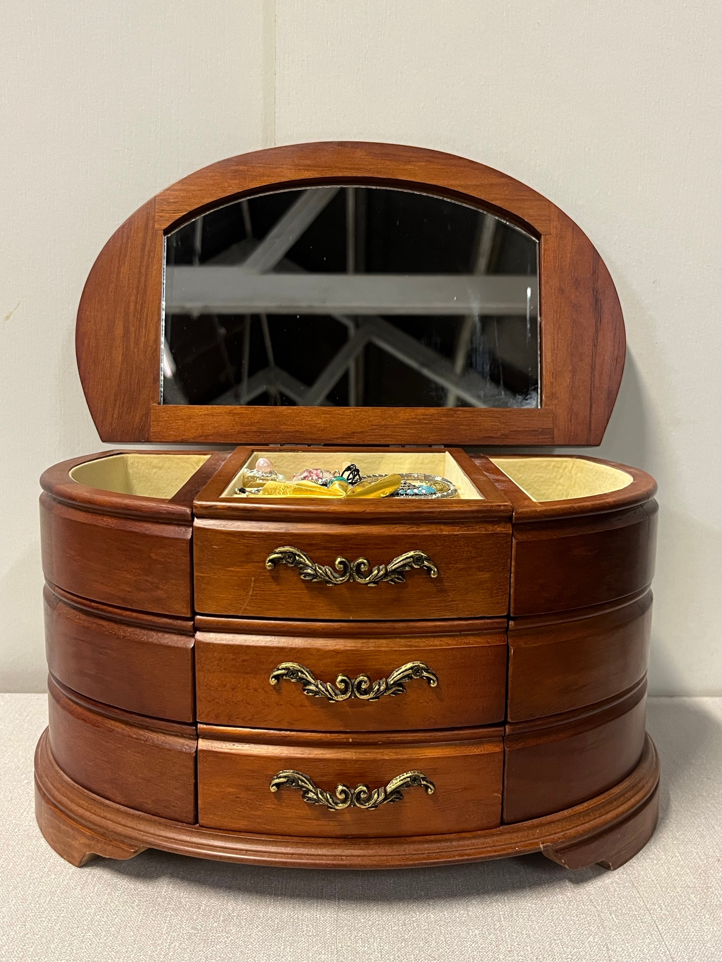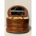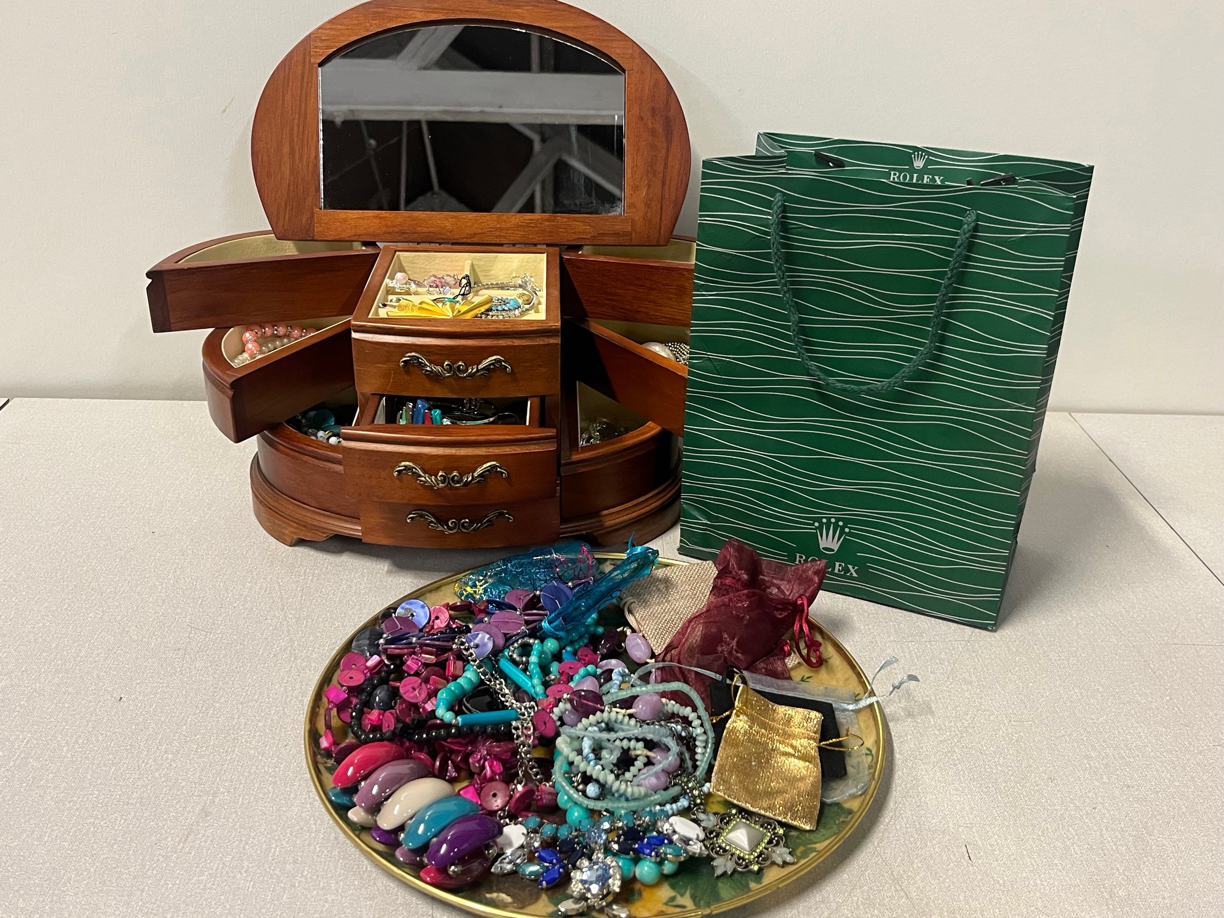 Mele designs burlwood oak finish multi drawer jewellery box along with qty of costume jewellery and Rolex bag.