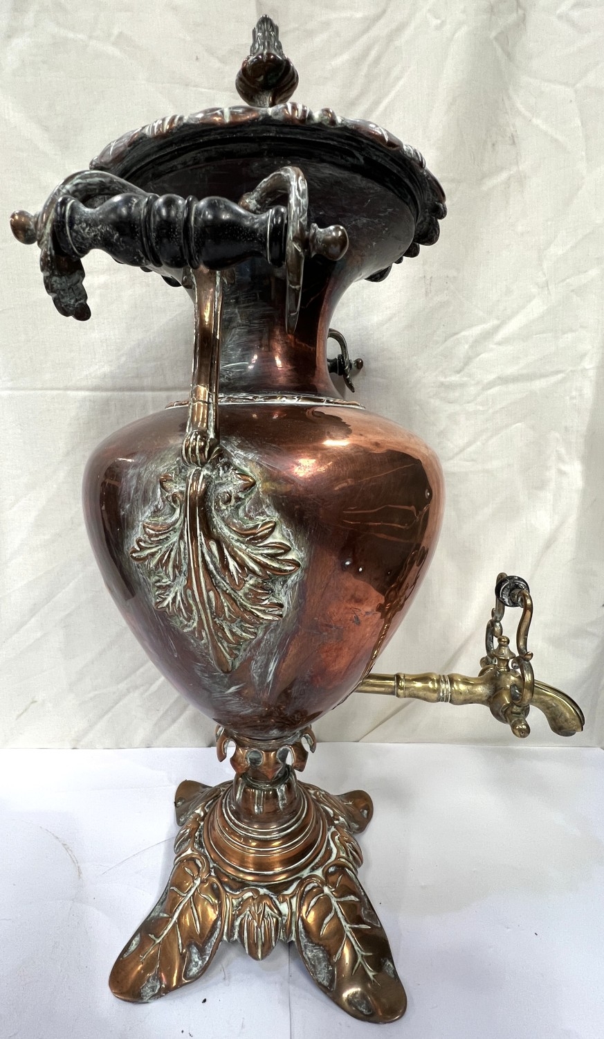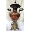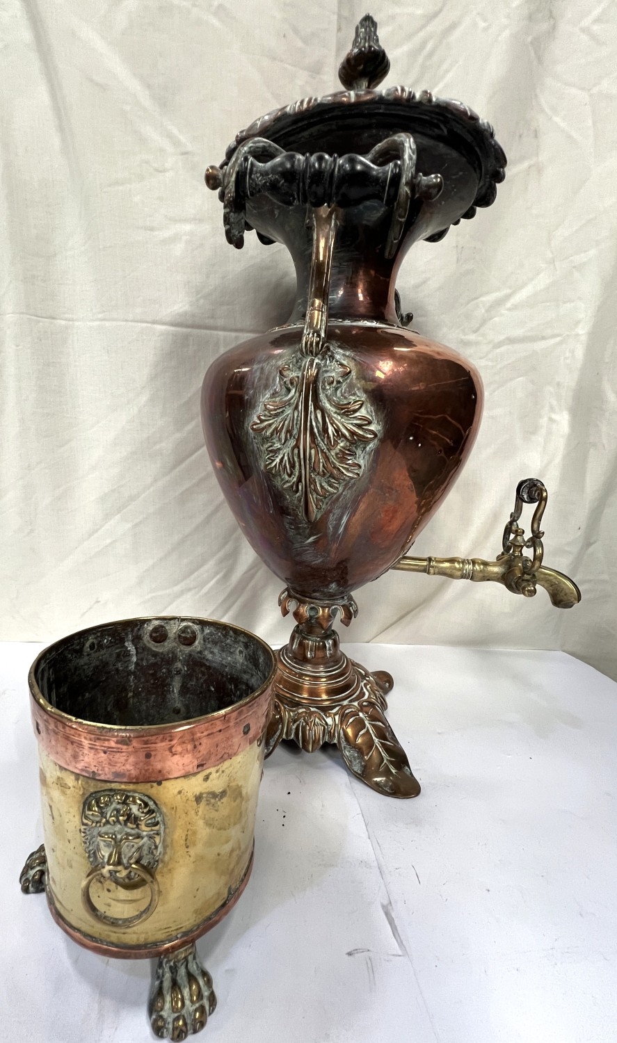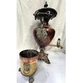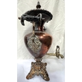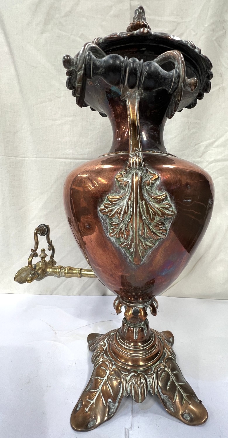 A large copper tea urn with floral and leaf decoration, ht. 57cm and a small copper and brass planter.
