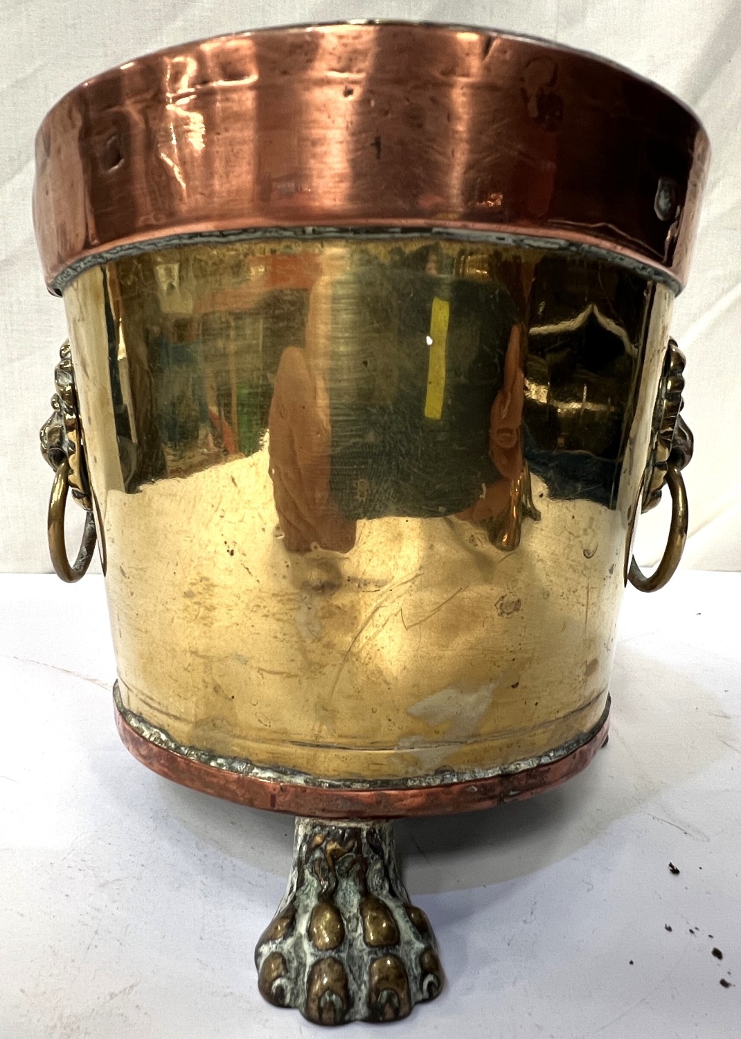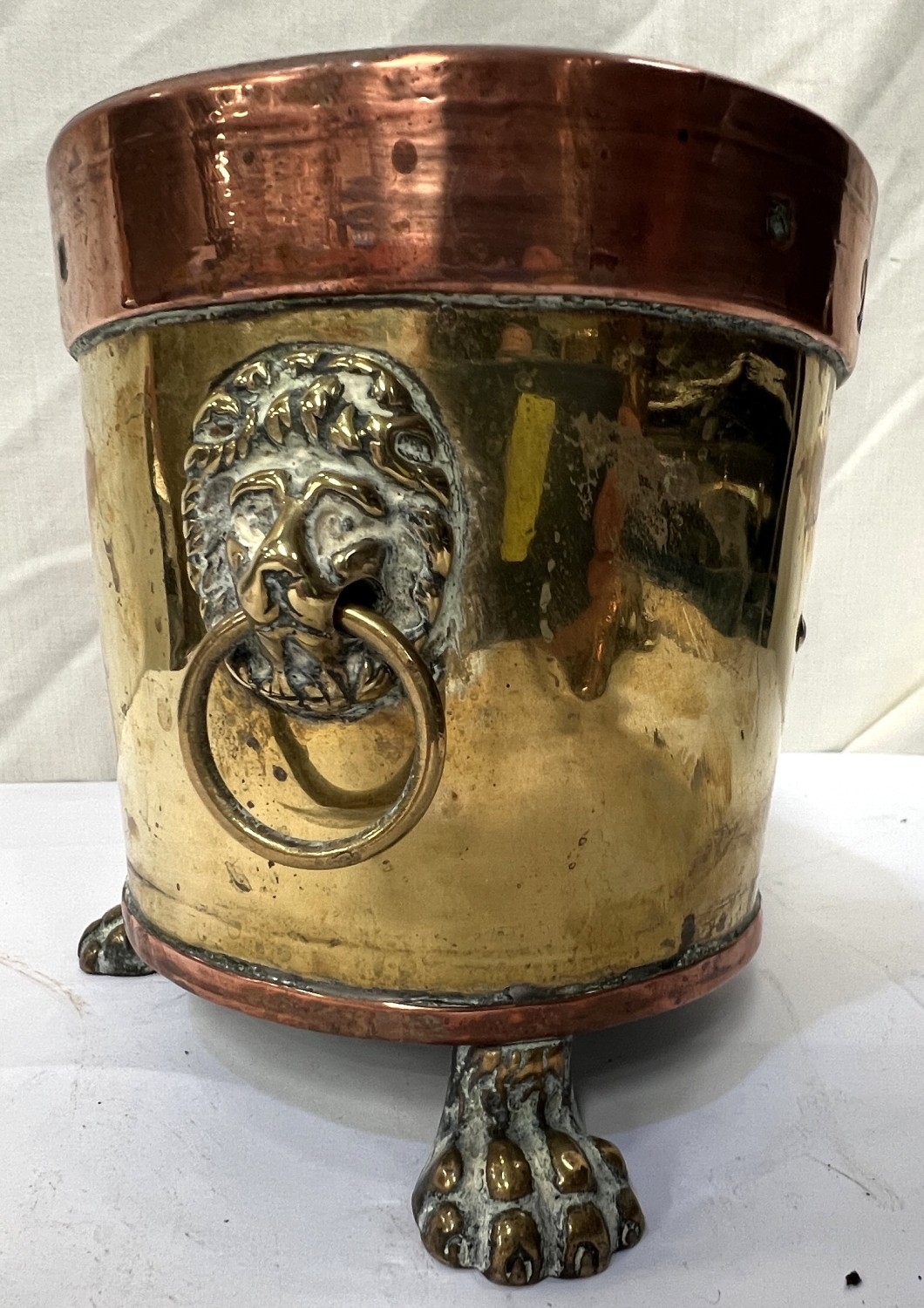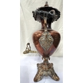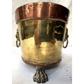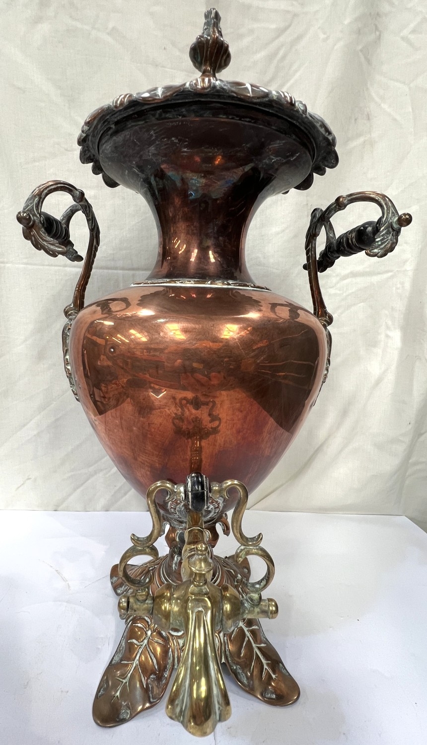 A large copper tea urn with floral and leaf decoration, ht. 57cm and a small copper and brass planter.