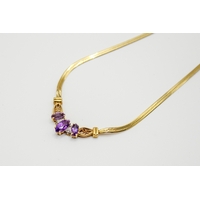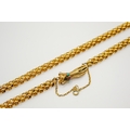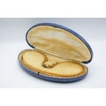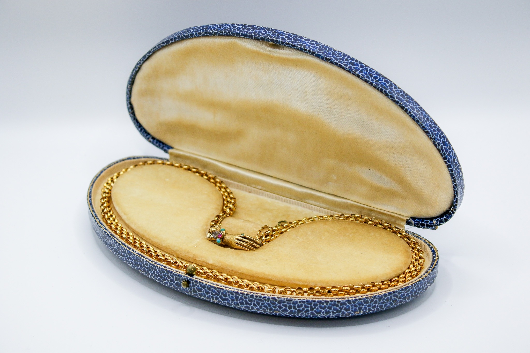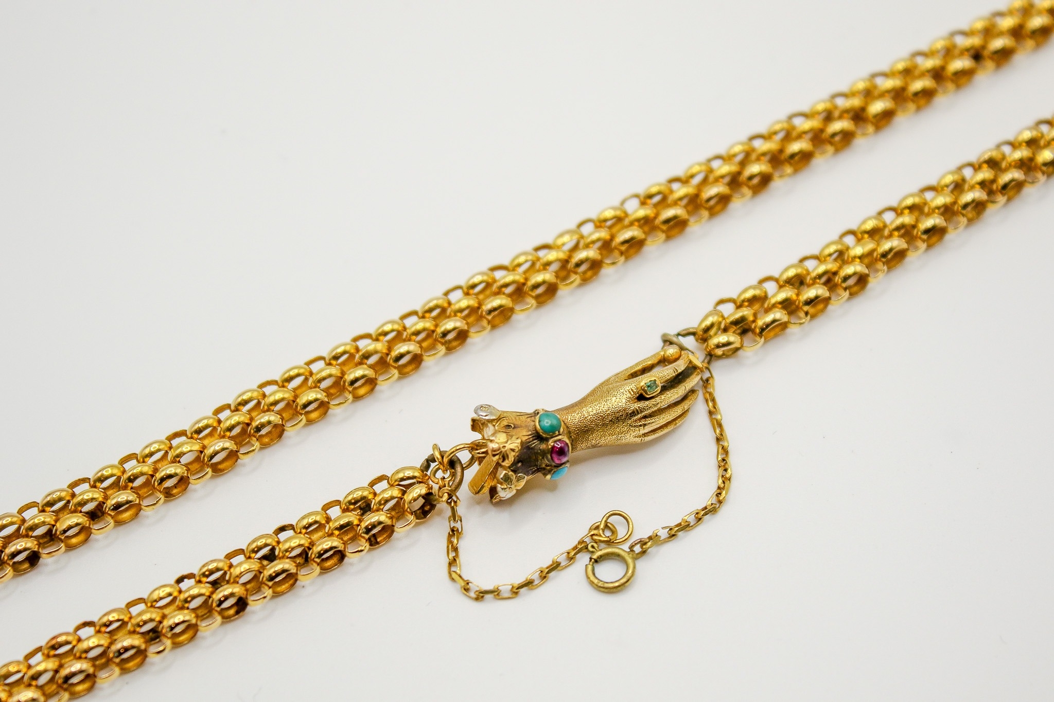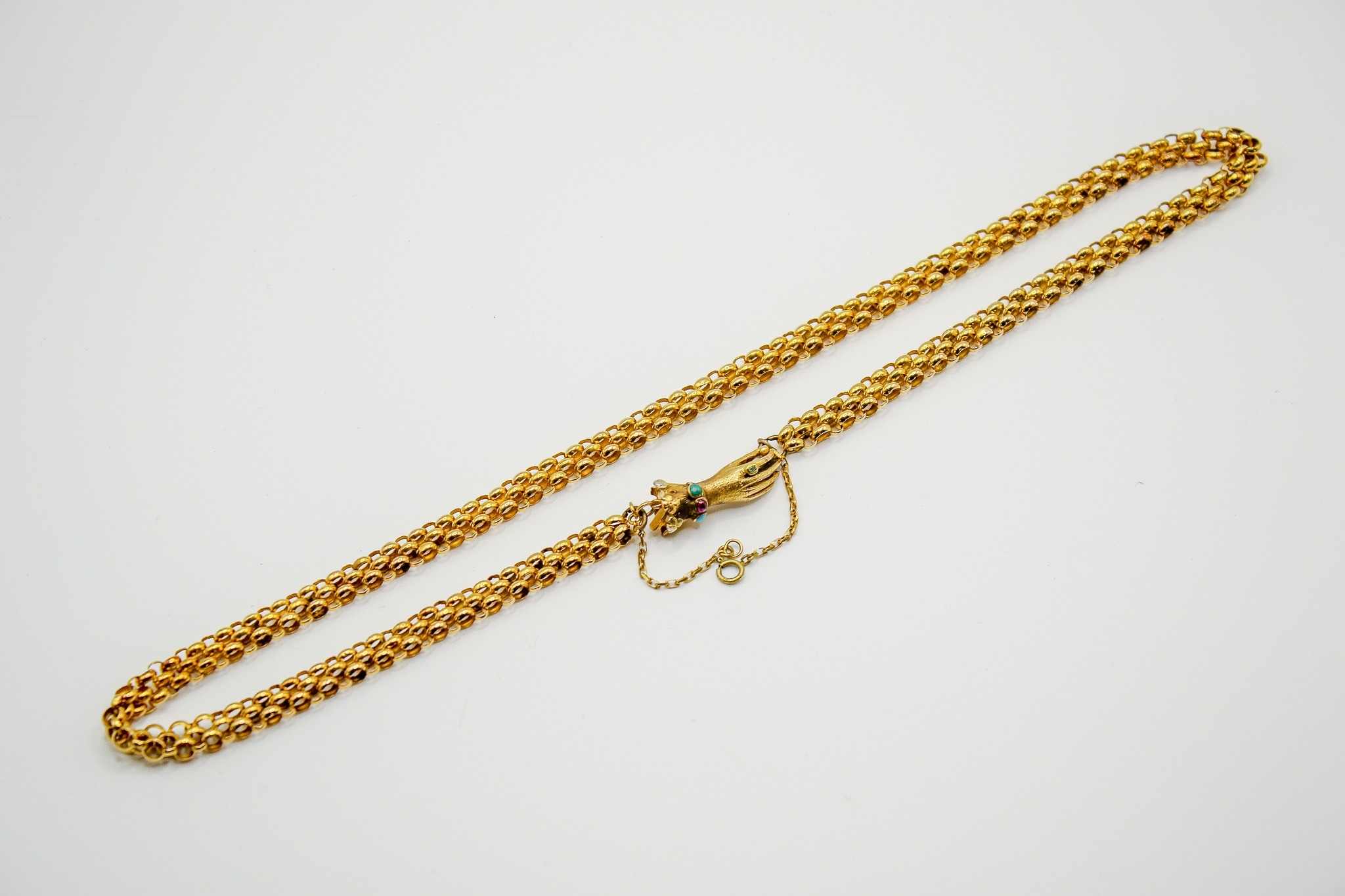 A yellow metal necklace with hand form clasp. Of triple cable link form, the clasp in the form of a lady's hand, (reinforced with white metal, unmarked, gold test inconclusive), set with blue and red cabochons, end link of security chain marked 9k, cable chain unmarked and tests at least 9ct. L49cm, gross weight 22.6g, in a fitted box.