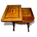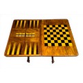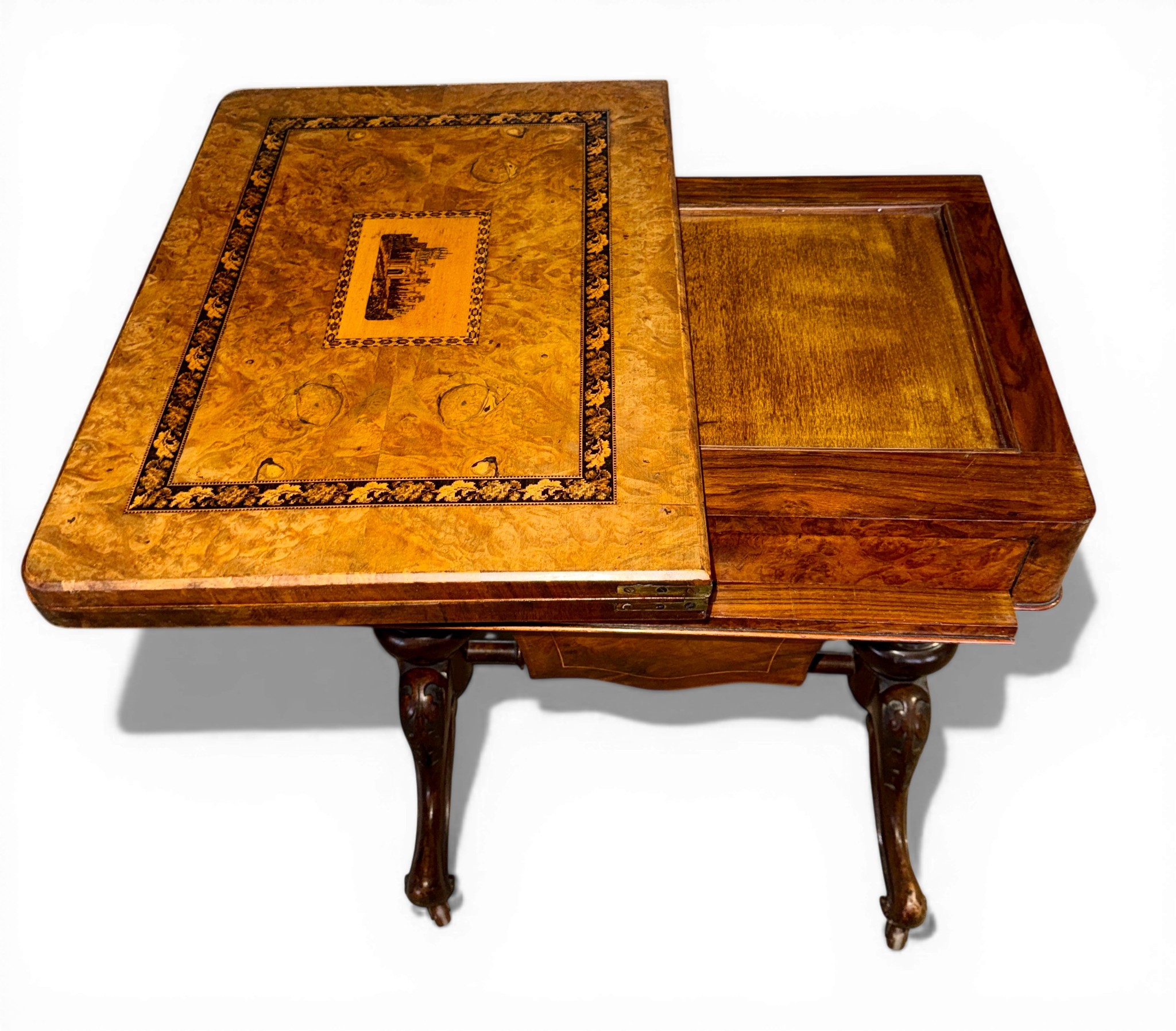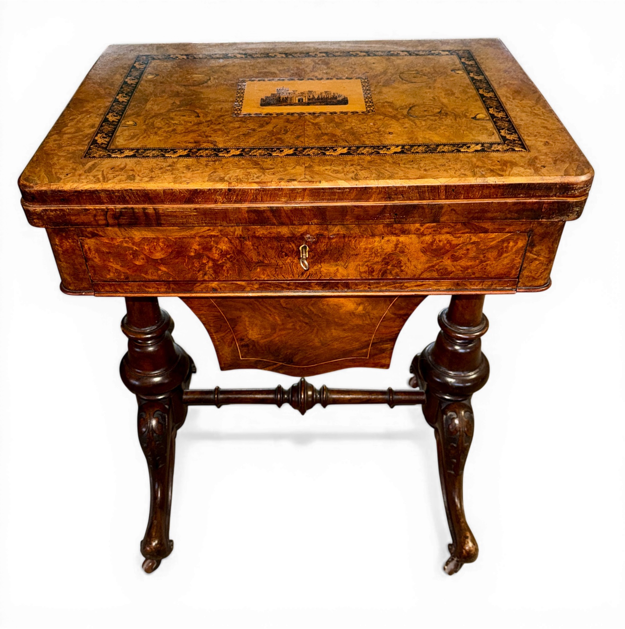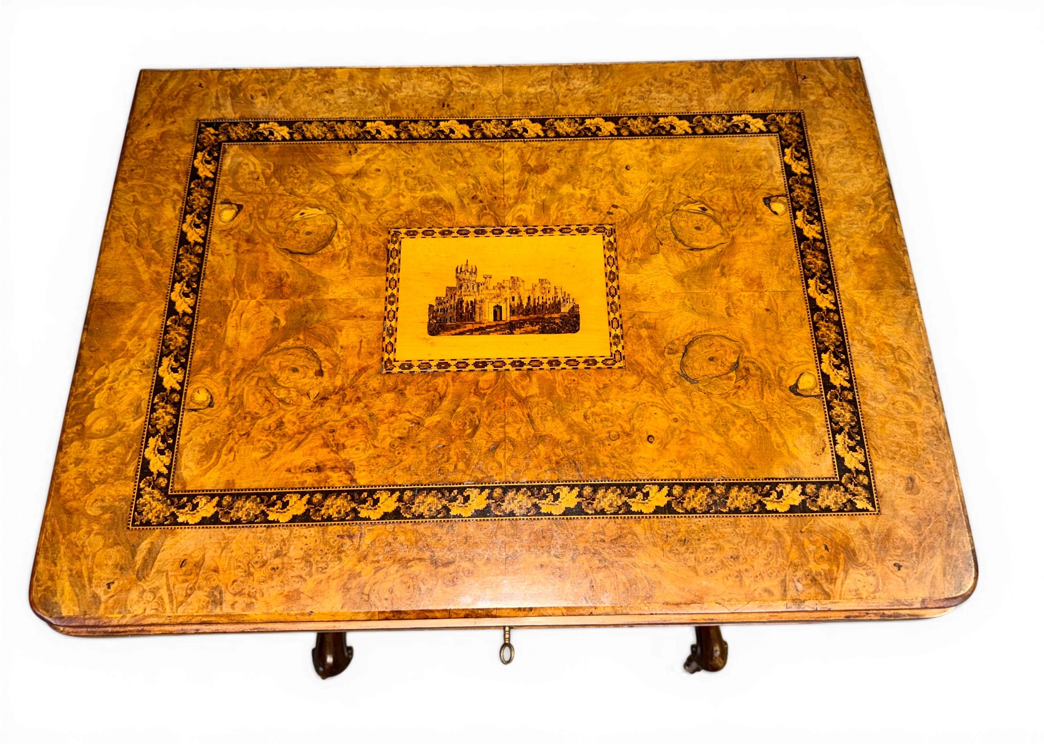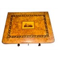 A nineteenth century Tunbridge ware inlaid games/work table, possibly depicting Eridge Castle. 59cm x 43cm x 73cm h.