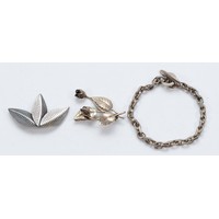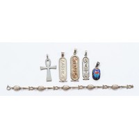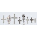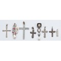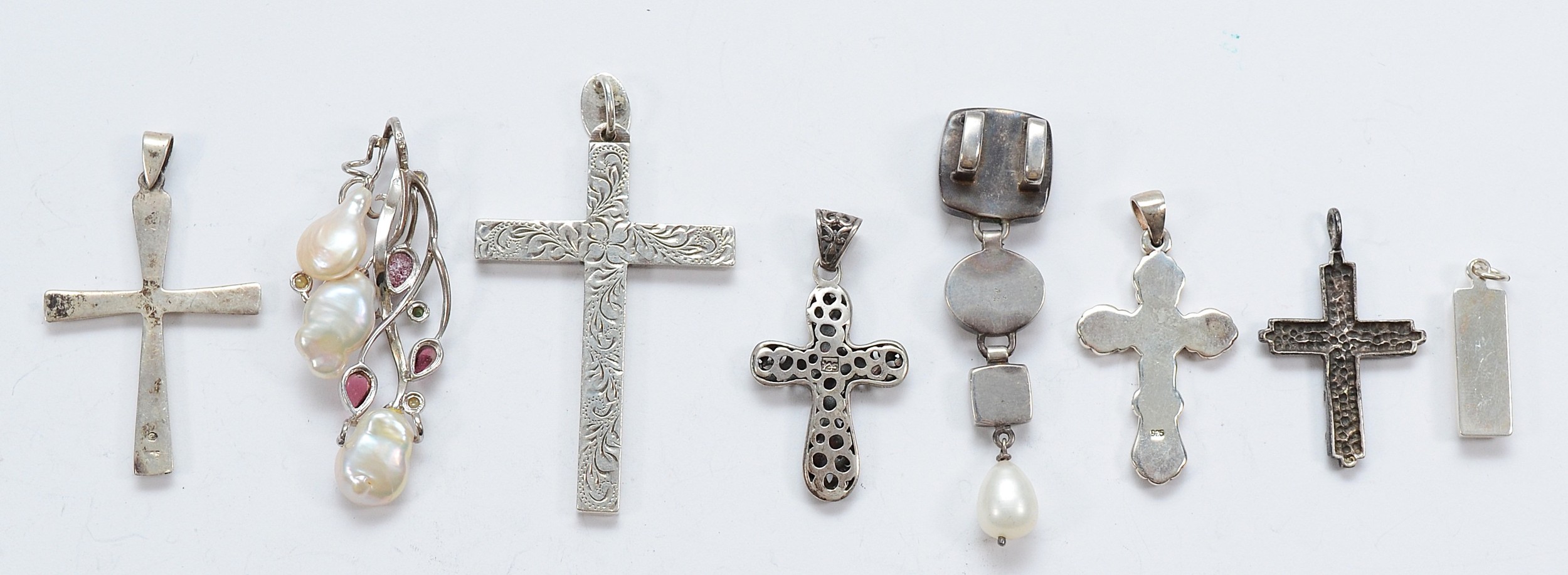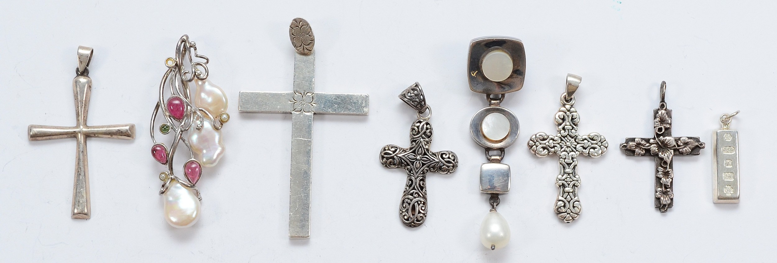 A silver ingot pendant, Sheffield 2000, a silver cross pendant, Birmingham 1976, with six 925 silver pendants, 62g