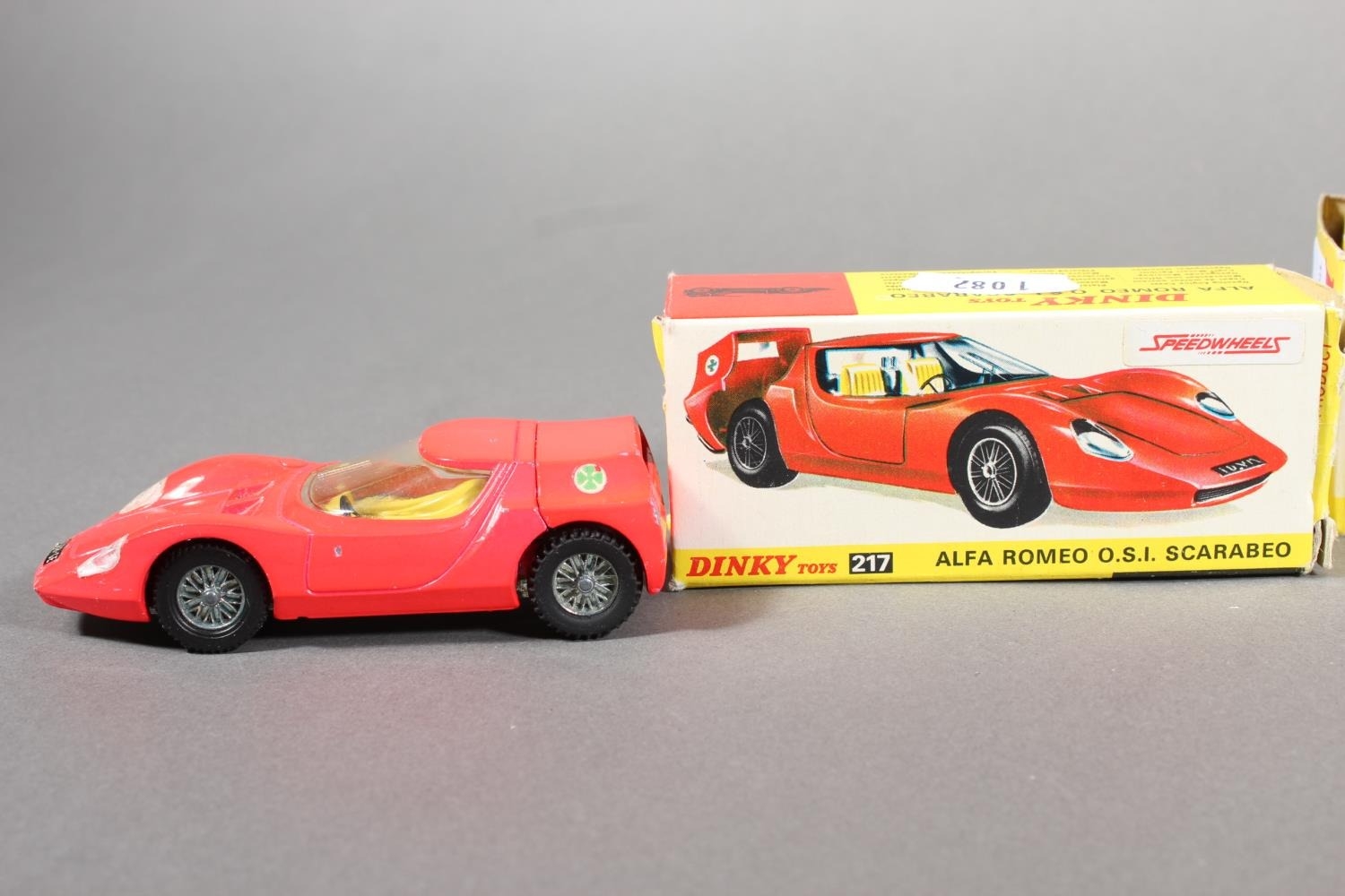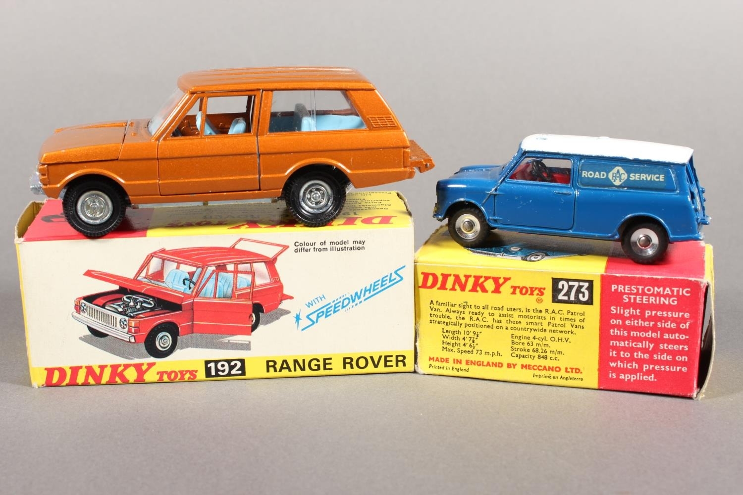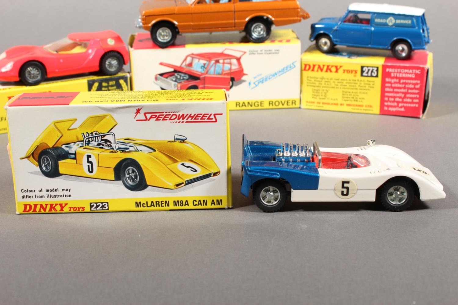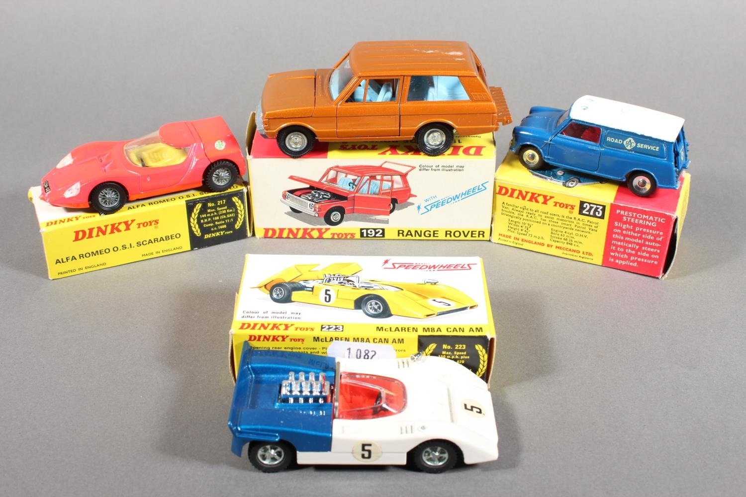 Dinky Toys diecast model vehicle 223 McLaren M8A Can Am, 192 Range Rover, 217 Alfa Romeo OSI Scarabeo and 273 RAC Patrol Mini Van, each boxed. (4)