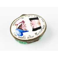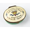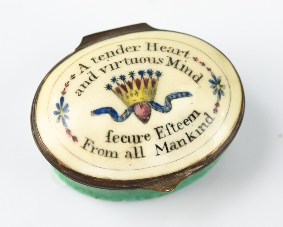 18TH CENTURY LARGE SIZE OVAL ENAMEL PATCH BOX painted with a crest featuring a gilt crown and inscribed with a sentiment "A tender Heart and Virtuous Mind - secure Esteem From all Mankind", mirror good, green base with hairline cracks, 2" wide (5.1cm)