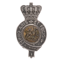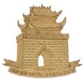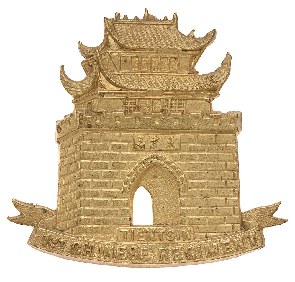 1st Chinese or Weihaiwei Regiment cap badge c. 1898-1906. Good scarce British made die-stamped brass representation of a city gate of Tiantsin on with tablet TIENTSIN resting on scroll 1ST CHINESE REGIMENT. Three Chinese characters over the gateway. Loops. VGC Formed in 1898 under the command of Lt. Col. Hamilton Bower. Members fought in Boxer Rebellion. Disbanded 1907.
