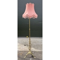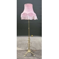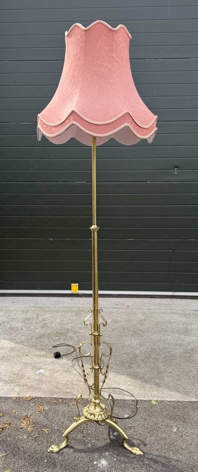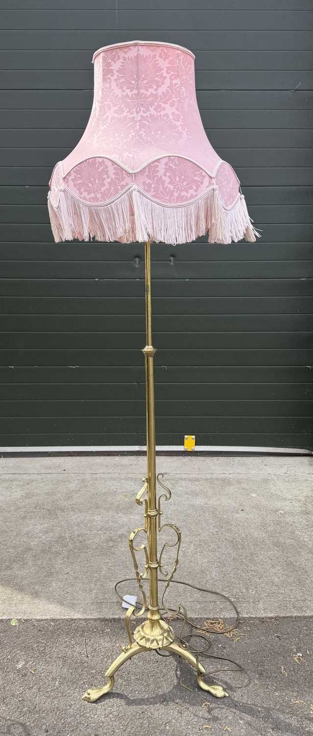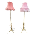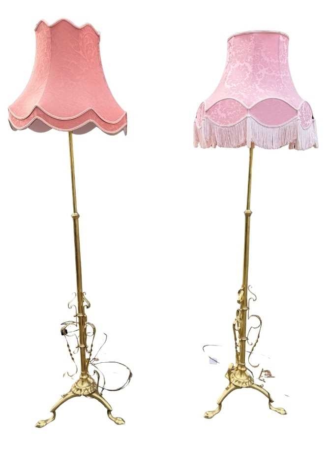 A pair of brass standard lamps in the art nouveau style, telescopic columns down to strapwork and wrought decoration with balls and onto three hoof-type feet, probably converted from oil lamps, one with a pink silk damask shade with fringe, the other a taupe cotton damask, fully extended height to fitting 167cm (2)