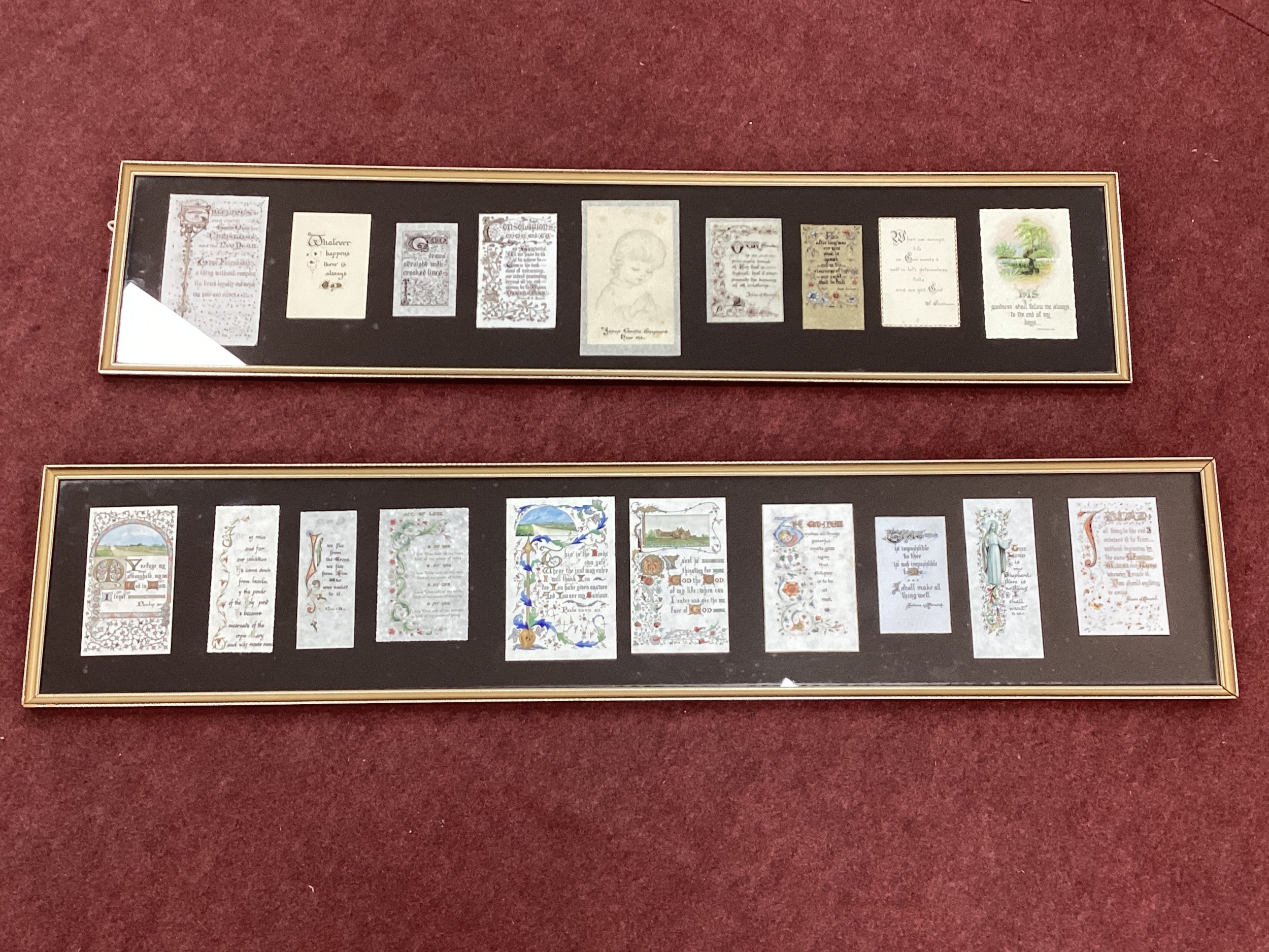 Two Framed Pictures, each containing elaborately decorated cards inscribed with religious verses or scriptures, 20 x 109cm and 20 x 99cm. (2)