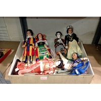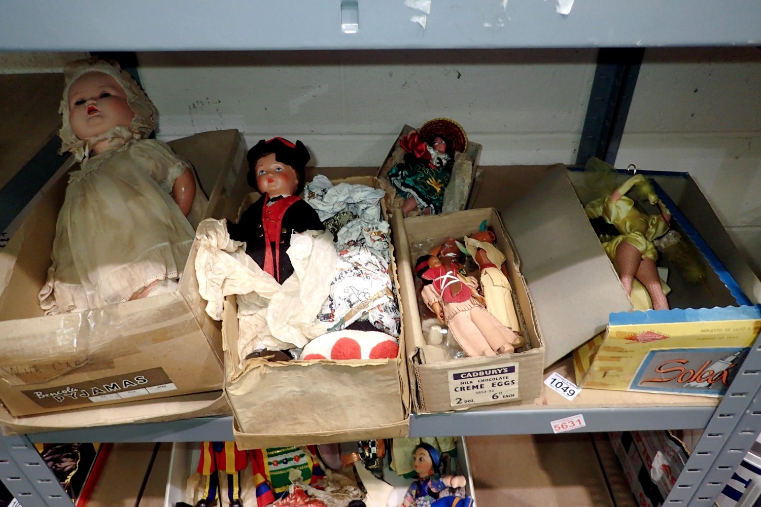 Shelf of mixed vintage dolls, some boxed. Not available for in-house P&P