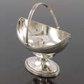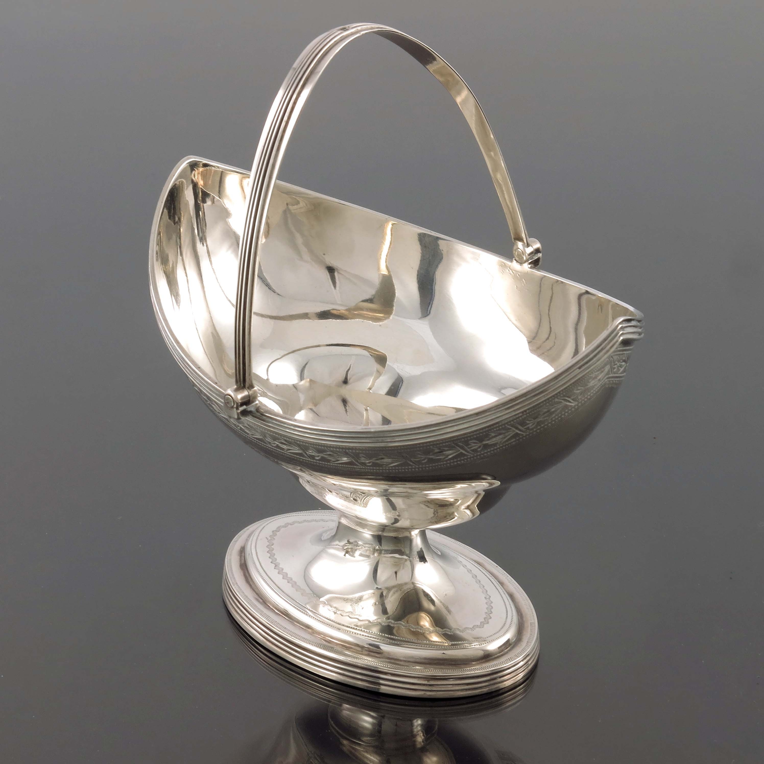 A George III silver sugar basket, Peter and Ann Bateman, London 1792, pedestal ogee boat form, on oval foot, bright cut engraved with foliate ribbon bands and vacant cartouches, reeded swing handle, 15cm high, 4.76ozt