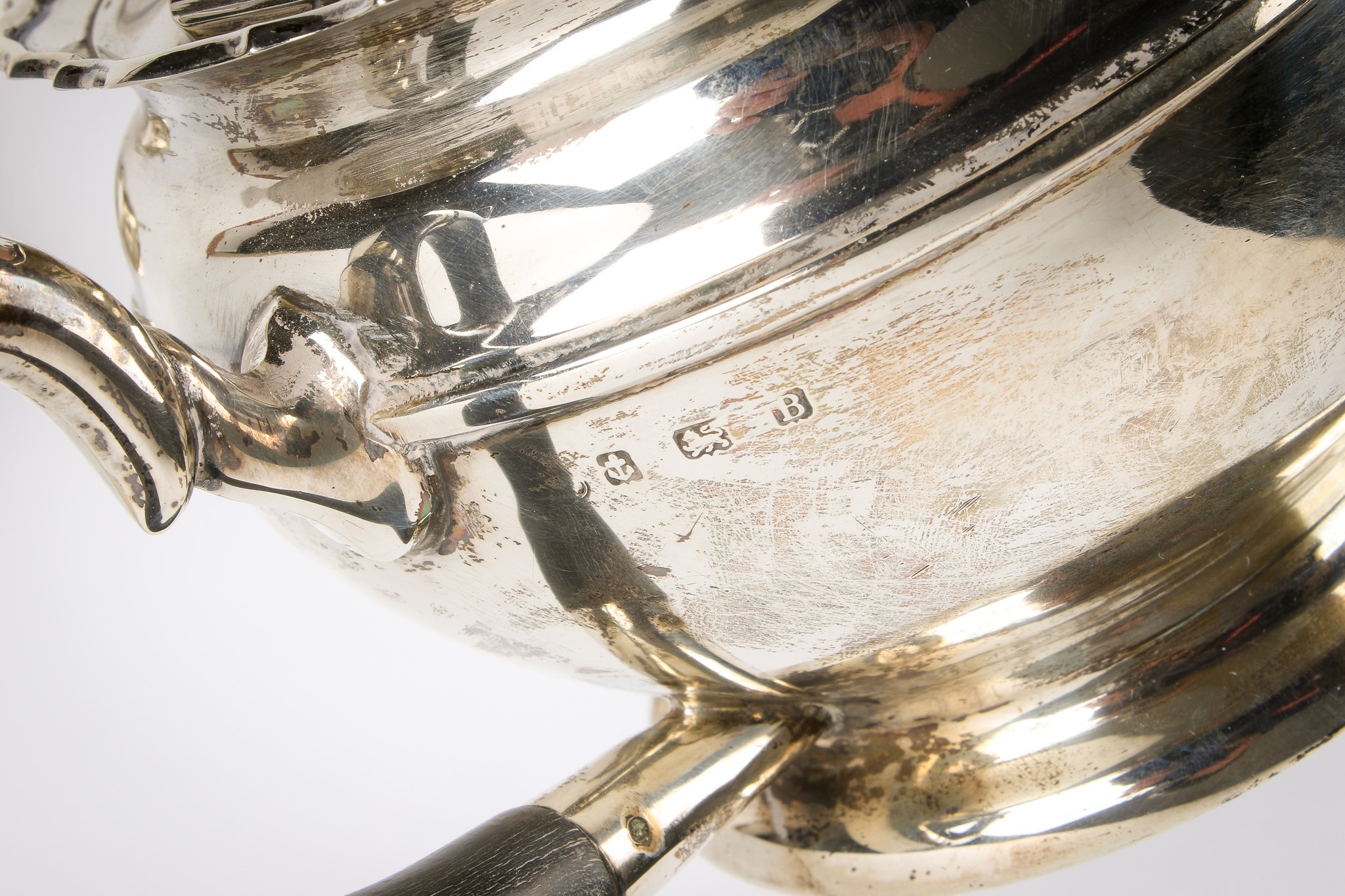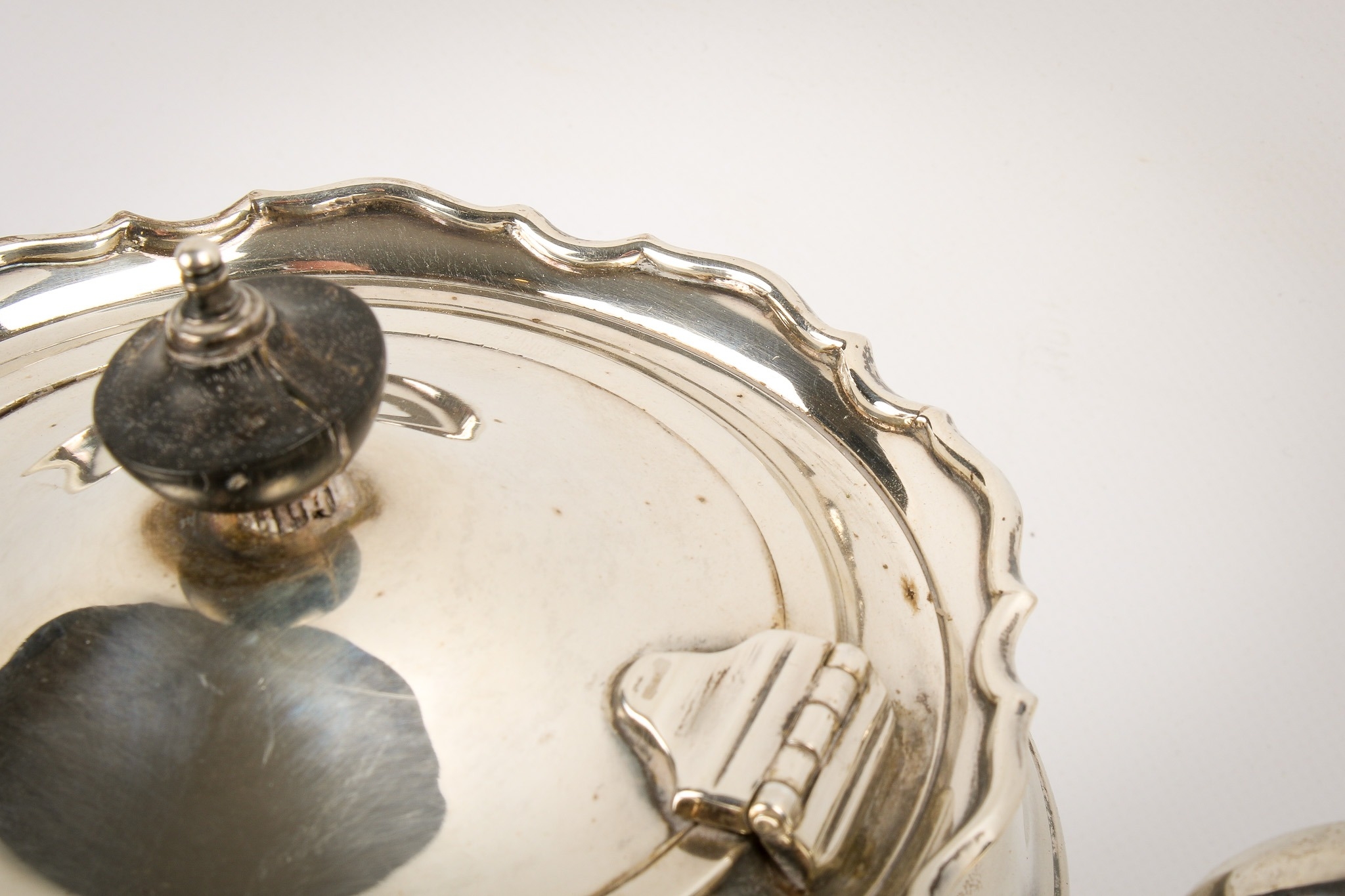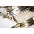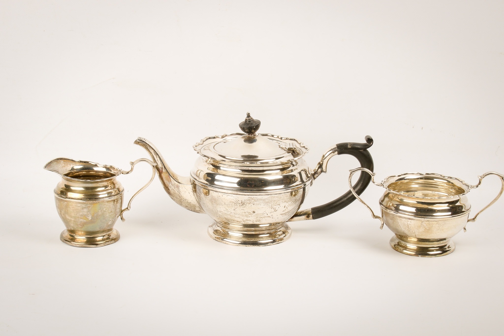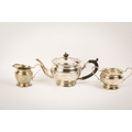 An early 20th century silver teapot, sugar bowl and cream jug set. With fluted rim over a ribbed body and spread foot, hallmarks for Birmingham 1926, maker's mark rubbed. Height of teapot with finial 13.5cm, total gross weight 604.1g.