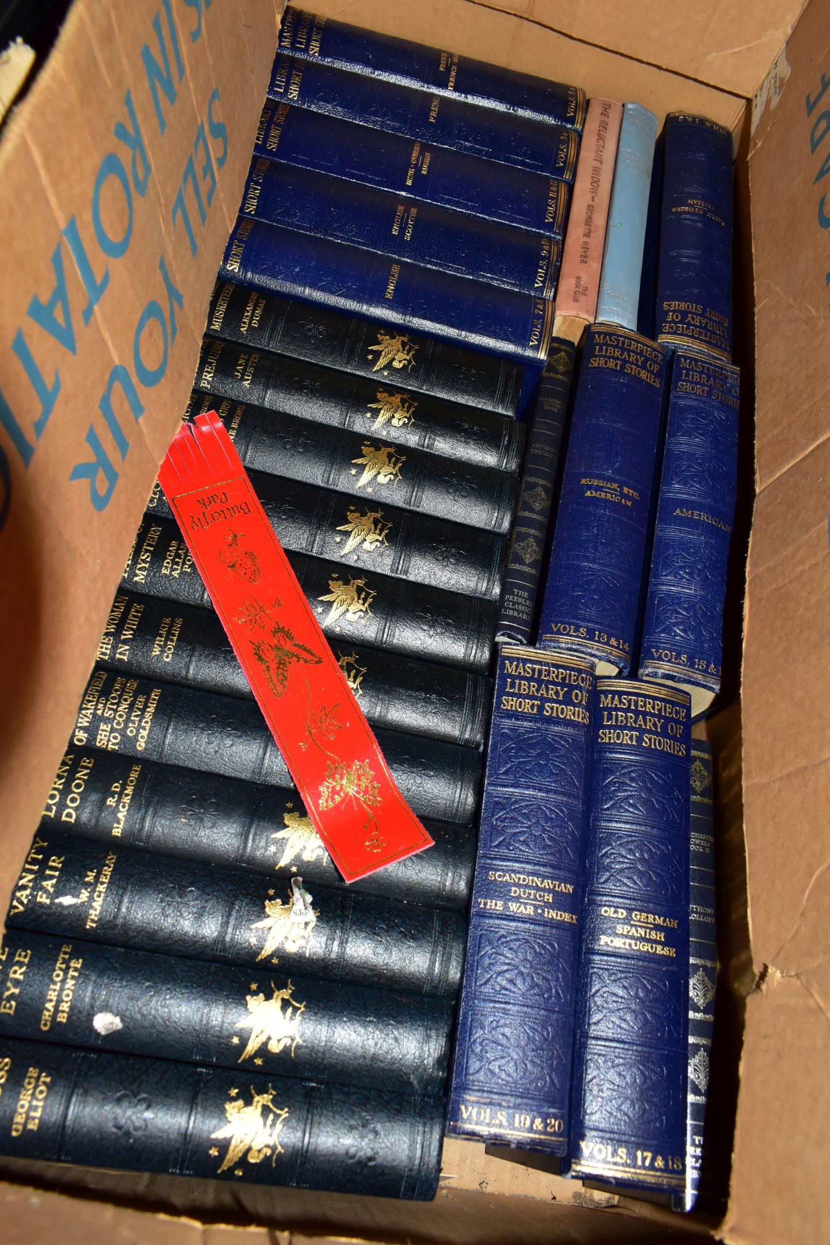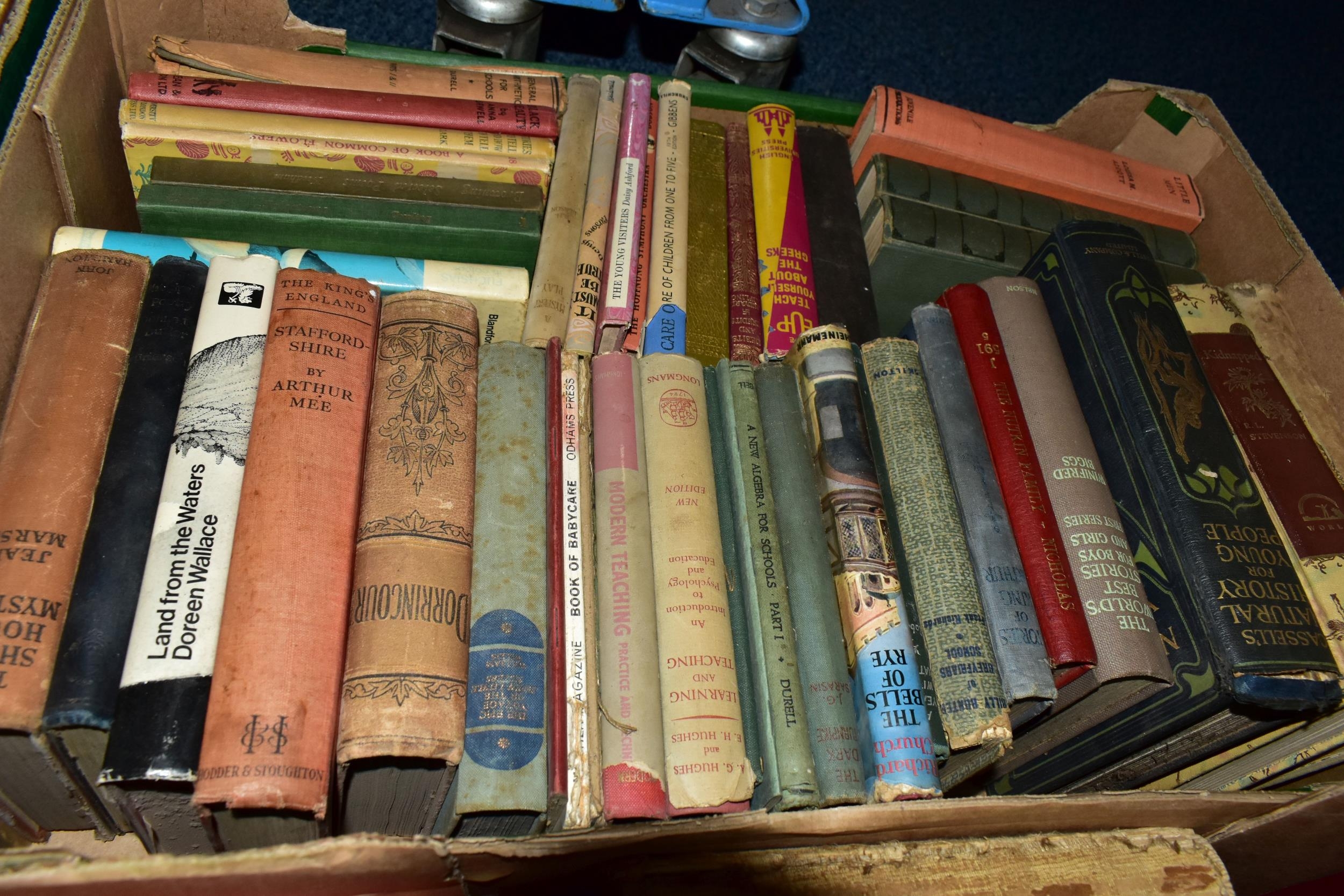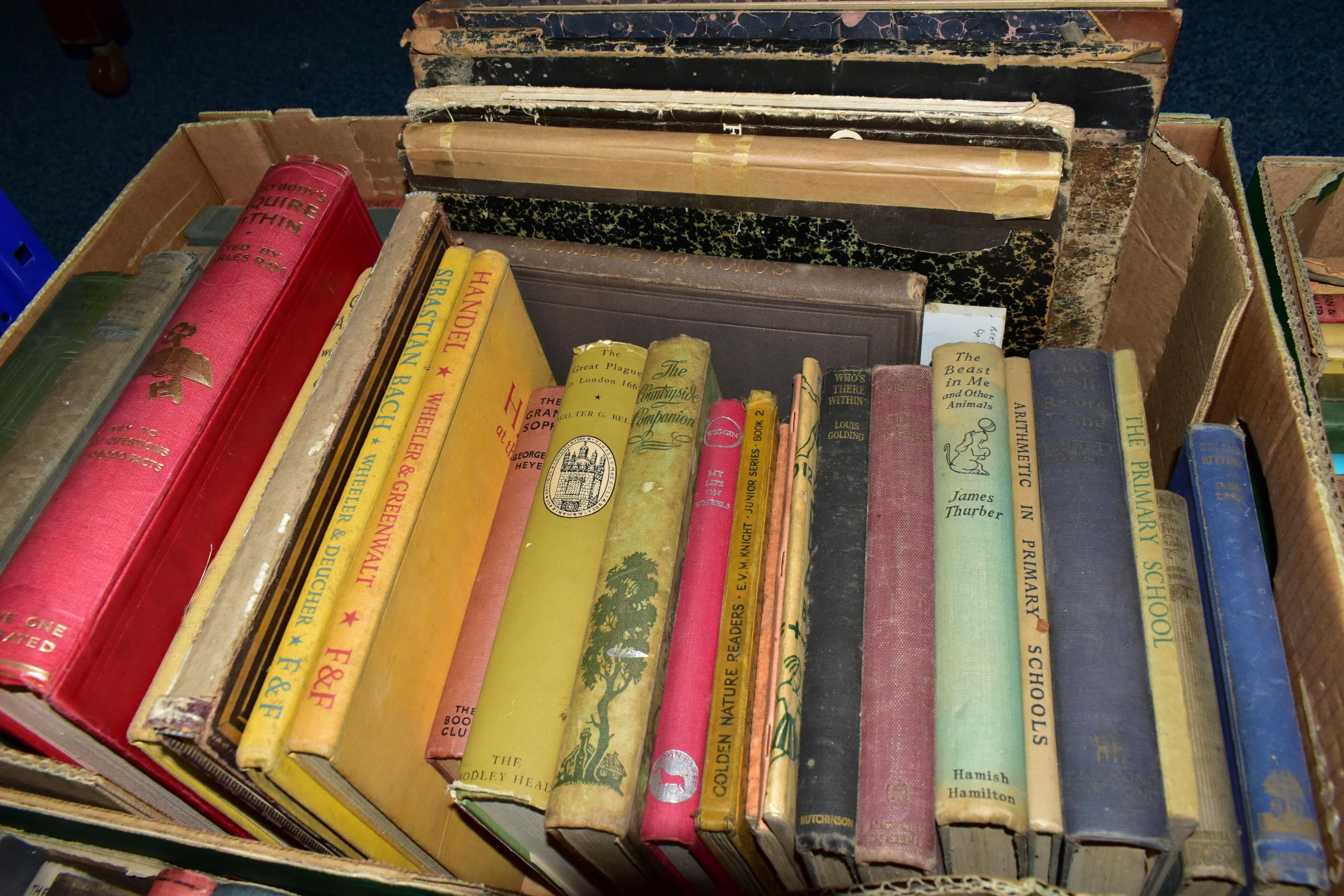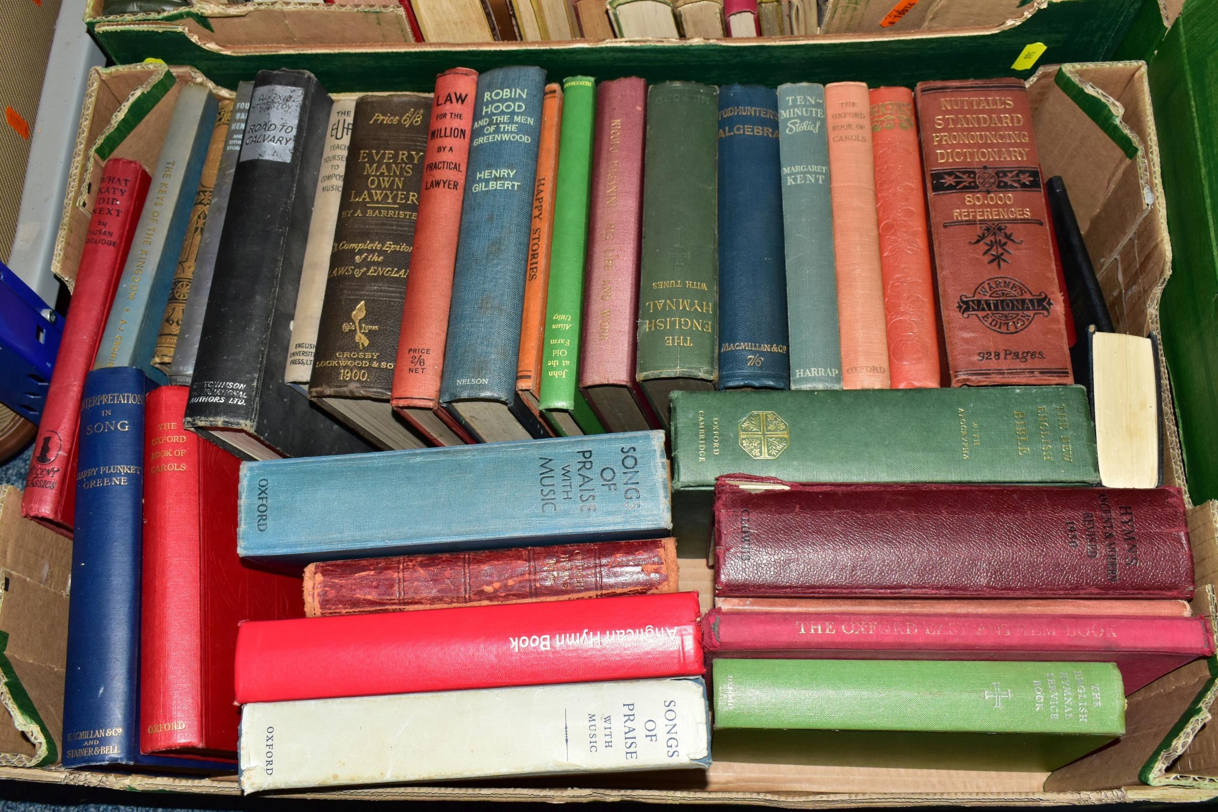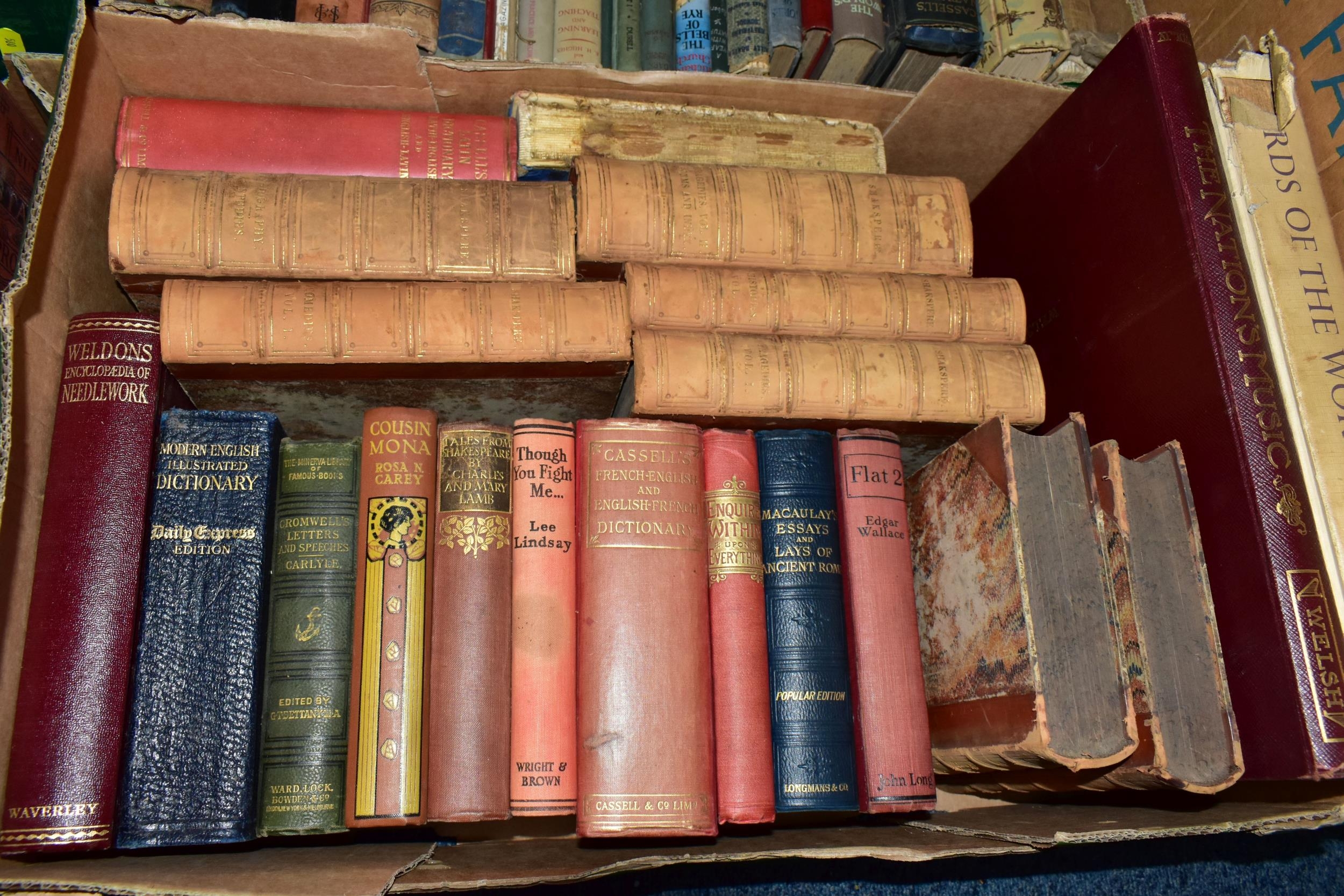 FIVE BOXES OF BOOKS containing approximately 135 older or antiquarian book titles in hardback format, subjects include encyclopaedic and lexical works, music scores, education, business, natural history and contemporary and classical fiction including classics from The Daily Express Publications 1933, Masterpiece Library of Short Stories from The Educational Book Co. Ltd, eight volumes of The Comedies, Histories, Tragedies and Poems of William Shakespeare, edited and published by Charles Knight, 1851,1852 and Studies & Illustrations of the Writings of Shakespeare, published by Charles Knight, 1850 (5 boxes)