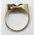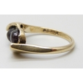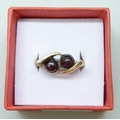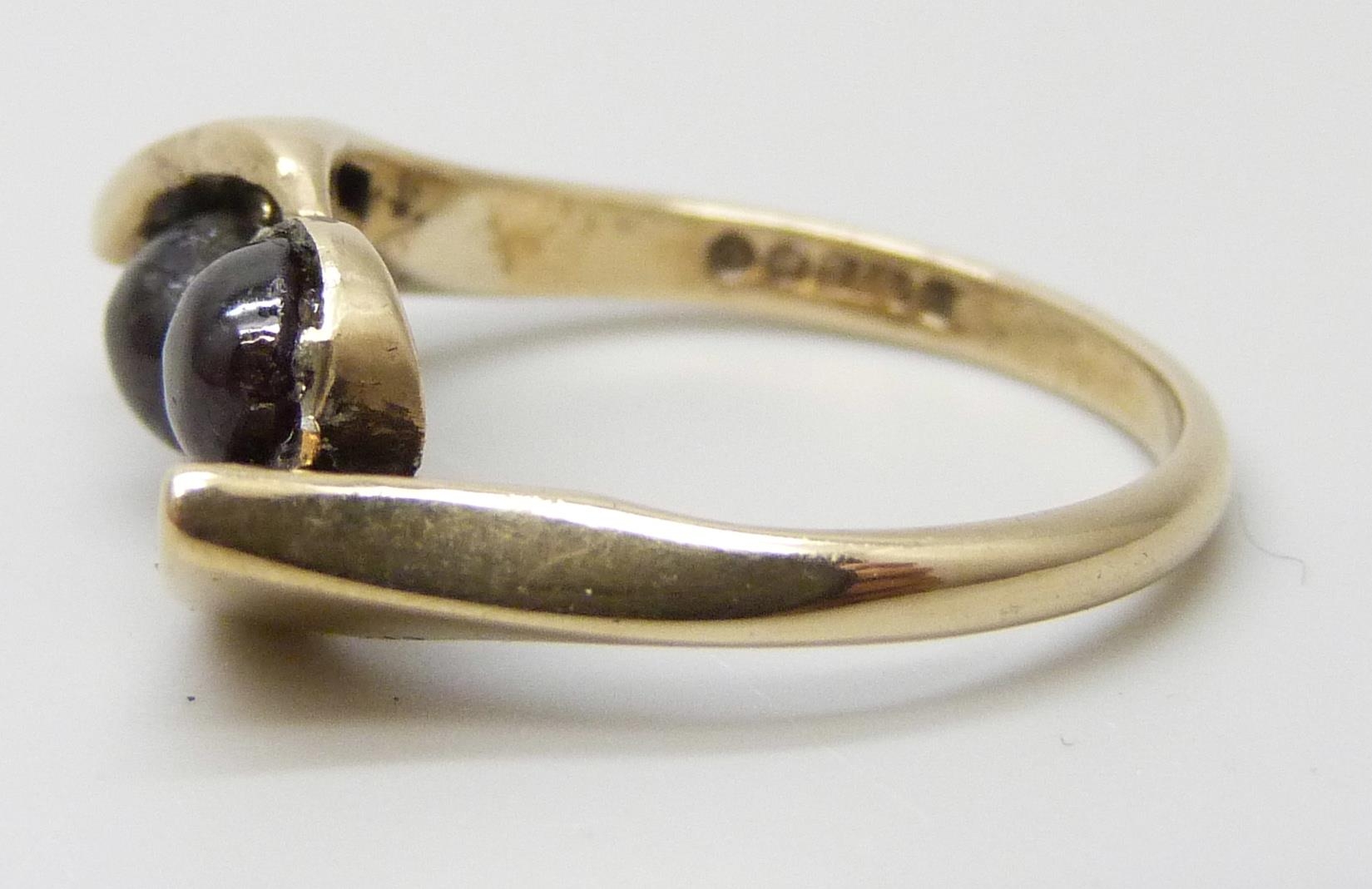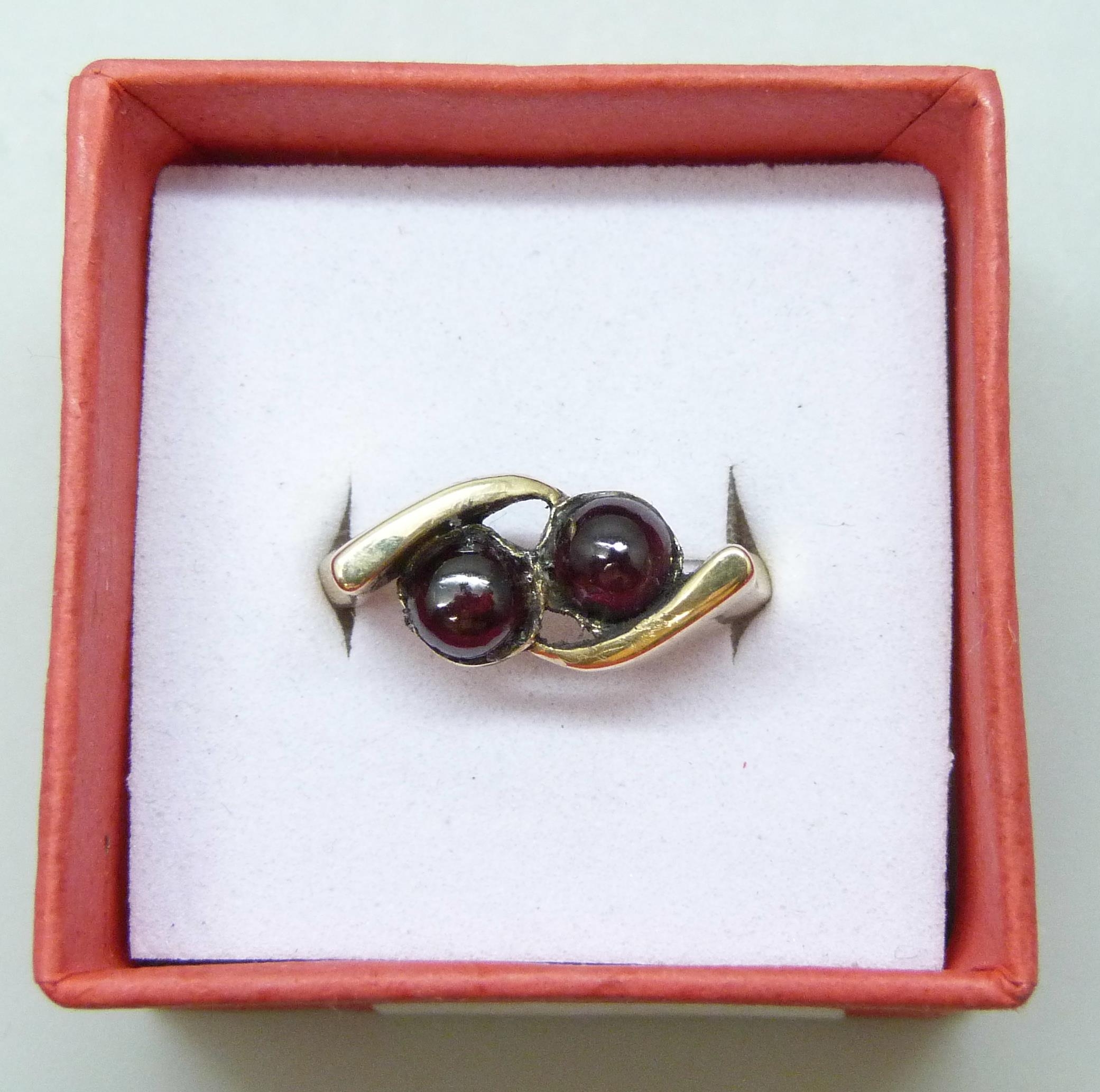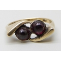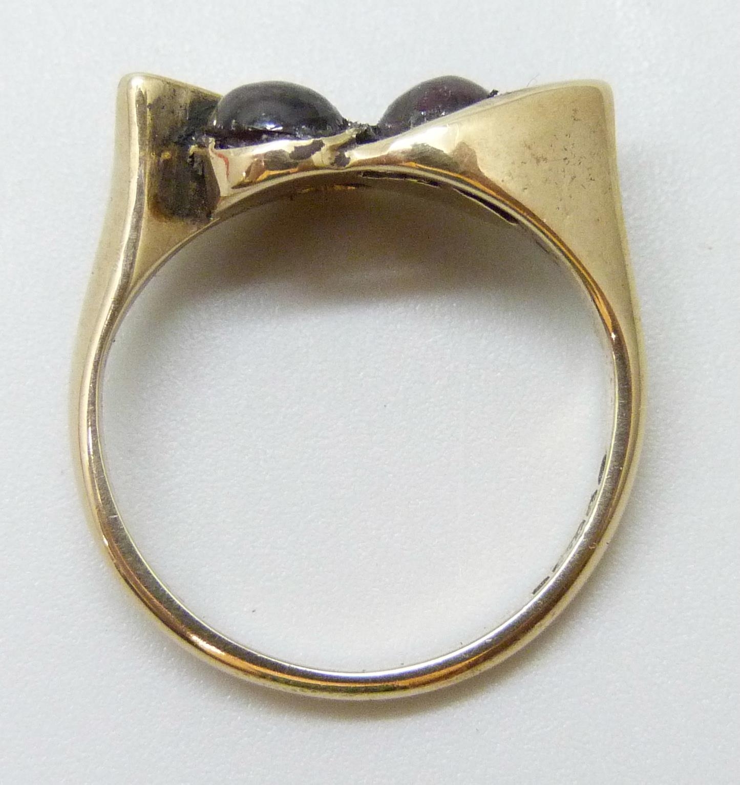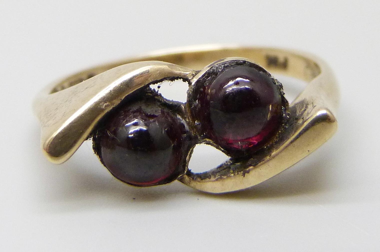 A 9ct yellow gold ring set with two garnet cabochons, 3.3g, L